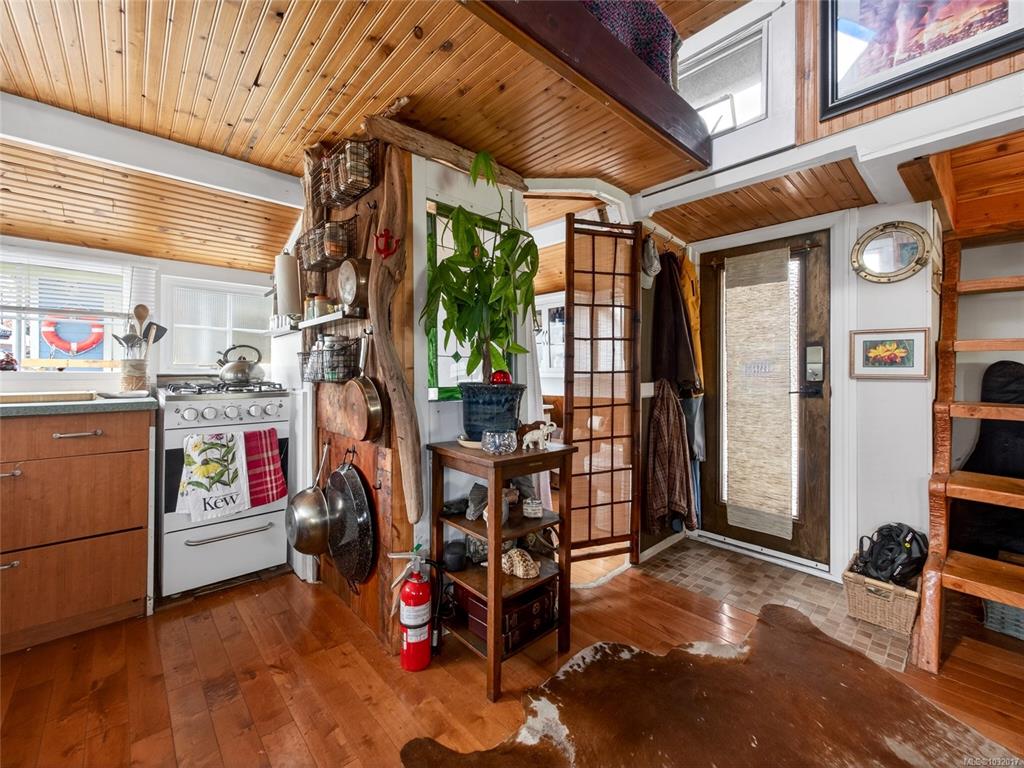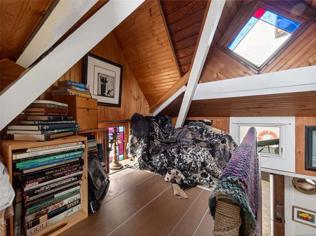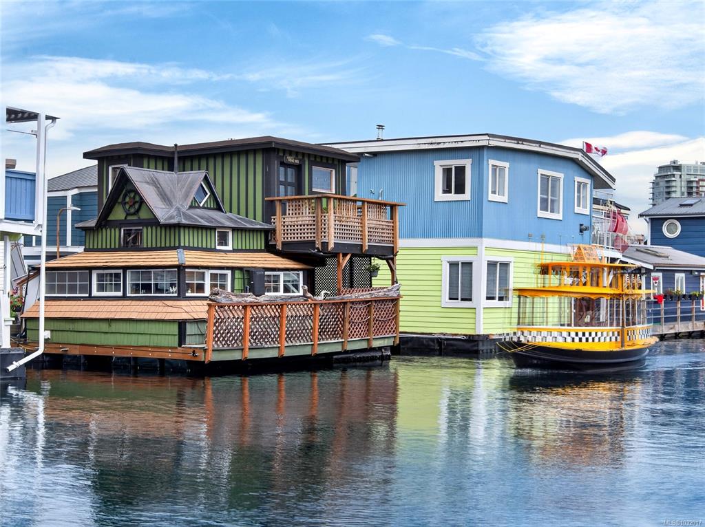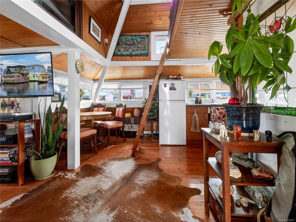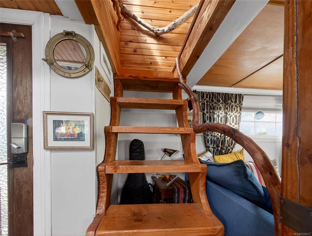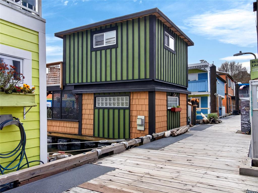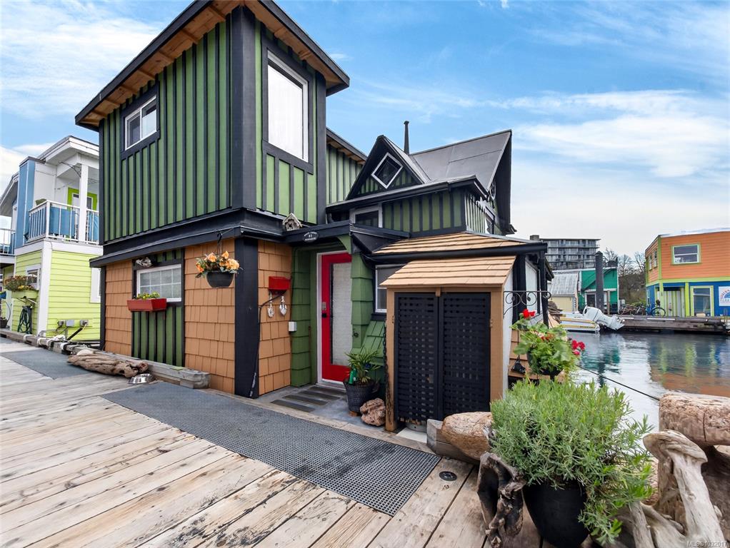 Zigguratus "Ziggy"— Fisherman's Wharf's most iconic float home. Copper roof & cedar shingles patina beautifully in the coastal air. 2 levels: open main floor with full kitchen, dining area & living room with wrap-around windows & French doors to a deck/kayak launch platform. A separate loft from the main floor for reading and/or storage. Updated 4-pc bath (tub, new macerating toilet 2026, updated plumbing 2022/23). Loft leads to 2rd-floor bedroom w/ private balcony. Propane on-demand HW, WETT fireplace, 30A...