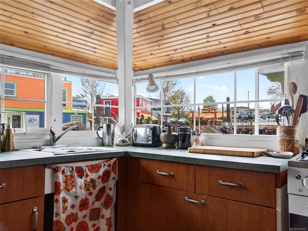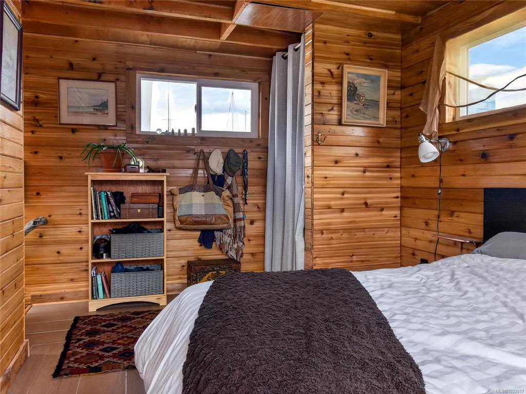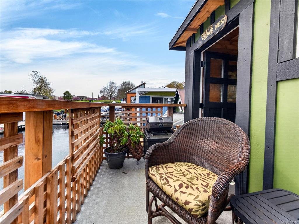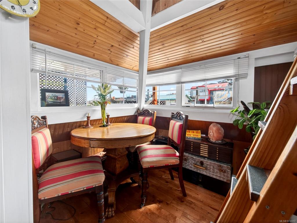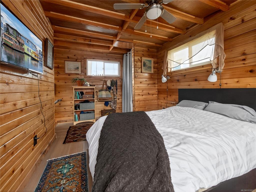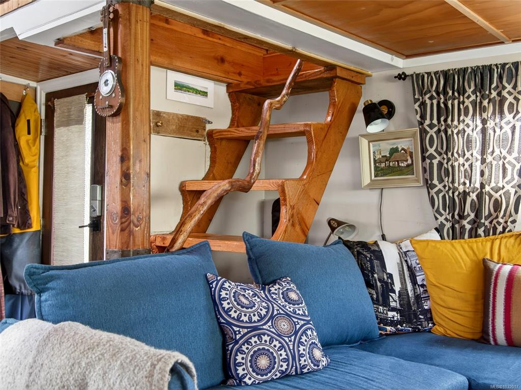Zigguratus "Ziggy"— Fisherman's Wharf's most iconic float home. Copper roof & cedar shingles patina beautifully in the coastal air. 2 levels: open main floor with full kitchen, dining area & living room with wrap-around windows & French doors to a deck/kayak launch platform. A separate loft from the main floor for reading and/or storage. Updated 4-pc bath (tub, new macerating toilet 2026, updated plumbing 2022/23). Loft leads to 2rd-floor bedroom w/ private balcony. Propane on-demand HW, WETT fireplace, 30A...