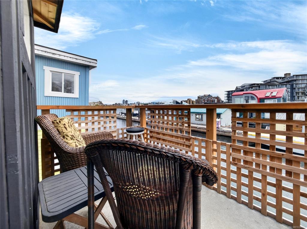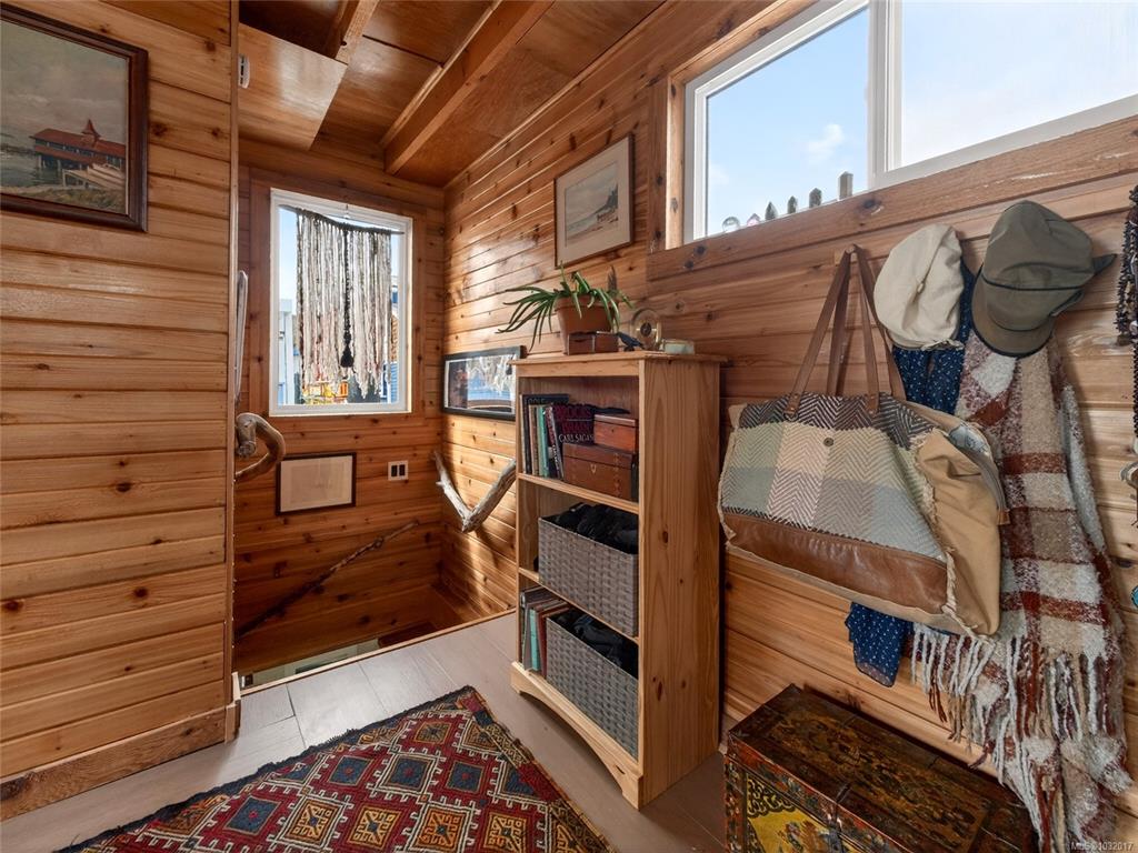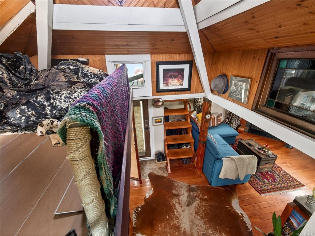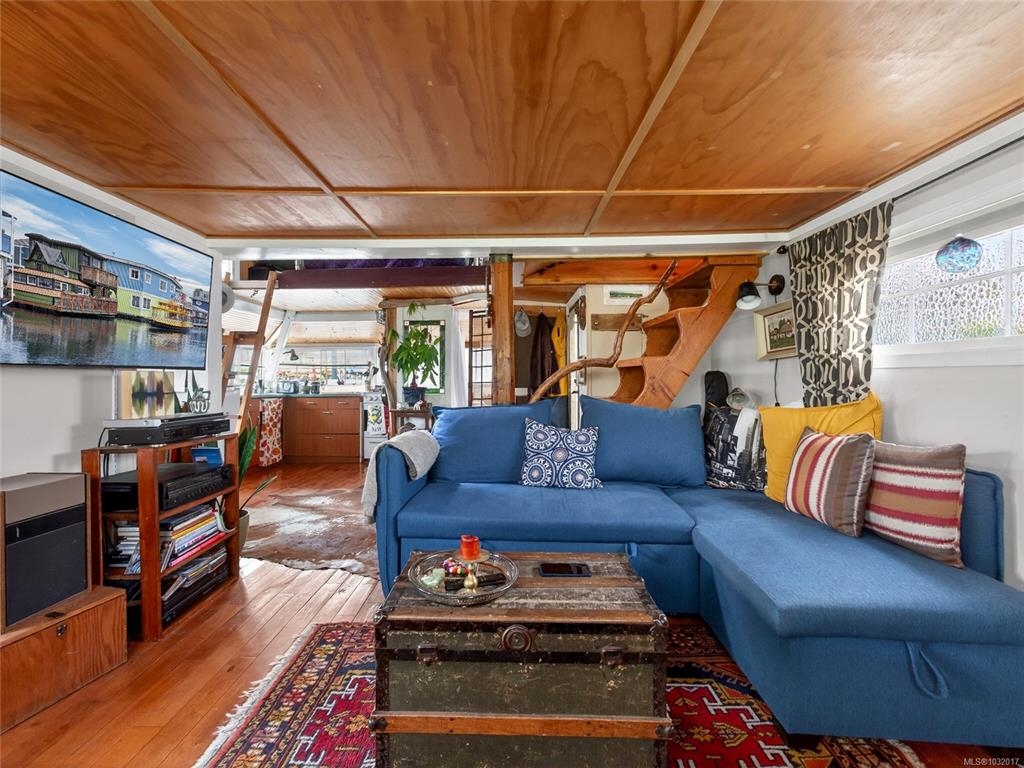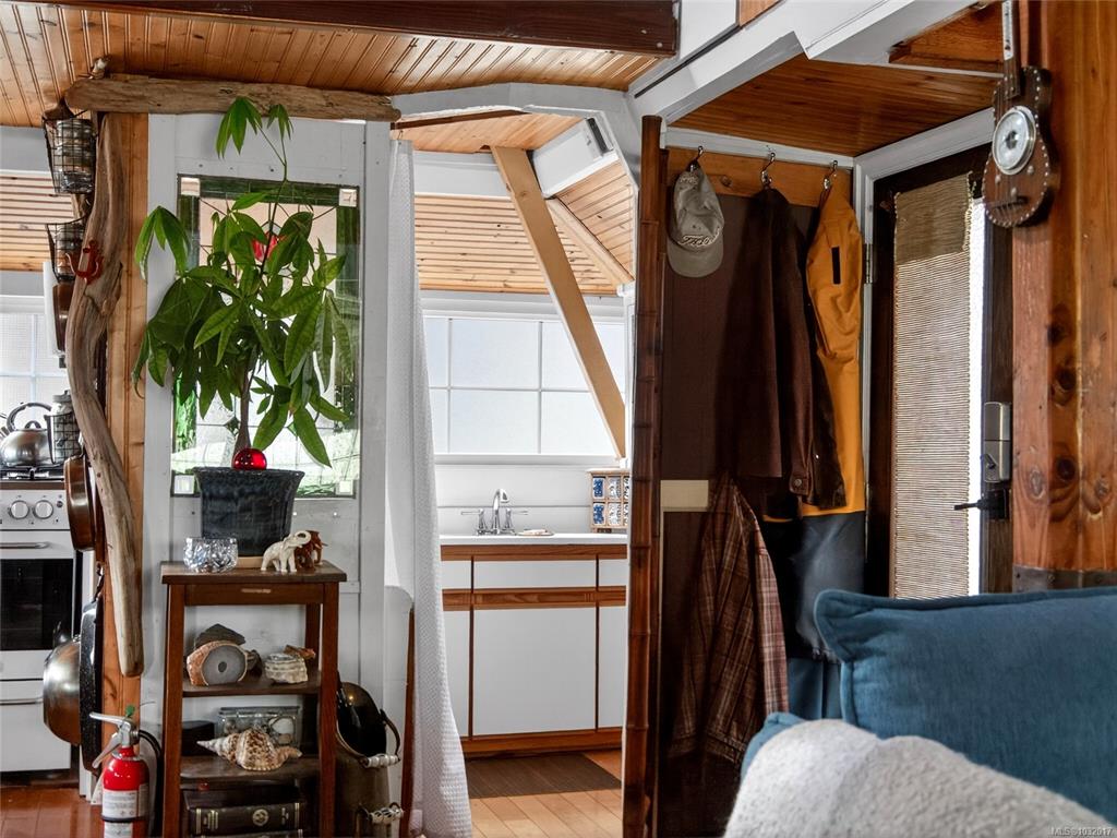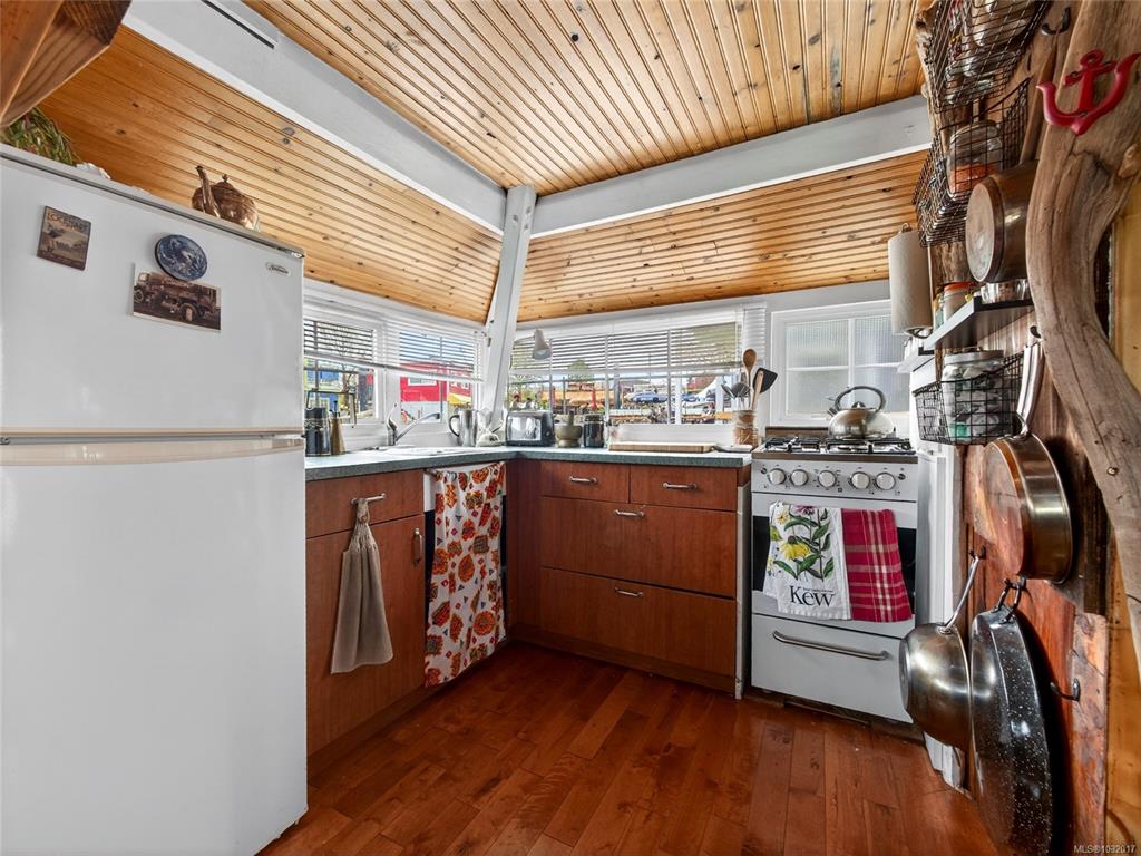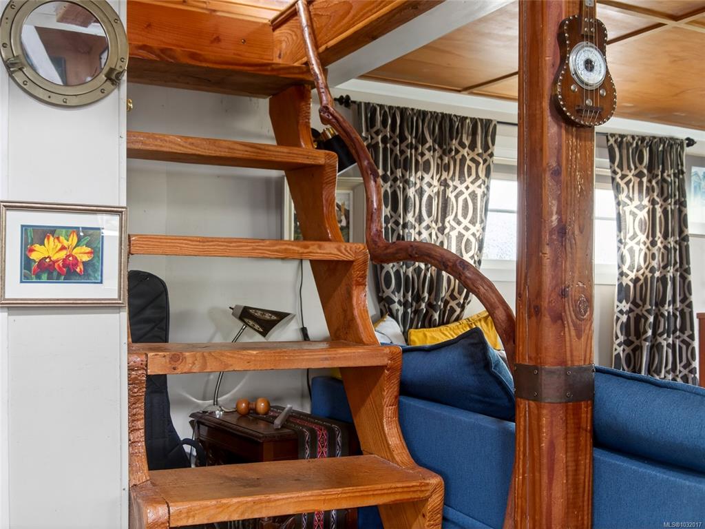 Zigguratus "Ziggy"— Fisherman's Wharf's most iconic float home. Copper roof & cedar shingles patina beautifully in the coastal air. 2 levels: open main floor with full kitchen, dining area & living room with wrap-around windows & French doors to a deck/kayak launch platform. A separate loft from the main floor for reading and/or storage. Updated 4-pc bath (tub, new macerating toilet 2026, updated plumbing 2022/23). Loft leads to 2rd-floor bedroom w/ private balcony. Propane on-demand HW, WETT fireplace, 30A...