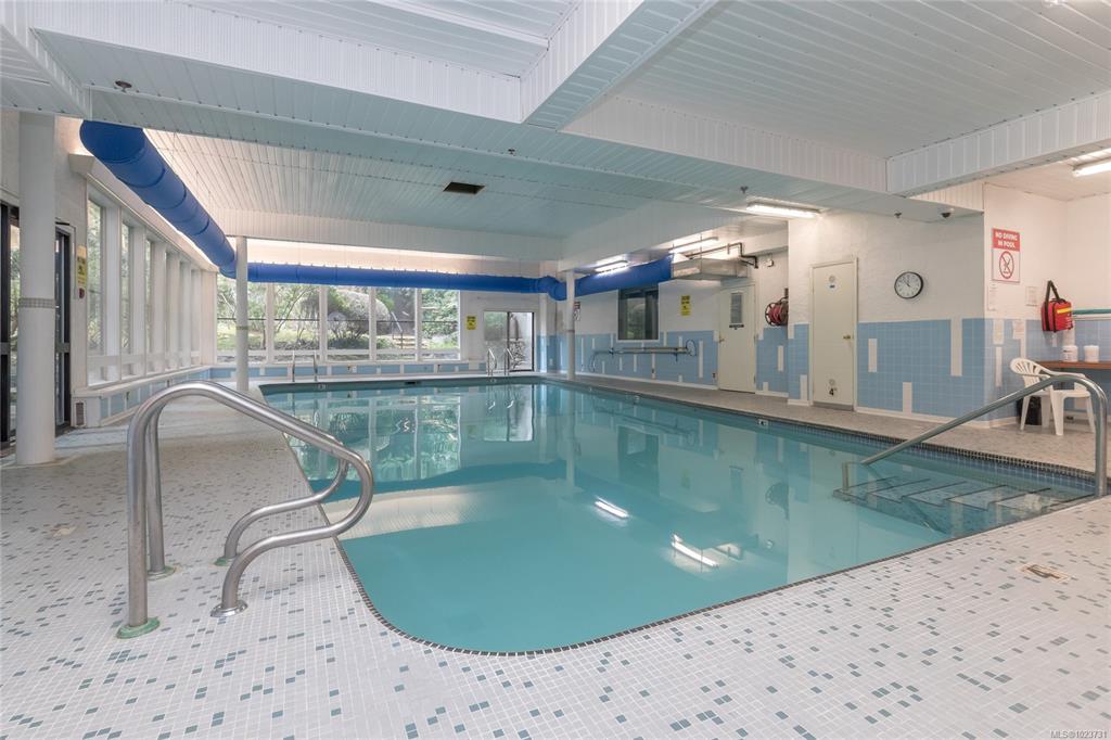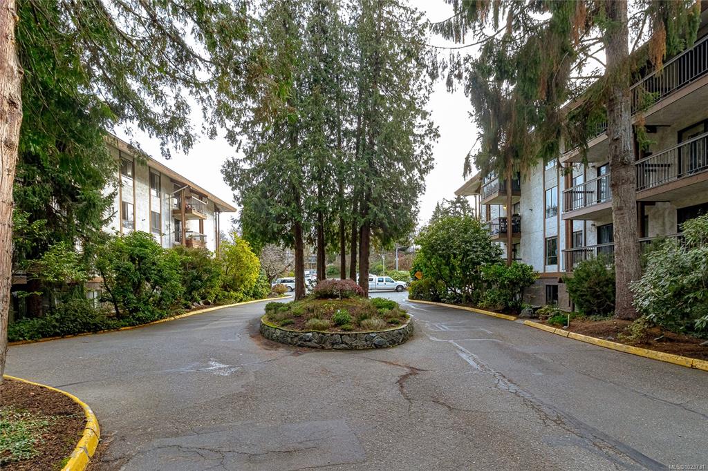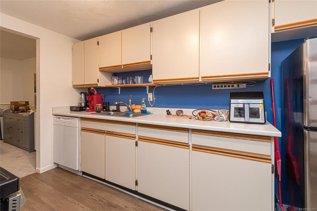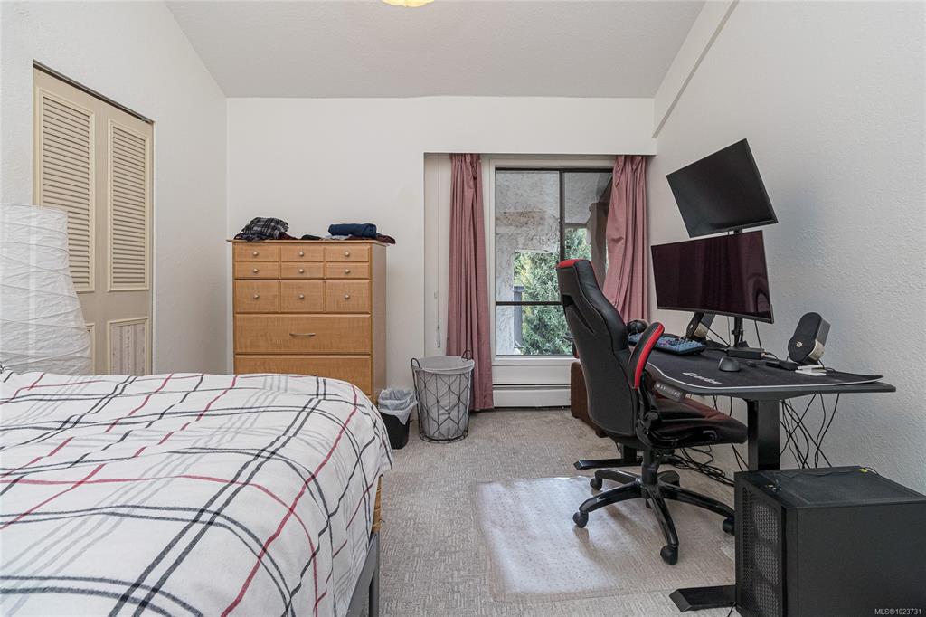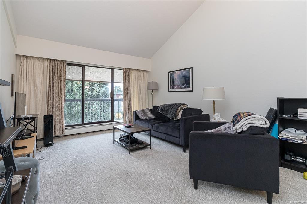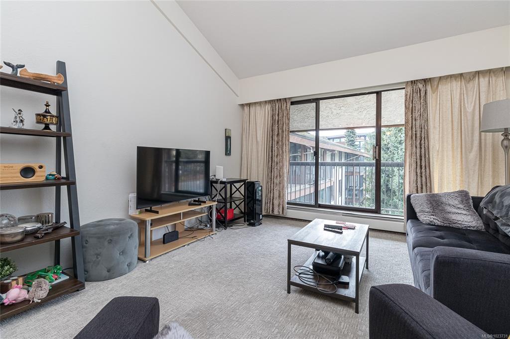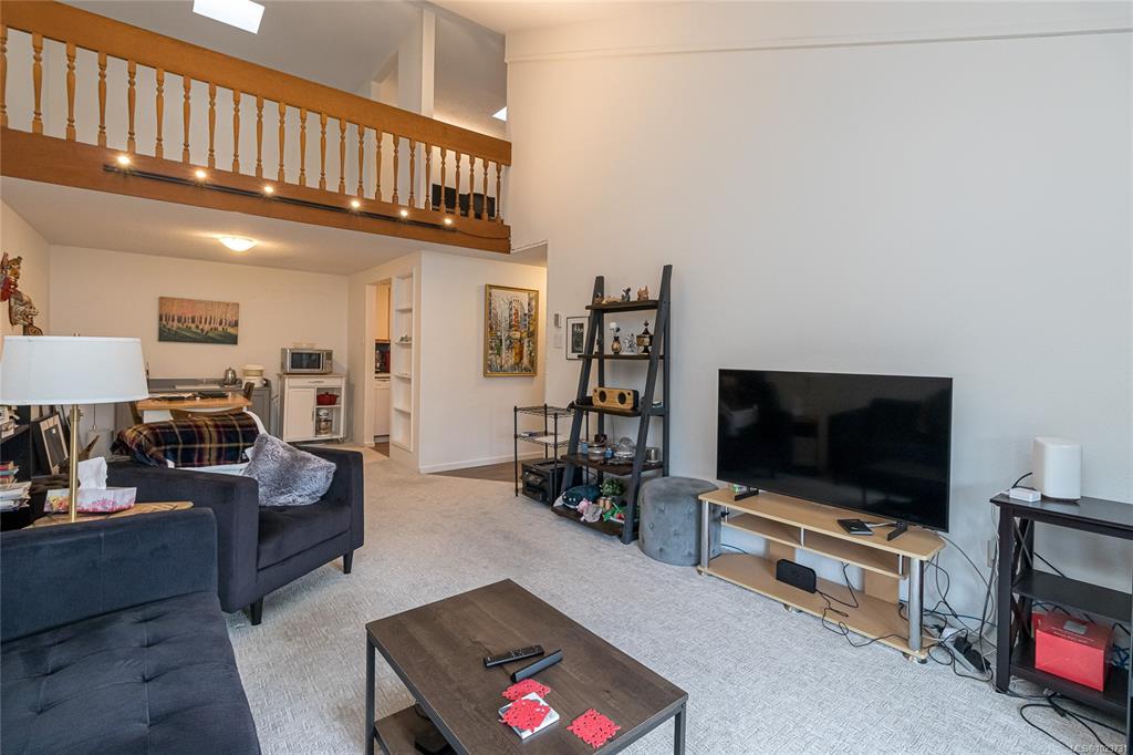 Spacious top floor loft style two bedroom condo at Royal Woods in Saanich! 916sqft main level with 14 foot vaulted ceilings in living room, sunny 10x5 west facing balcony and 14x11 primary bedroom with large walk-in closet. Additional 332sqft loft level with two skylights and plenty space for second bedroom, home office/studio and storage. Updates include new vinyl flooring and carpet throughout (2022), bathroom refresh (2024), dimmable smart LED lighting and updated paint throughout. Royal Woods is situate...