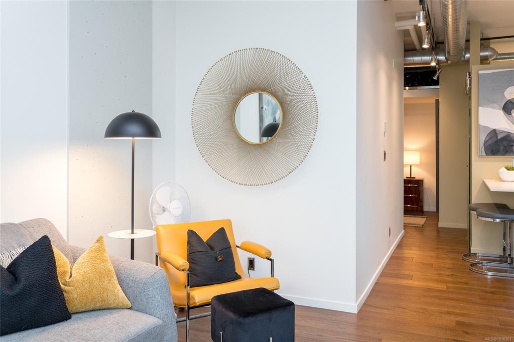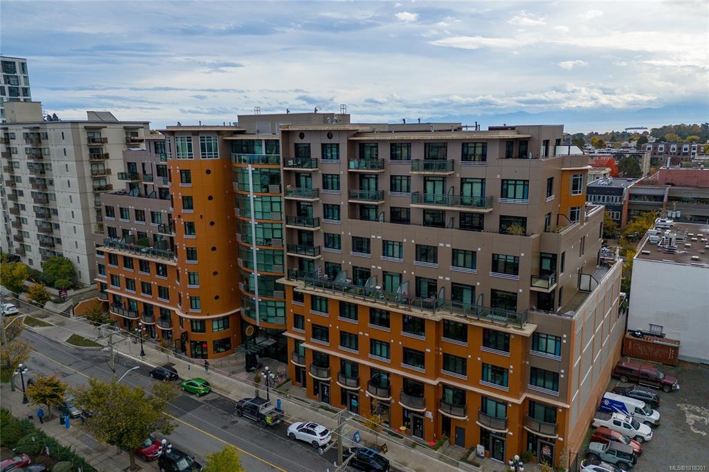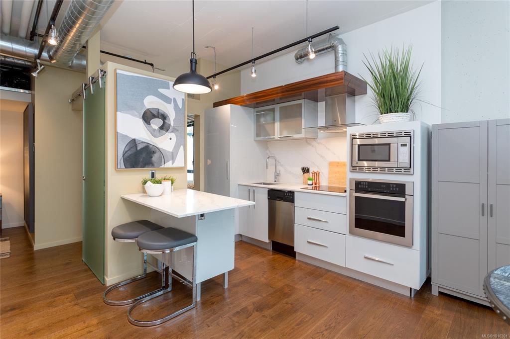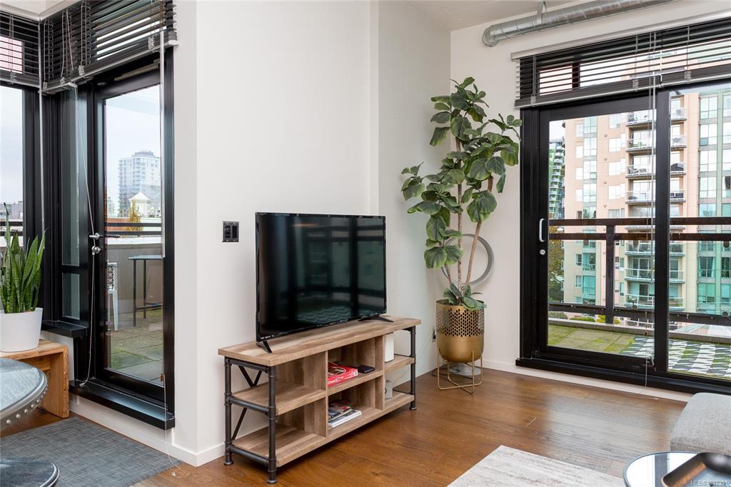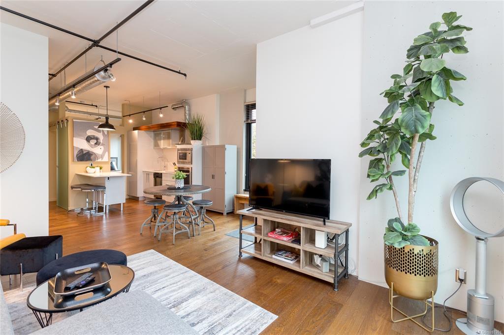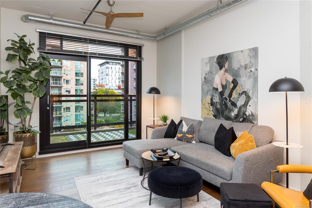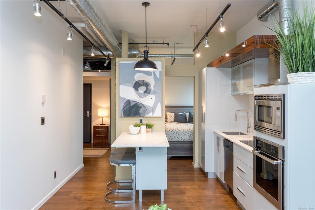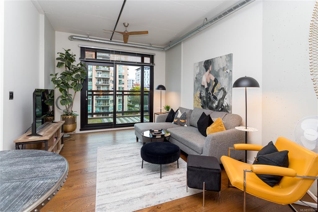 Gorgeous & Unique Loft Style Living in The Juke Box! Light filled corner unit with floor to ceiling windows, over 400 sq. ft of balconies,10'high ceilings, European Vinyl Plank flooring throughout, high gloss kitchen w/quartz counters, built in appliances and island, decadent bathroom with ceiling rain shower head, washer and dryer and custom freestanding armoires. Live the downtown lifestyle in Harris Green-across the street from Yates Market with its numerous market stores, 1/2 block to Cook St., yet only...