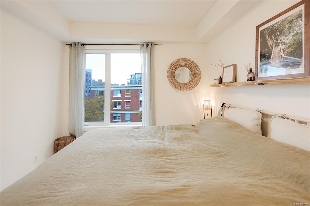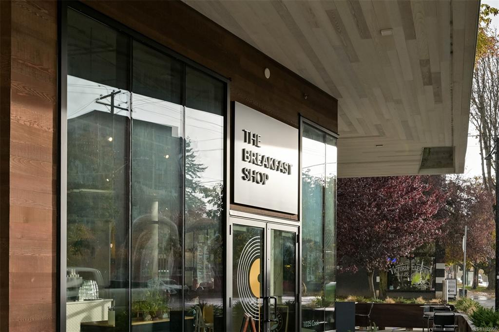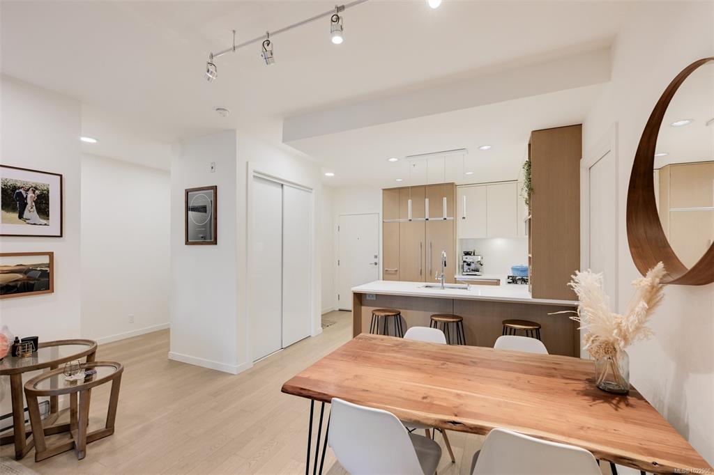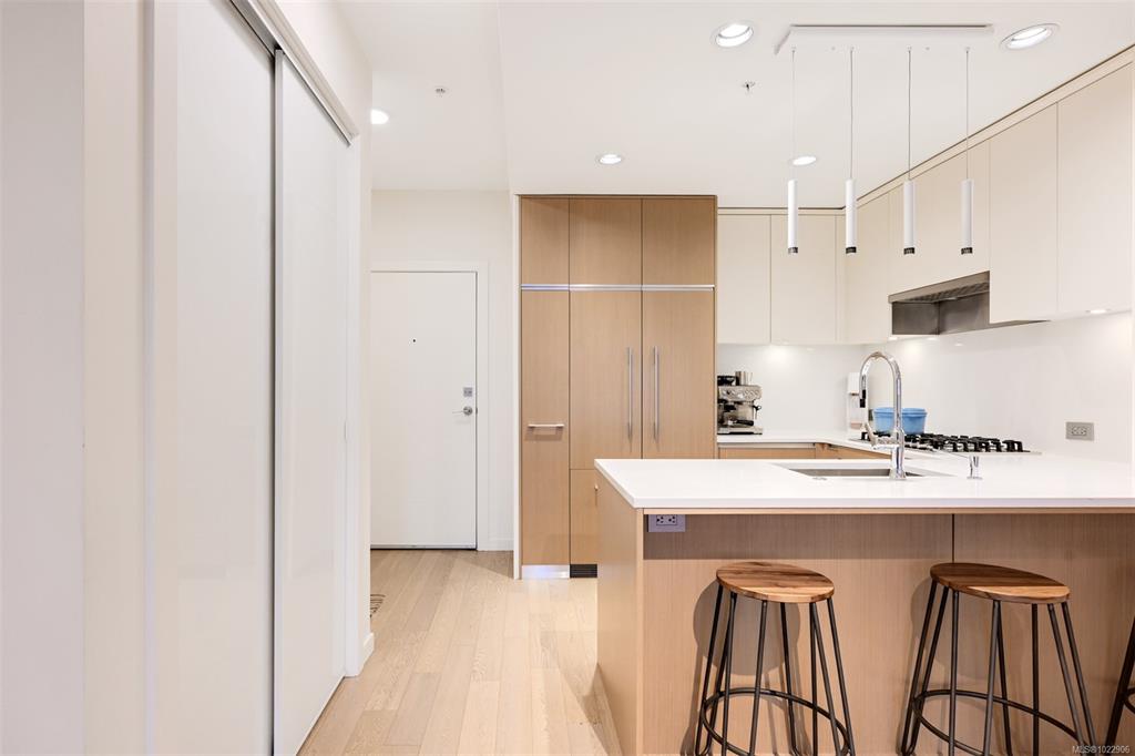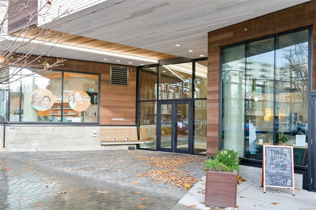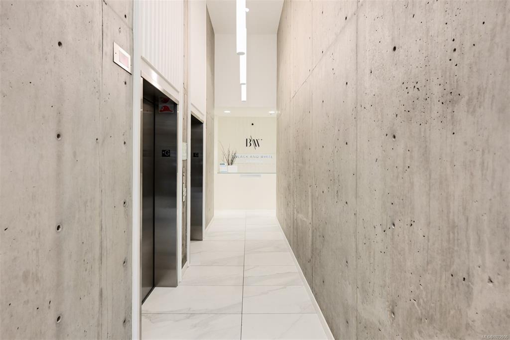 Welcome to Black and White by Abstract Developments; a boutique collection of residences that sits only steps to cafe's, dining, shopping, Dallas Road Waterfront and more. This well maintained 2 bed, 2 bath + den home features an open layout with premium finishings throughout including wood flooring, high ceilings, 2 tone cabinetry, quartz countertops, and a designer appliance package with Fulgor gas range. The living area is enhanced by the upgraded fireplace option, creating a warm and inviting atmosphere...