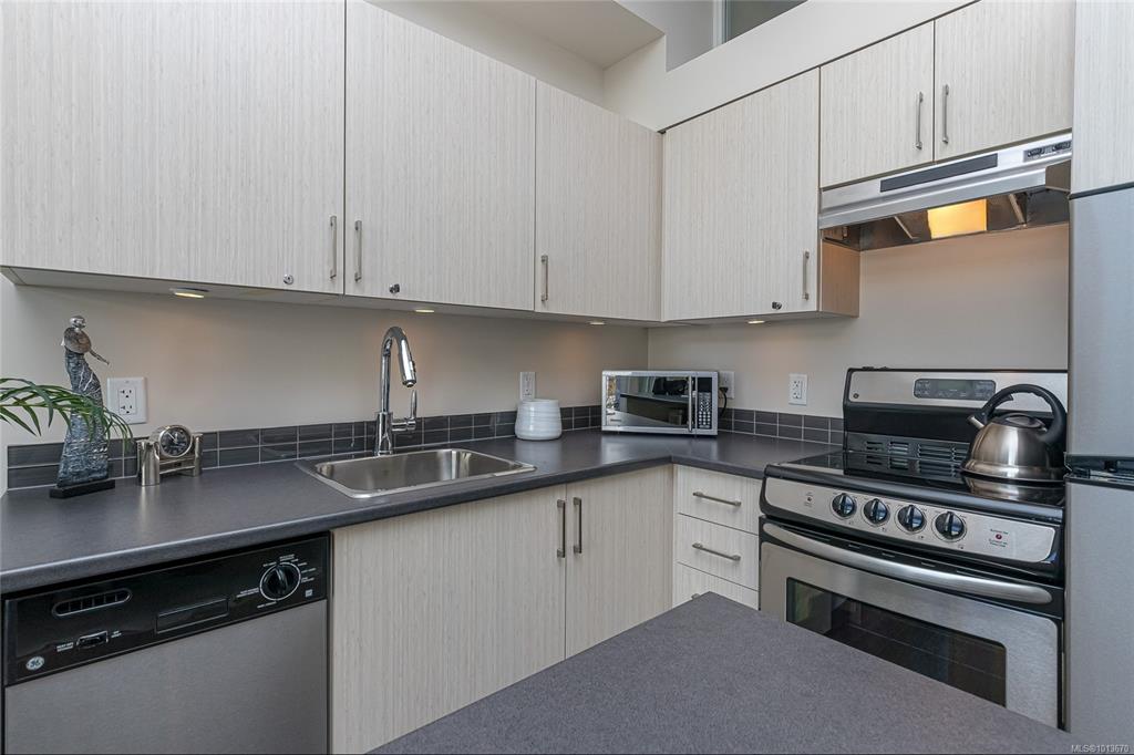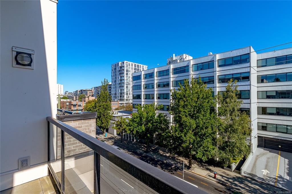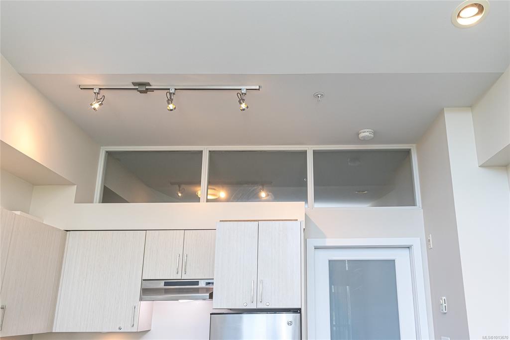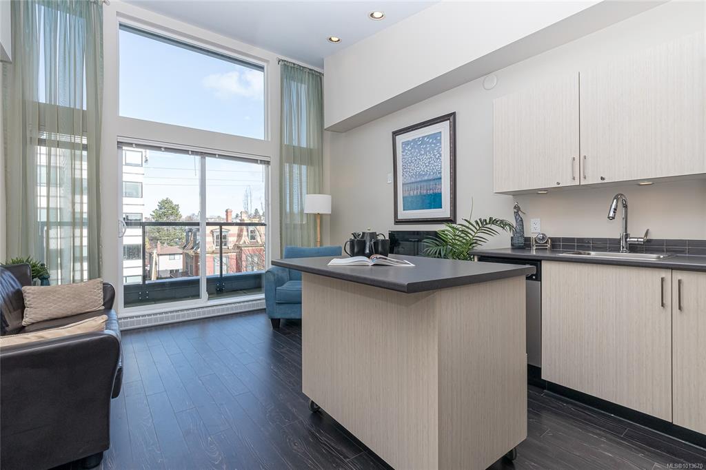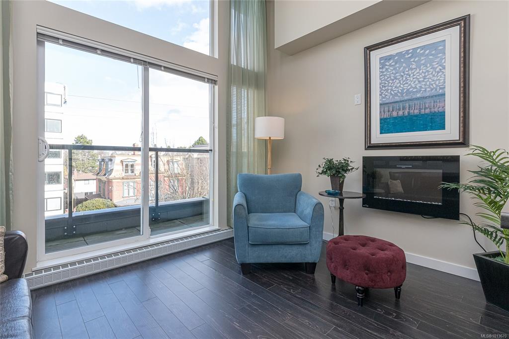 Fantastic bright one bedroom condo with city views! Unique top floor unit with 11 foot ceilings, floor to ceiling windows. Fabulous roof top deck with 360 views, lounge seating and BBQ. Access to unit is via elevator to 4th floor, opening to open air hallway and private unit entrance. Kitchen includes stainless stove, fridge, dishwasher, microwave and plenty of cupboards. Features include moveable island, electric fireplace, in unit washer and dryer, blinds and sliding glass door to balcony."The Zen" build...