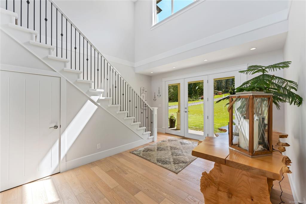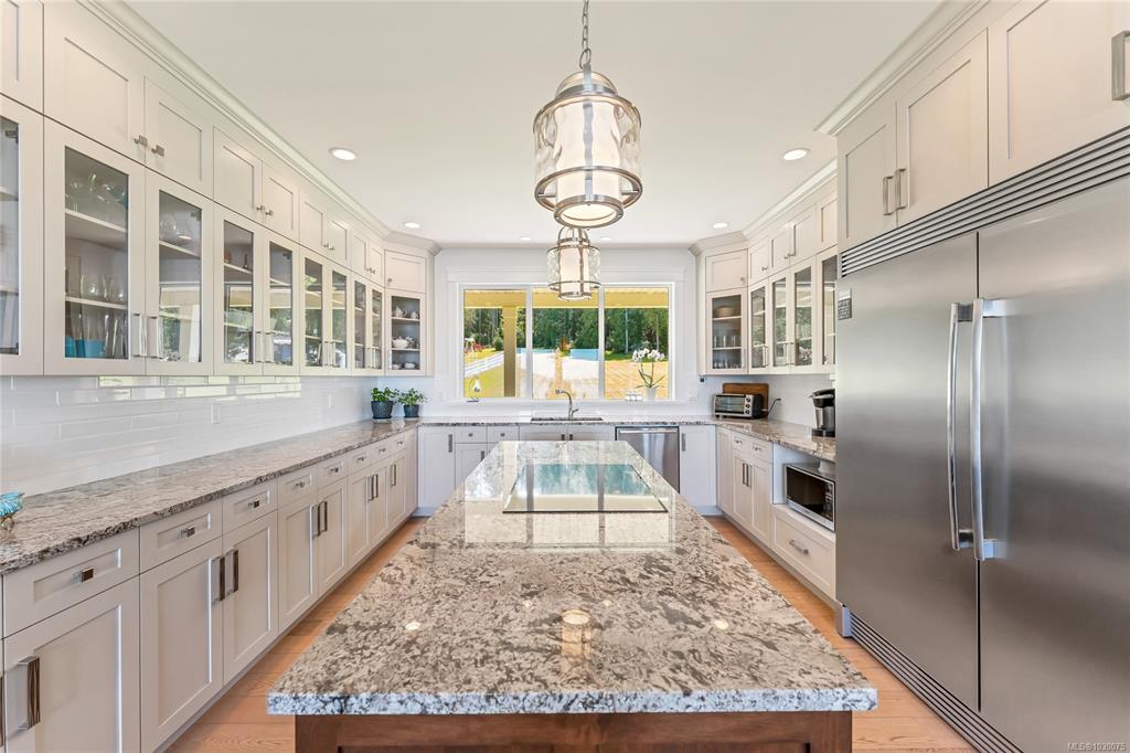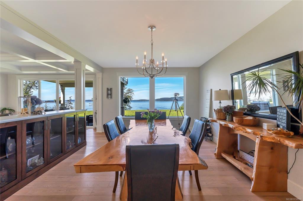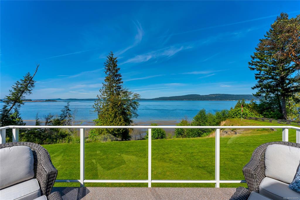 Architecturally designed, oceanfront luxury home awaits you on Vancouver Island. 4.8 peaceful acres of unobstructed waterfront /w beautifully landscaped vistas. Entering into the grand foyer you will naturally flow into the stunning living room with coffered ceilings, Turkish stone fireplace and unbelievable ocean views. The kitchen boasts high end SS appliances, custom maple cabinetry & granite which continues throughout the entire home including the oversized 3 bay garage. The stunning primary bedroom on ...