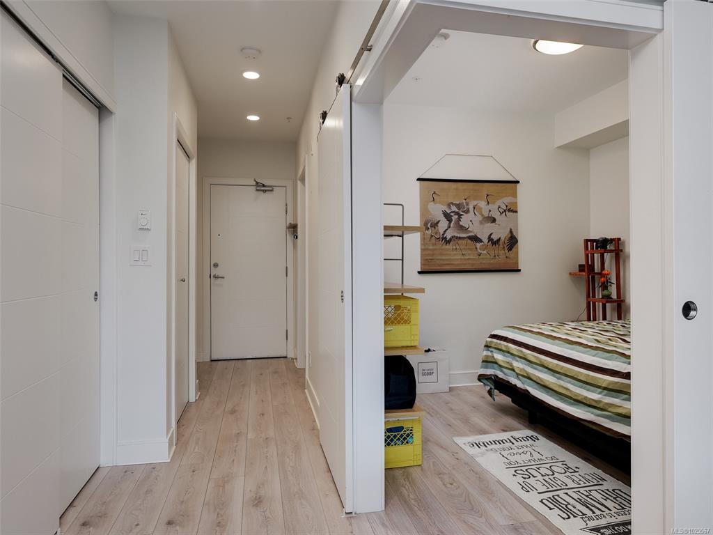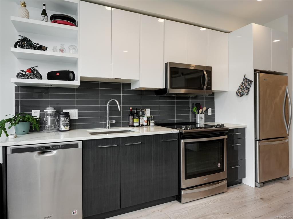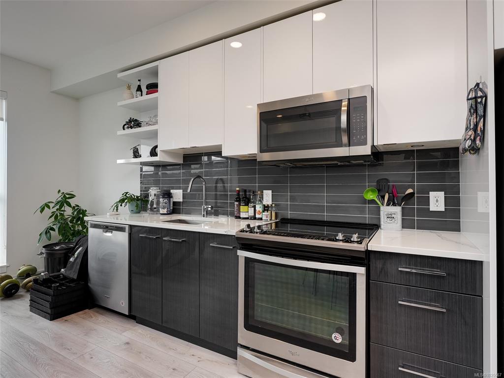 Modern junior one-bedroom suite in the popular Lakepoint One building at Westhills. Built in 2018, this well-designed condo offers 556 sq ft of efficient, open-concept living on the 4th floor with a south-facing exposure and excellent natural light. The bright living and dining area flows into a contemporary kitchen featuring quartz countertops, stainless steel appliances, and high-gloss cabinetry. The comfortable bedroom offers a tranquil retreat with sliding doors, complemented by convenient in-suite laun...