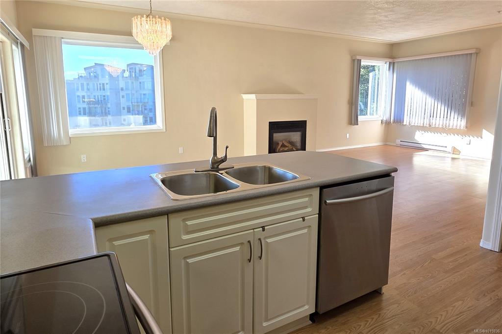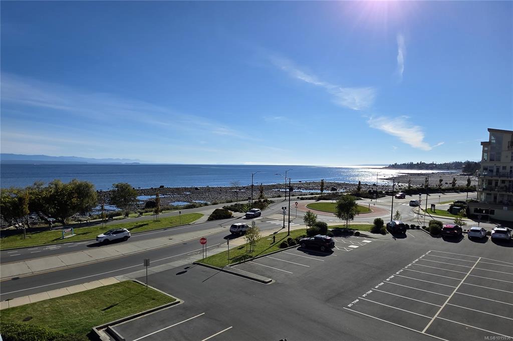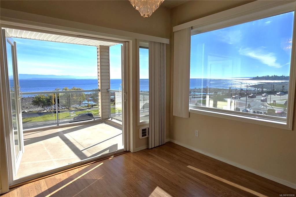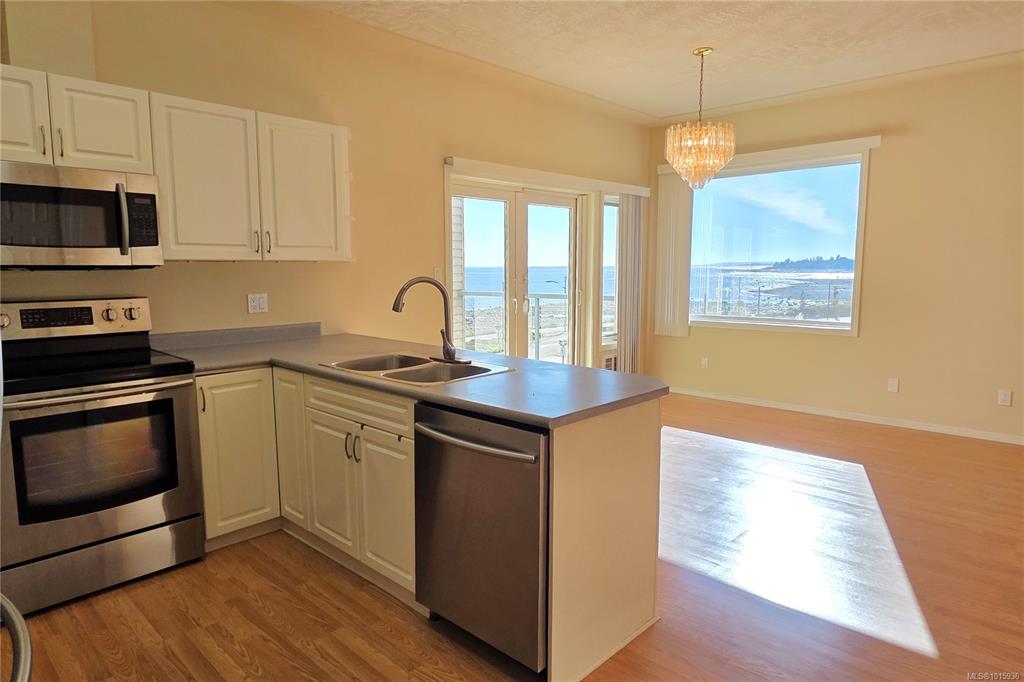 Observe magnificent ocean and mountain views from this top floor south and east facing condo. Pride of ownership is evident, lovingly maintained and freshly painted with neutral tones throughout. The gas fireplace is great to cozy up with while watching the moonrise or sunrise over Quadra Island. The spacious floor plan and 9 foot ceilings with skylight in the entry make this condo feel very spacious. The kitchen has loads of cupboards, newer stainless steel appliances, a large pantry and lots of countertop...