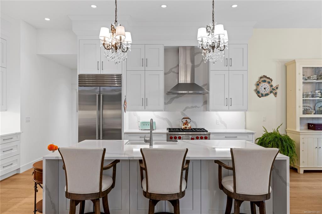 Set on a quiet, well kept cul-de-sac, this beautifully finished home combines luxury details with easy day to day living. Inside, 11 foot ceilings and expansive windows create a bright, airy main level with an open concept plan centred around a standout kitchen with waterfall quartz, ceiling height cabinetry, farmhouse sink, and premium Wolf and Sub Zero appliances. The living and dining areas feel refined yet comfortable, highlighted by a custom stone fireplace and built ins. The main floor offers a versat...