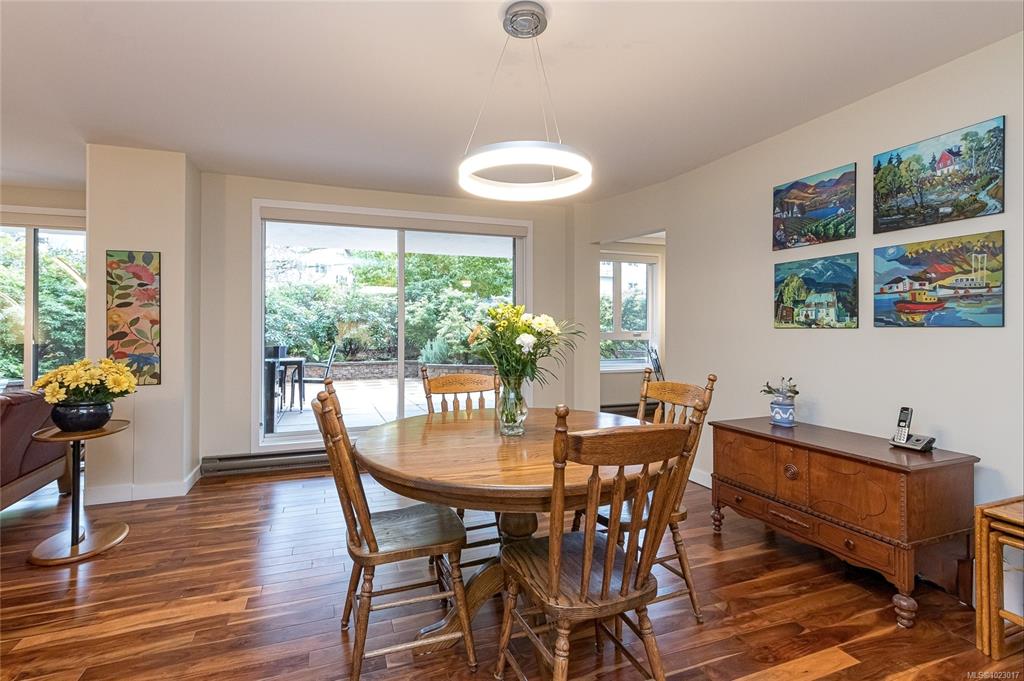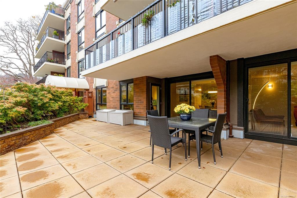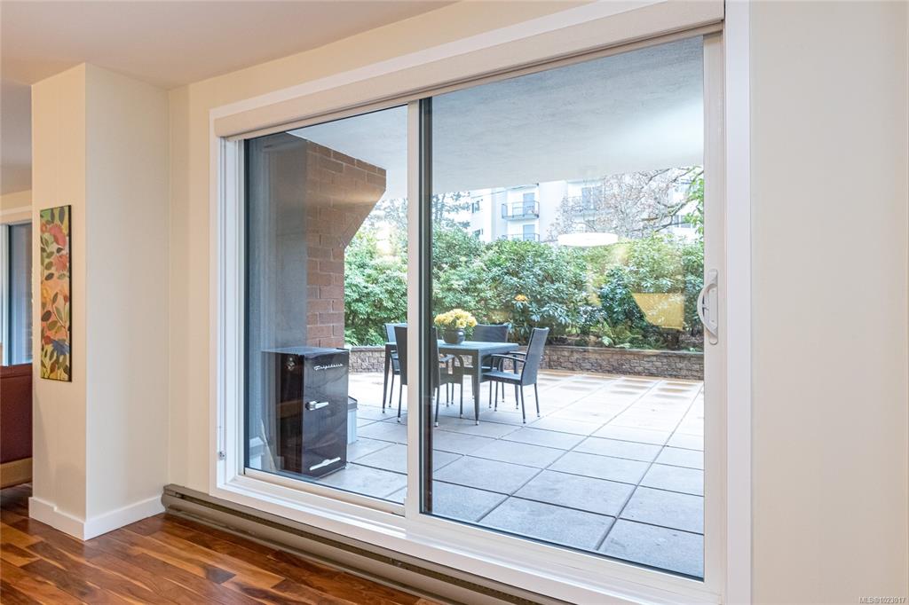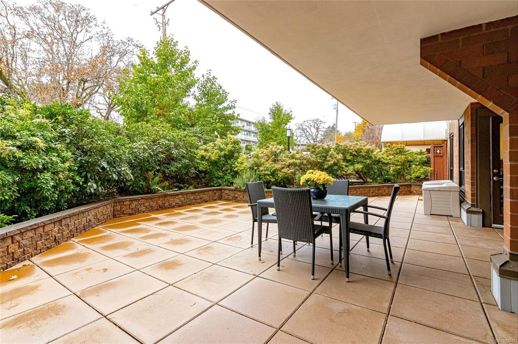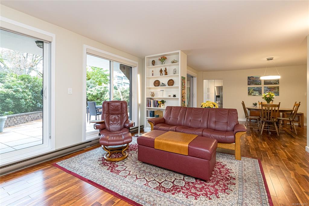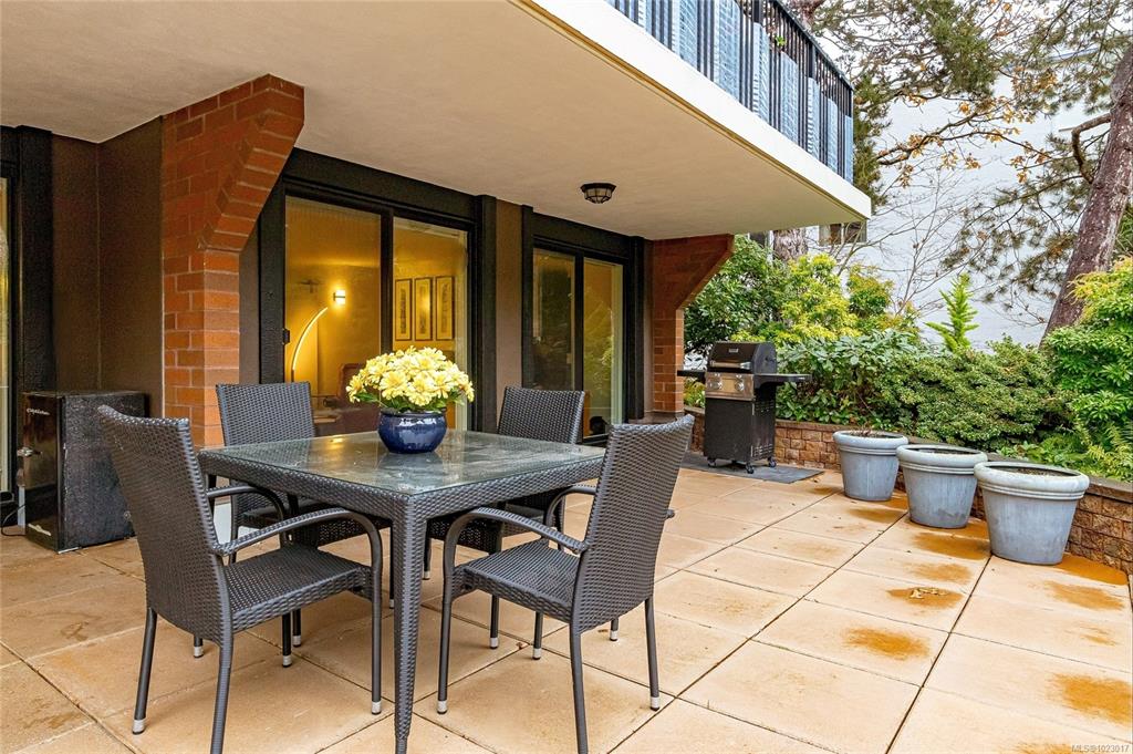 Beautiful sunny two bedroom condo steps from Oak Bay Marina and Oak Bay Village. Over 1300 sq ft of comfortable living space plus over 700 sq ft of private outdoor patio living space with southwest exposure. Spacious open floor plan with living room, dining room and office area separated by sliding panels. Modern kitchen complete with plenty of storage and desk. Primary bedroom boasts two closets plus wall to wall built in storage, second bedroom includes a large walk in closet. Enjoy sunny afternoons relax...