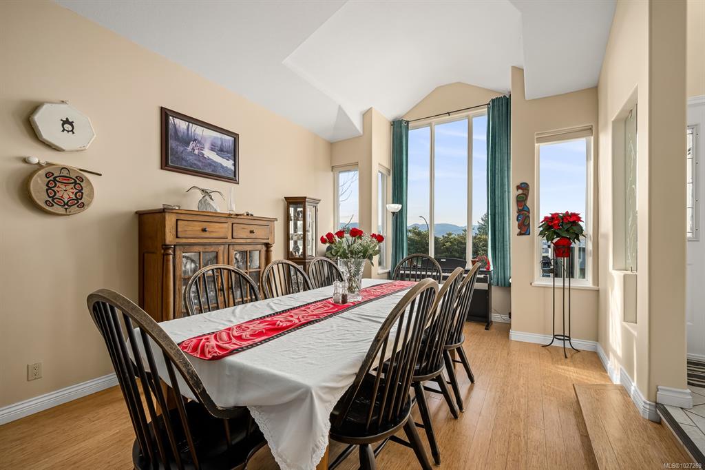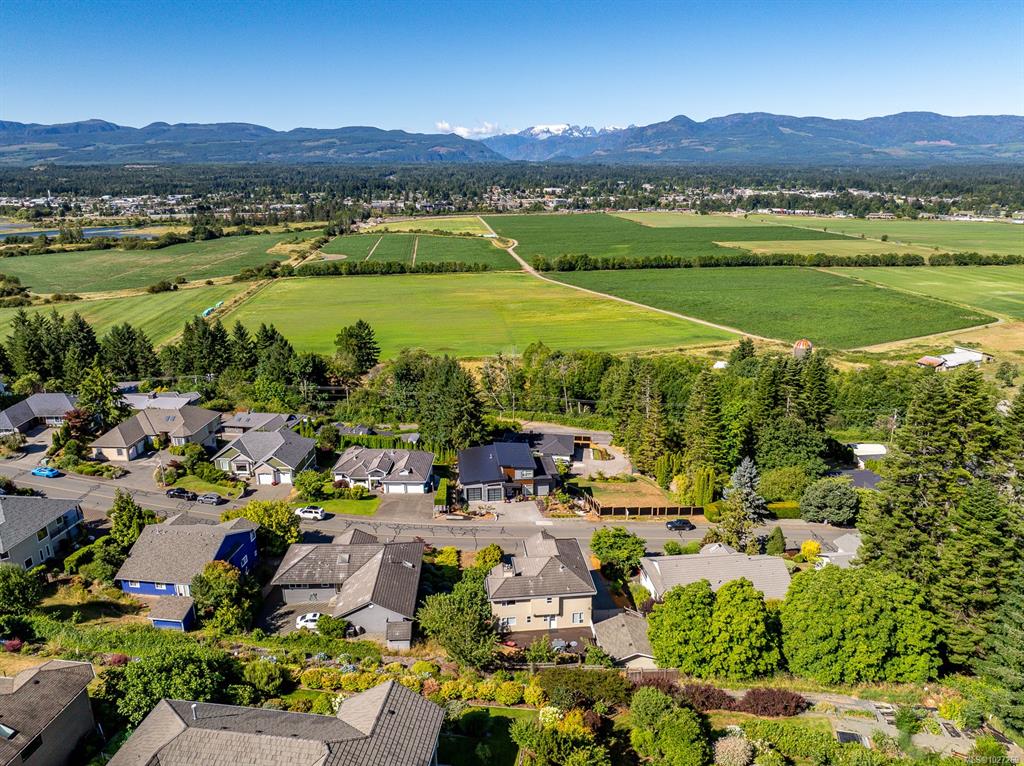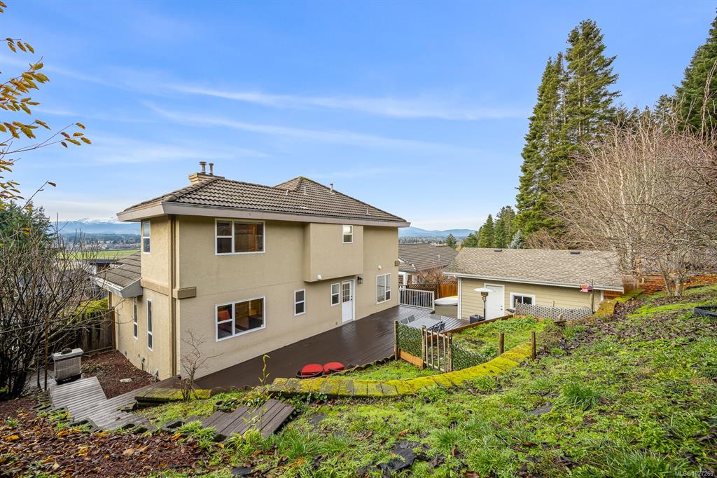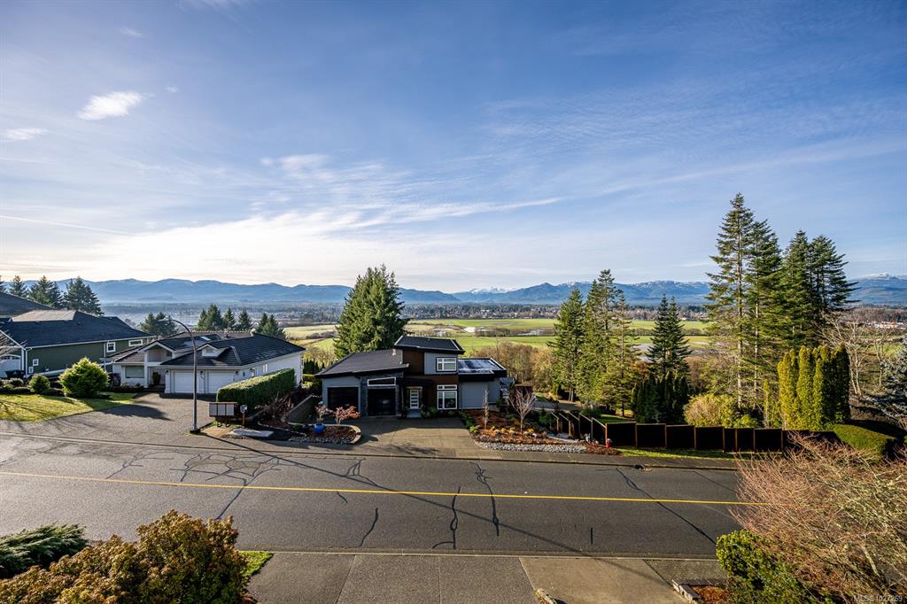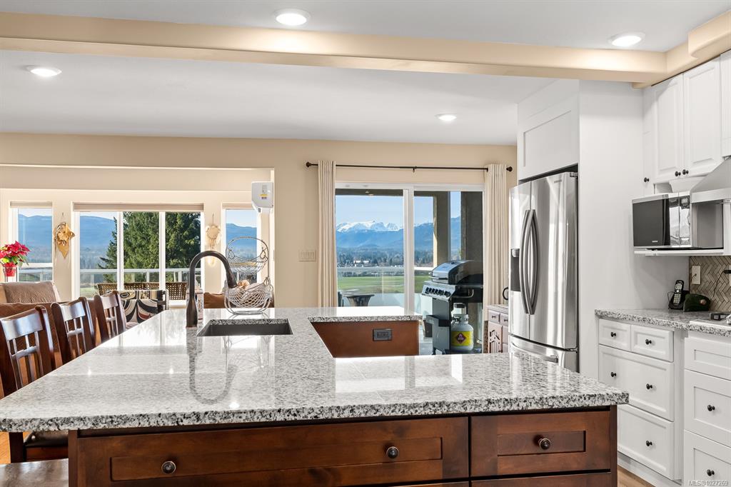 $100,000+ below assessed value! 3,766 sq ft three level multi generational living with suite potential and views of the Comox Glacier, Mount Washington, Coastal mountains, lush farmland and city lights! Designed to capture the scenery, the home features extensive windows that fill the interior with natural light. The main living rooms boasts 12ft cathedral ceilings and a gas fireplace, currently styled as an elegant dining area. The updated kitchen includes a large island, stainless appliances with gas sto...