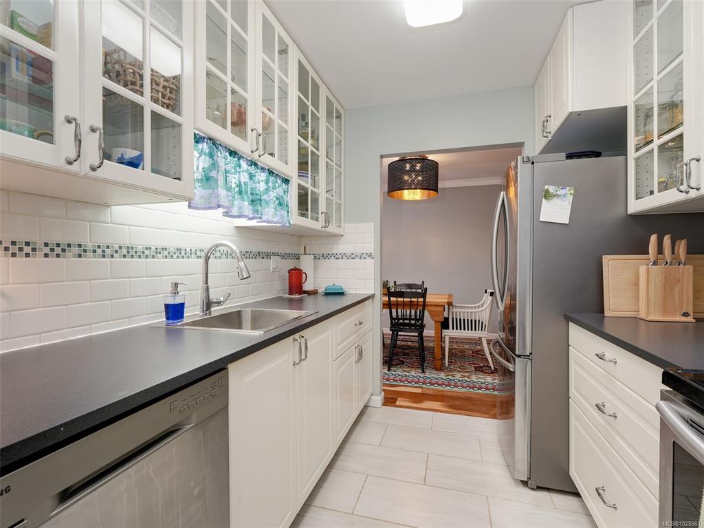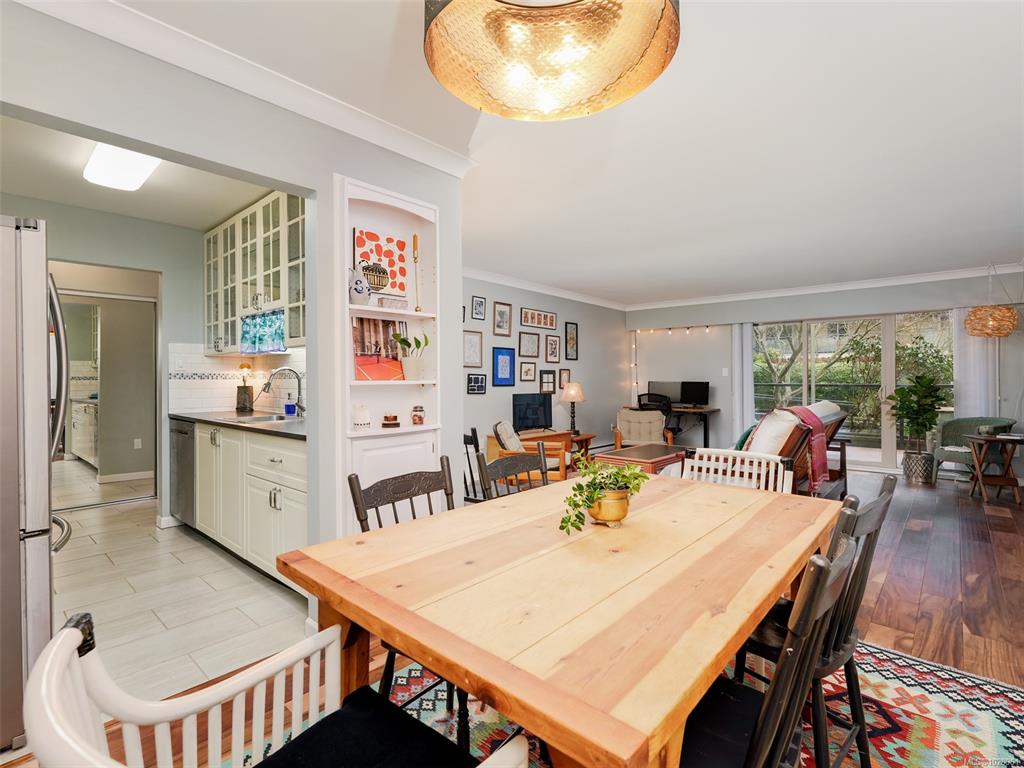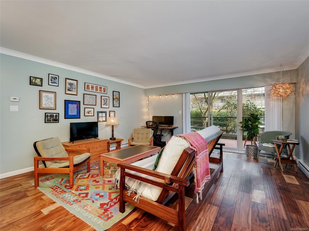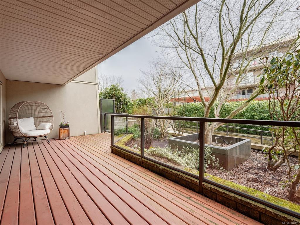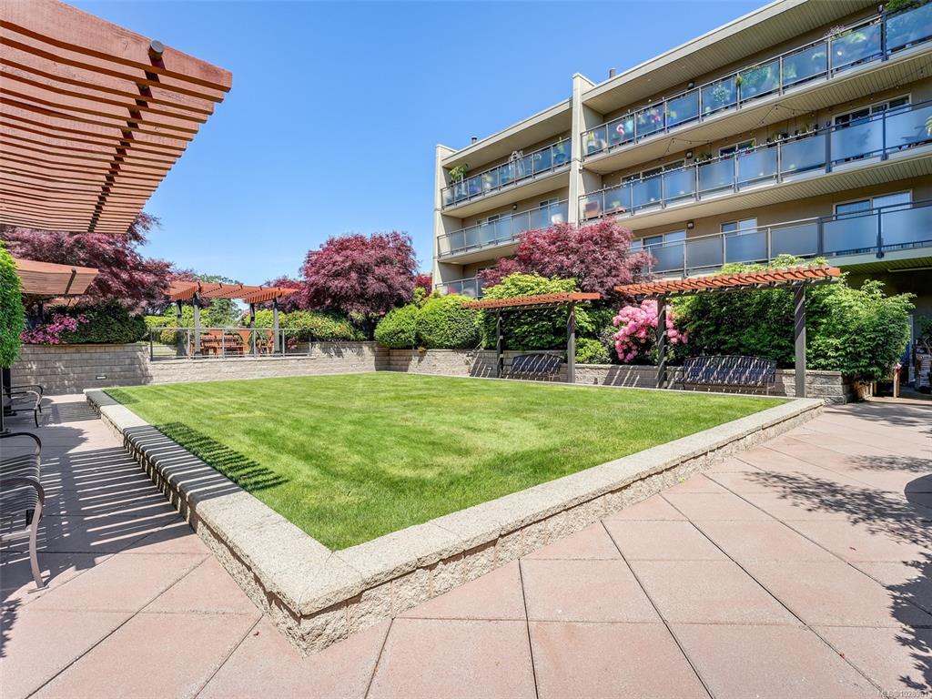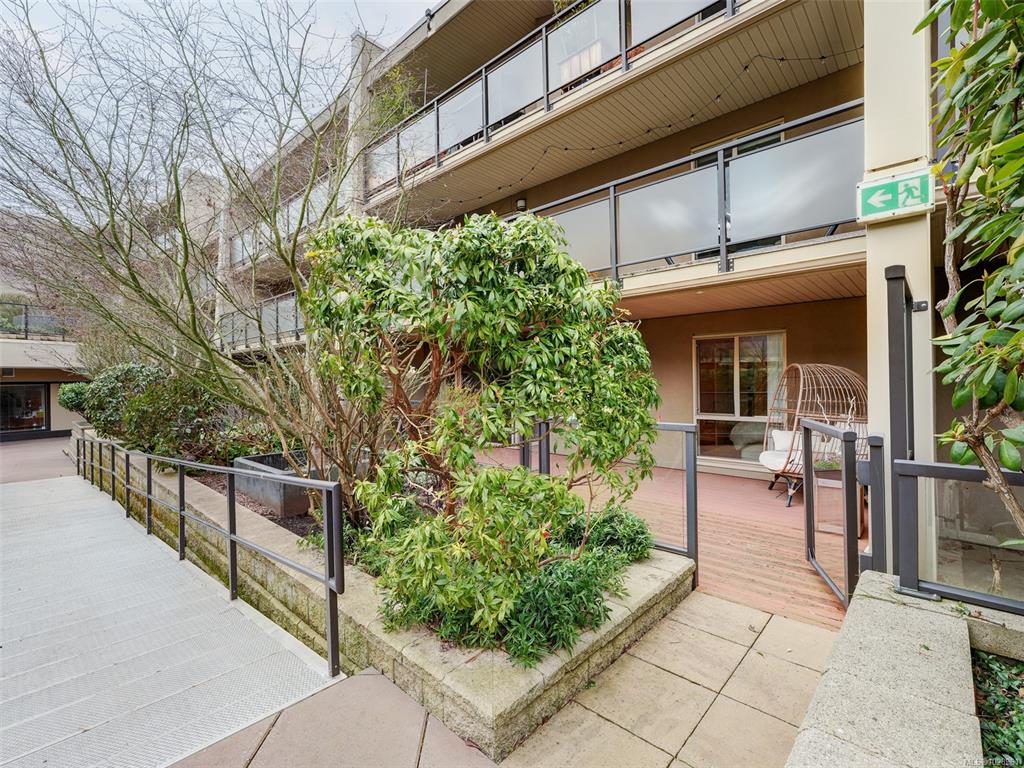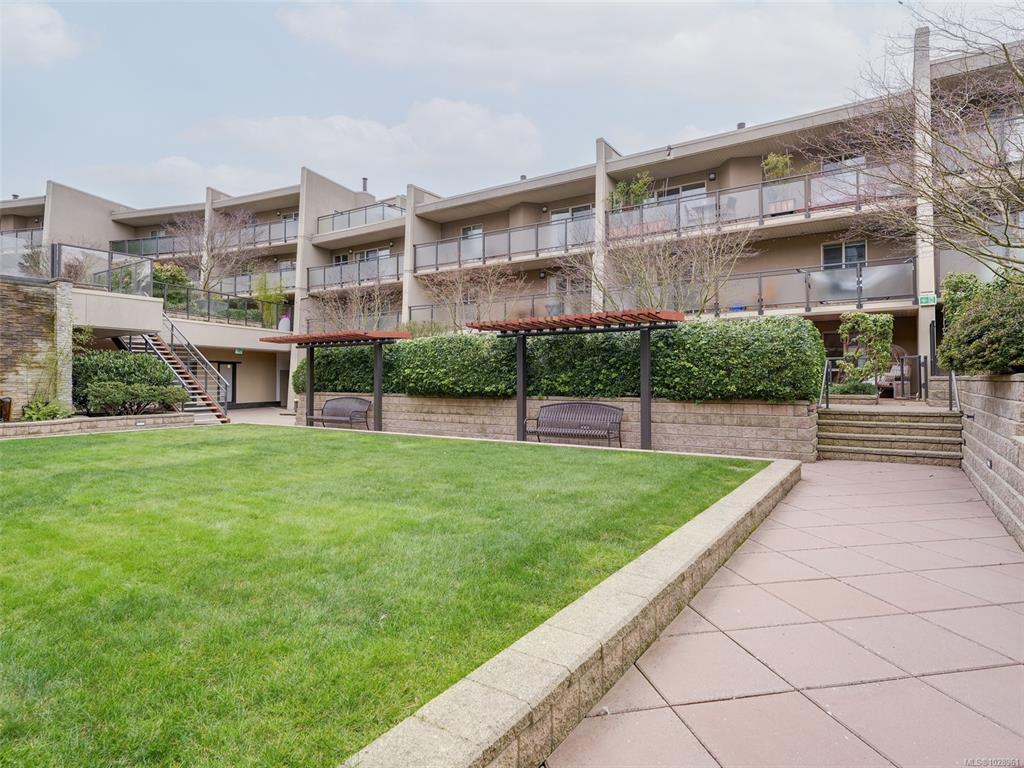 Feel the peacefulness of this private and spacious 1 Bedroom home that overlooks the beautiful landscaped courtyard gardens from its expansive patio. More spacious than many 2 bedrooms and NOT ON GROUND LEVEL. This home is in a prime location within a highly desirable building. It is ideal for those who value privacy, quiet, and generous space. Tastefully updated with a sleek kitchen offering glass-front cabinetry, stainless-steel appliances & engineered hardwood flooring. The Stadacona Centre is a well-man...