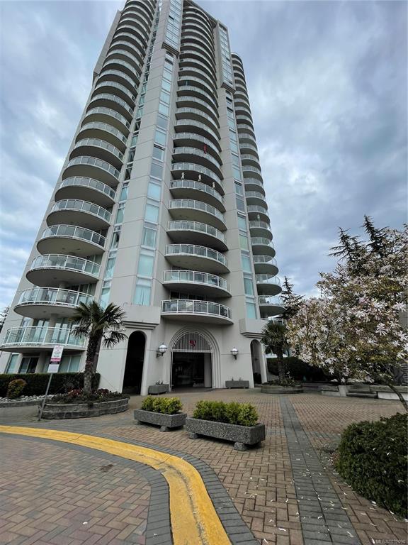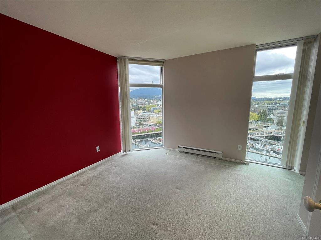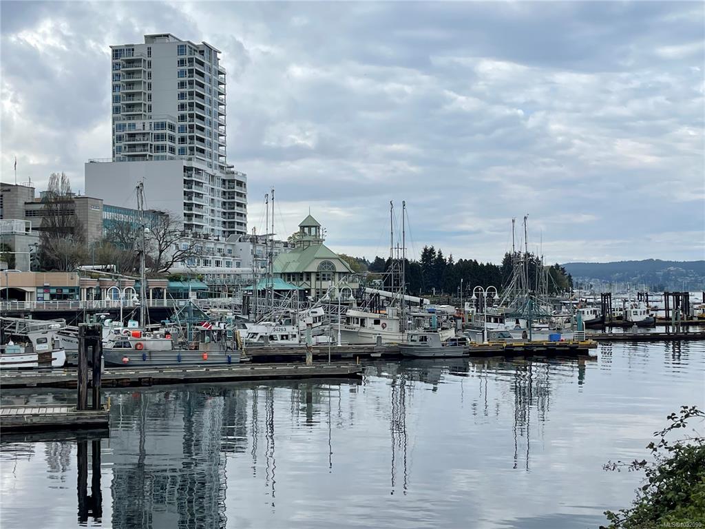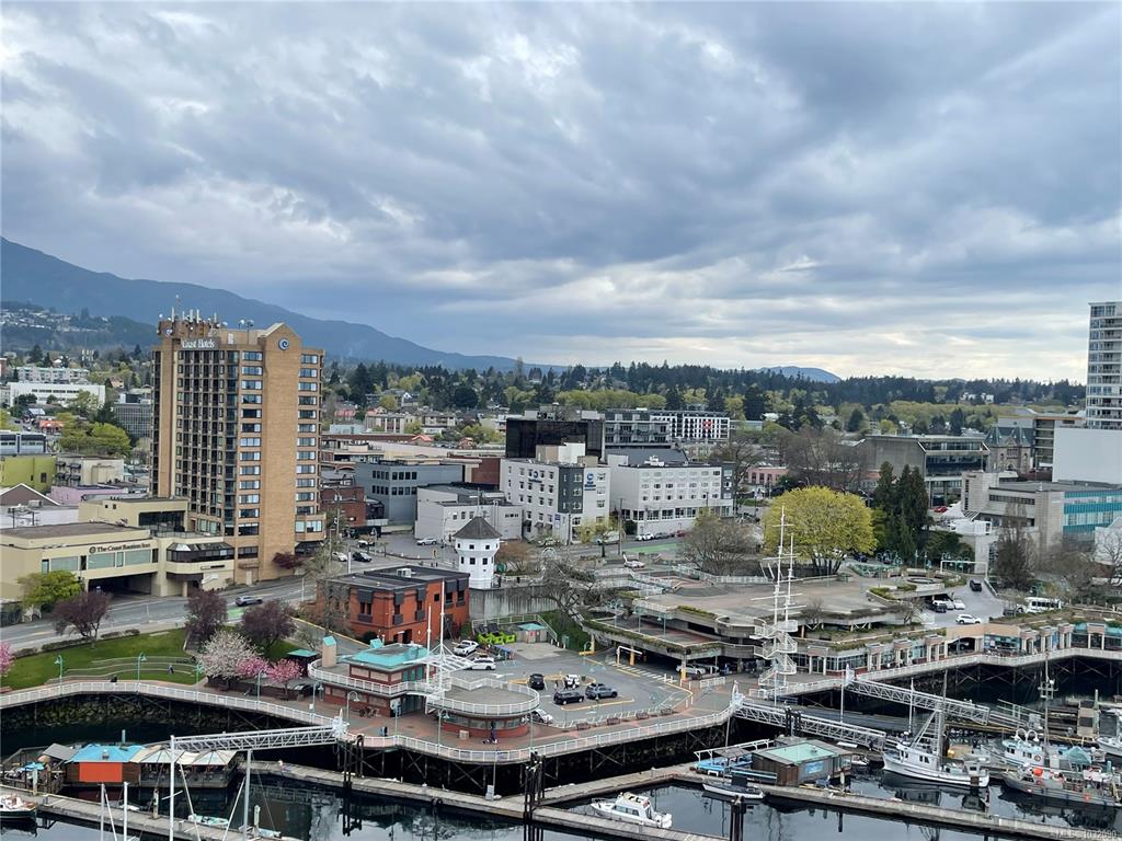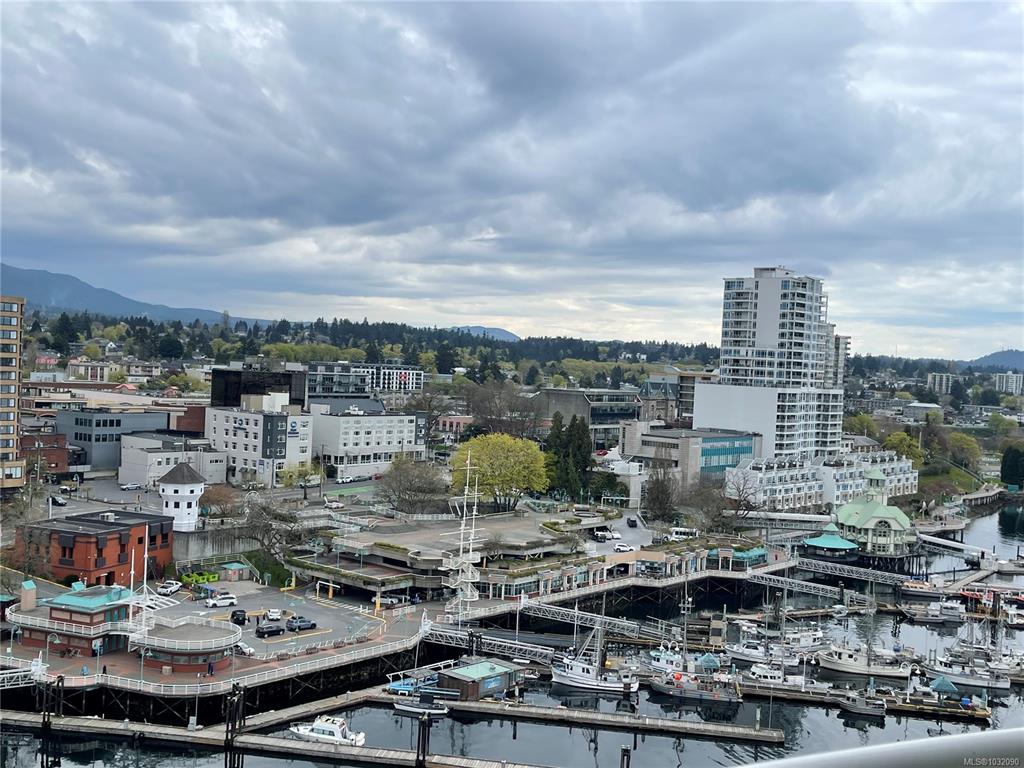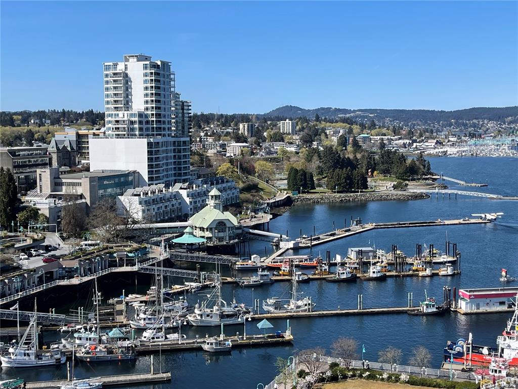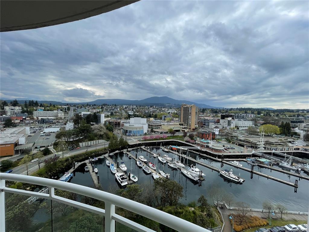 Enjoy outstanding south & west views of the downtown harbour, marina, Port Theatre, Mt. Benson and sunsets from this 16th floor, 2 bedroom, 2 bath suite. Spacious open 1153 sq.ft. floor plan. This suite has a unique butlers kitchen area with additional cupboards and huge pantry. The living room is very large & open & features a corner gas fireplace. Both bedrooms have excellent views. The new owner will want to replace the flooring & freshen the walls with paint. Great opportunity to choose your favourite c...