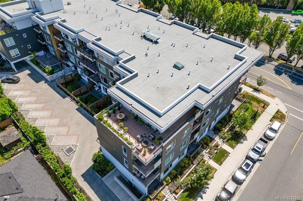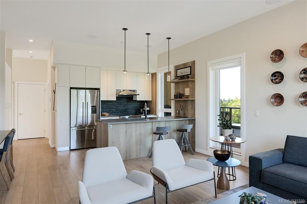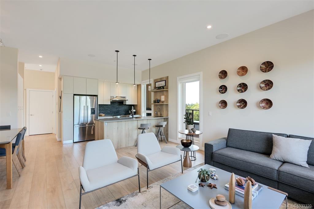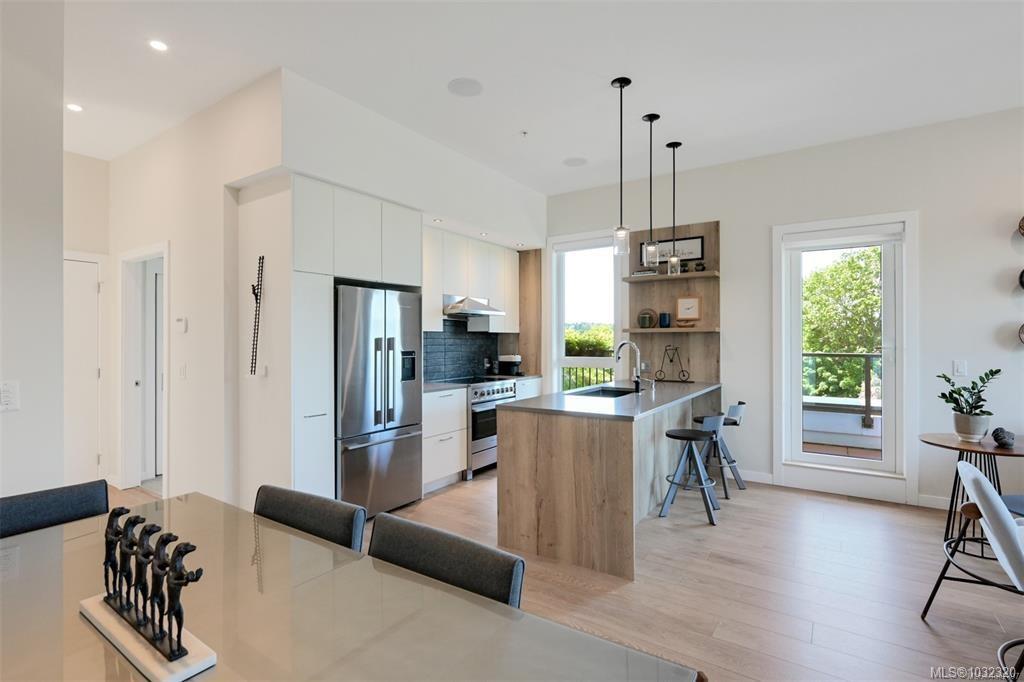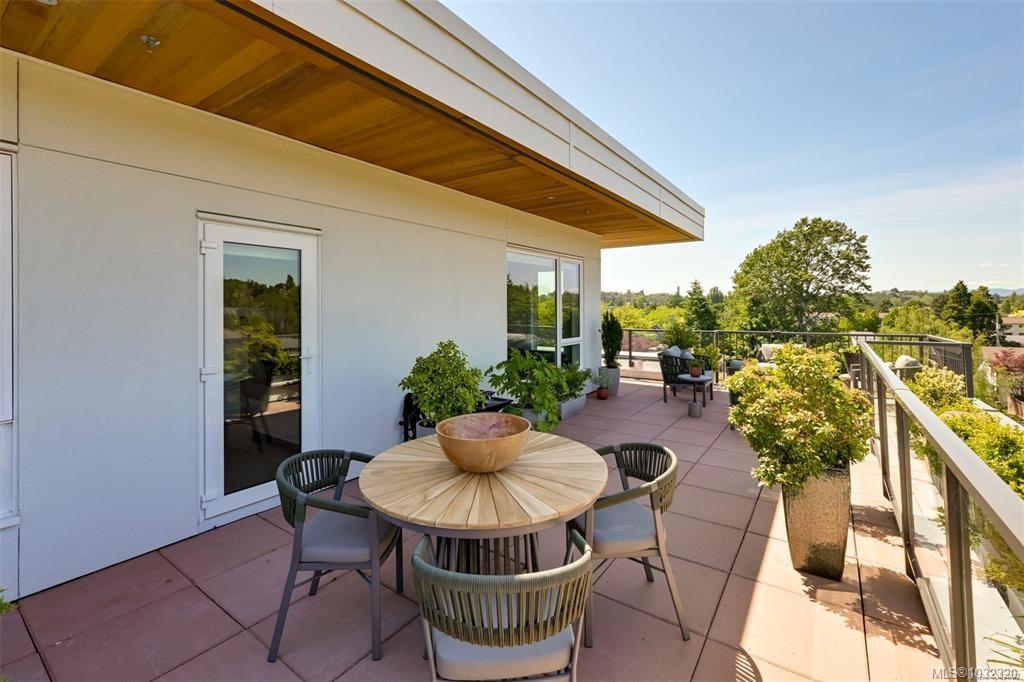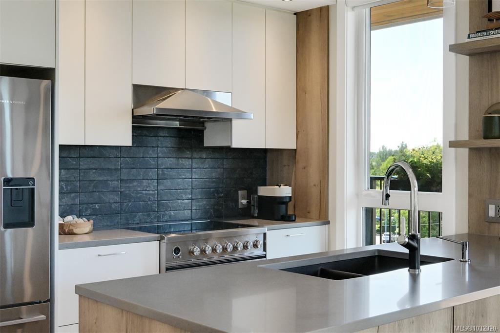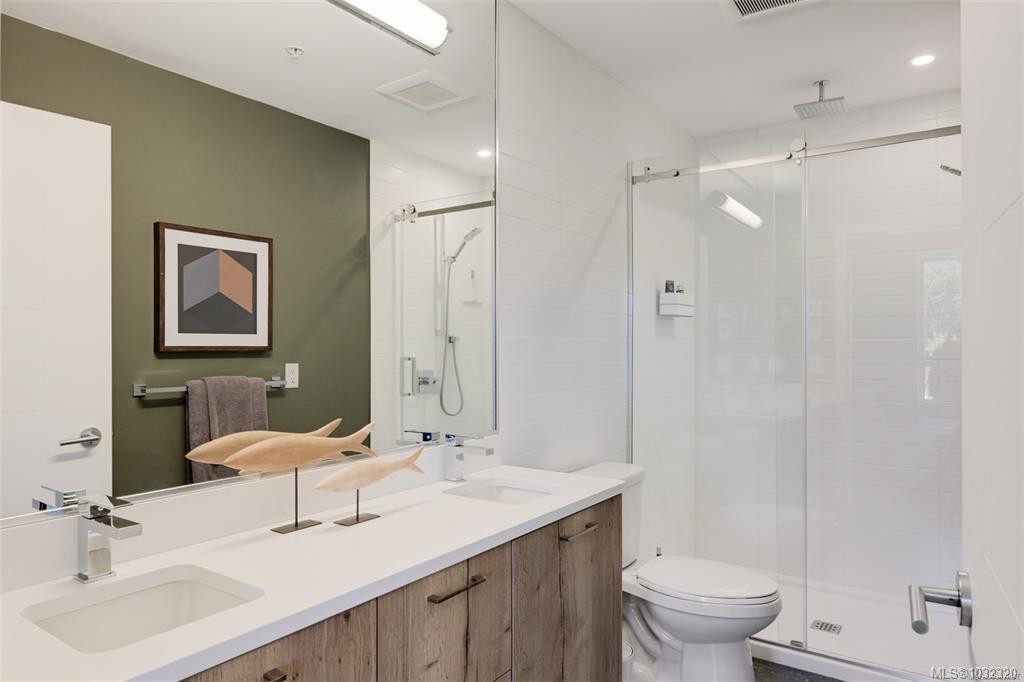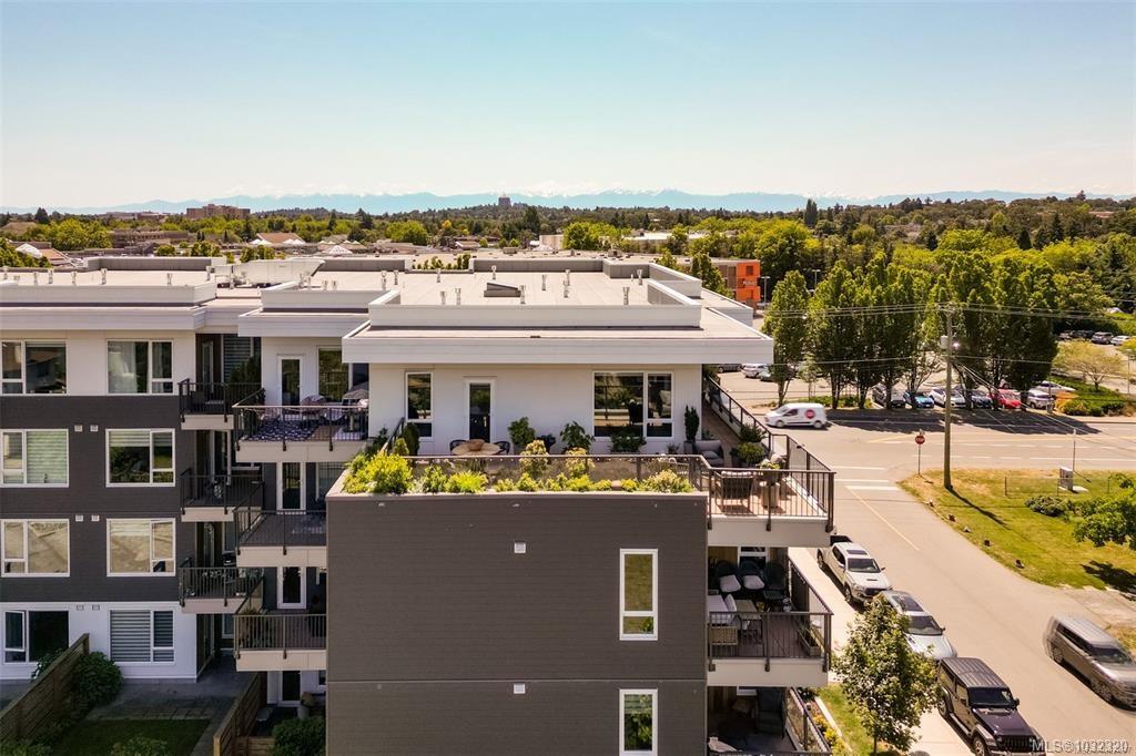 Experience elevated living in this like-new top floor corner penthouse offering nearly 1,300 sq ft of beautifully finished interior space, complemented by an impressive 600 sq ft west-facing terrace with distant views of the Sooke Hills. The well-designed layout features 2 spacious bedrooms, each with its own ensuite and ample closet space, plus a third full bathroom for guests. A bright, separate den provides an ideal space for working from home. The open concept living area is enhanced by 10' ceilings, ex...