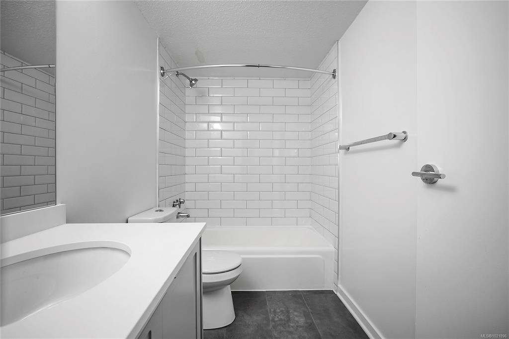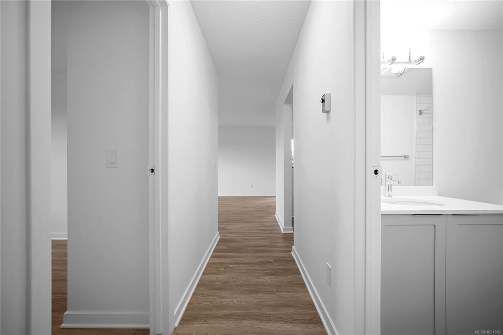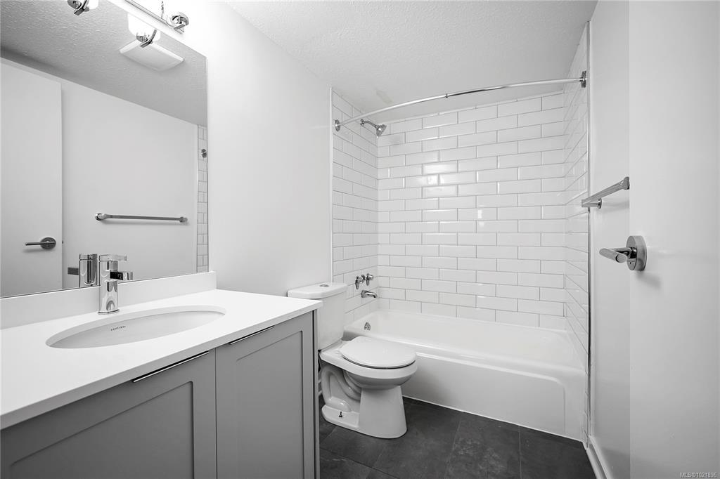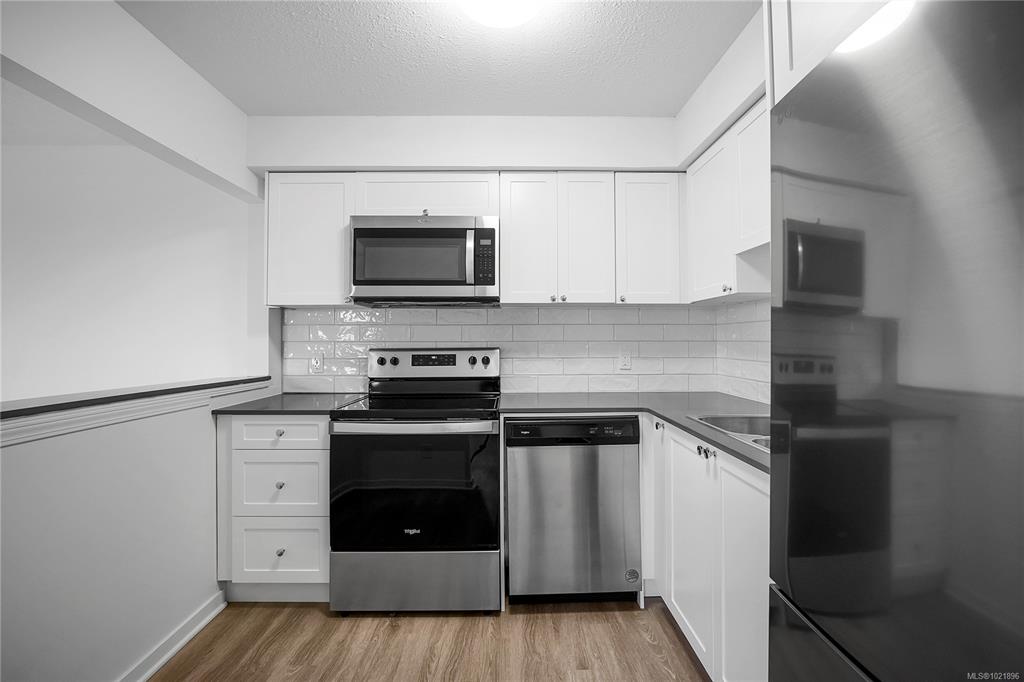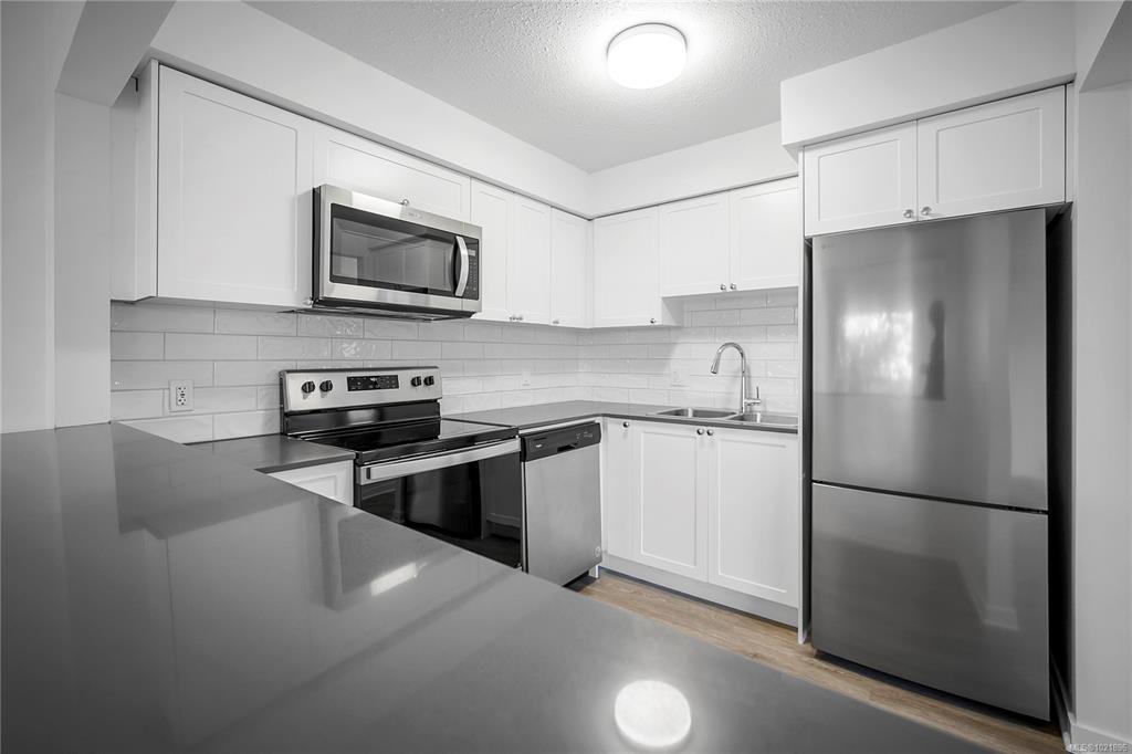 End corner suite, with a private balcony. We did a "virtual staging" of this suite-to give you an idea of what you might do. Adjacent to the Nanaimo Hospital. Re-modelled ( Throughly re-modelled) condo homes. All new appliances. This community features 63 suites with amenities including freshly updated shared spaces, secure entry and a prime location close to the hospital, schools and shopping. Residence 101 is a generously sized corner unit with two bedrooms and two full four piece bathrooms, fully mod...