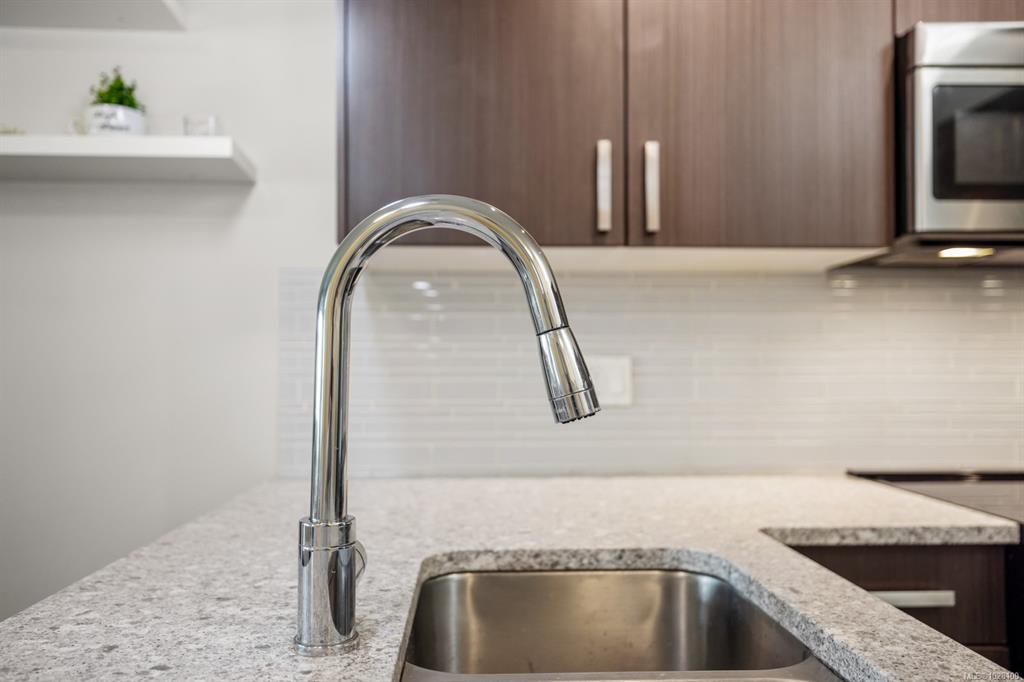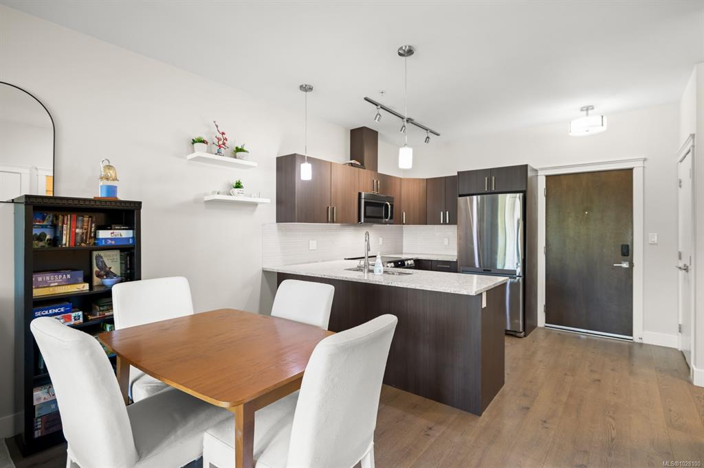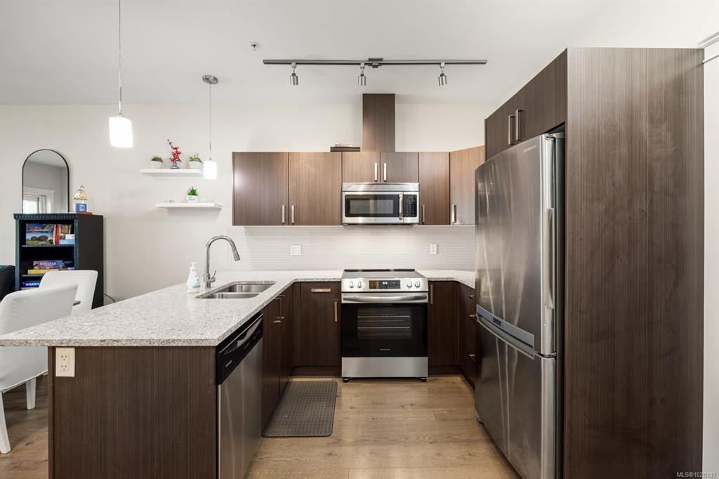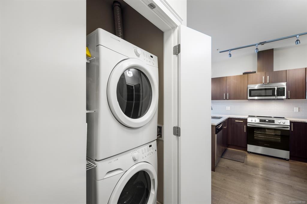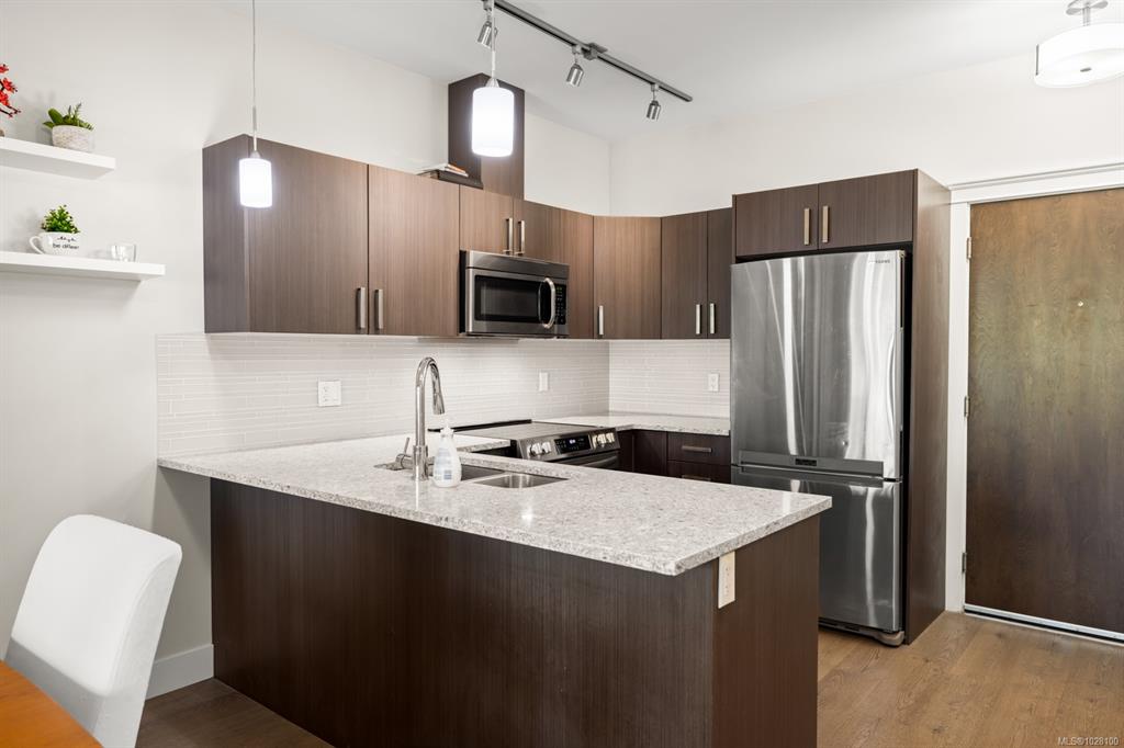 Privately positioned on the quiet side of the building, this top-floor 1 Bed + lg den residence offers an exceptional blend of comfort, function, and natural surroundings. The thoughtfully designed layout features overheight ceilings that enhance the sense of space, while the vaulted ceiling in the primary bedroom adds architectural interest and warmth. The kitchen is well appointed with stone countertops, SS appliances, and generous cabinetry for everyday convenience. A spacious den provides outstanding fl...