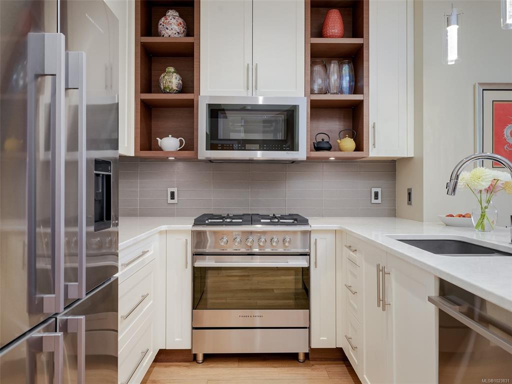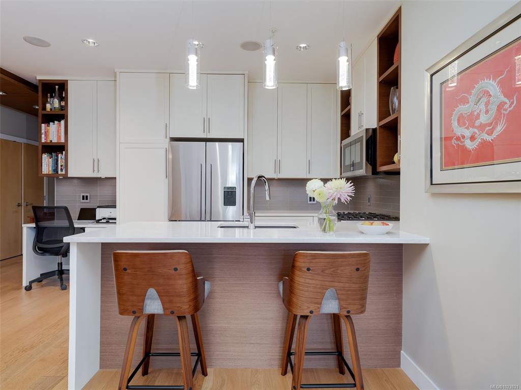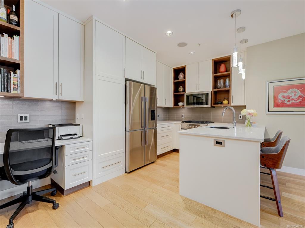 OPEN HOUSE SATURDAY JAN 24 1-3 pm This west-facing 2-bedrm, 2-bath condo is located on Oak Bay border in Abstract’s “Village Walk” complex, renowned for unmatched quality & design. The open-concept layout showcases a chef-inspired kitchen w/ tasteful updates & natural light, complemented by textured feature walls, a built-in desk, in-floor heating & triple-glazed Pella windows. The primary bedrm offers his-and-hers sinks, a spa-like ensuite & a new dedicated heat pump. The 2nd bedroom is ideal for guests, h...