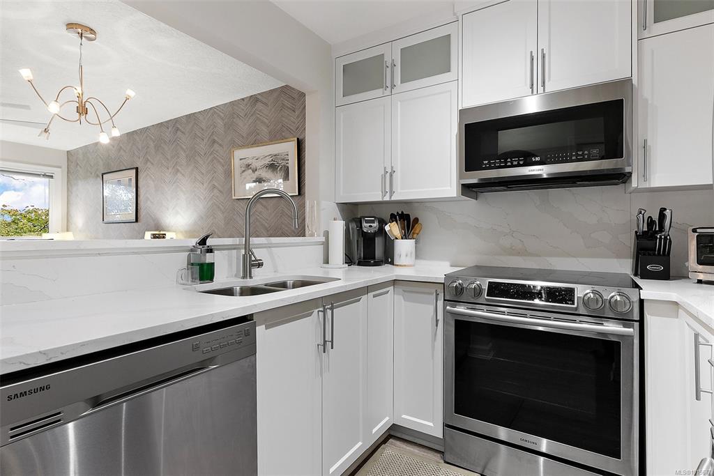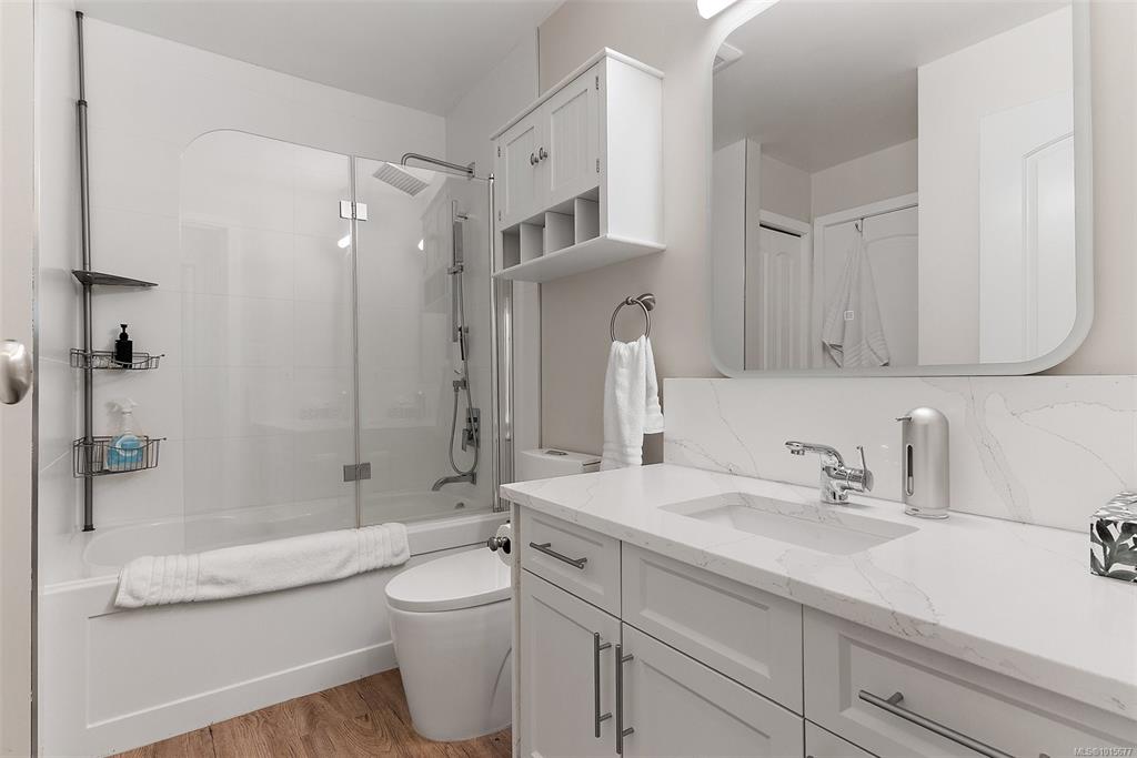 This is the one that you have been waiting for! Beautifully renovated south facing 1-bed top floor suite in a well-managed Sidney complex with turn-key possibility. You will love the tastefully renovated kitchen and bathroom newly installed in 2019/2020. Kitchen features marble counter tops, stainless steel appliances and in-cabinet lighting. 4-piece bath includes marble countertops and rain-shower. Unit has a great layout with living room/dining area combo plus south-facing deck. In-suite laundry and stora...