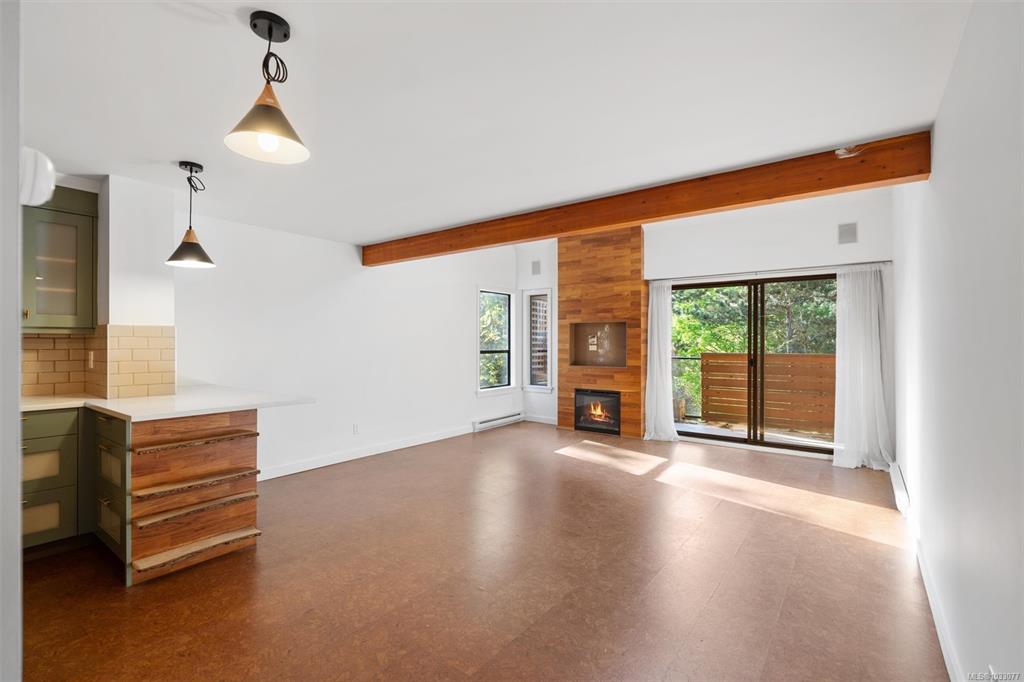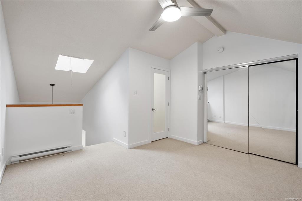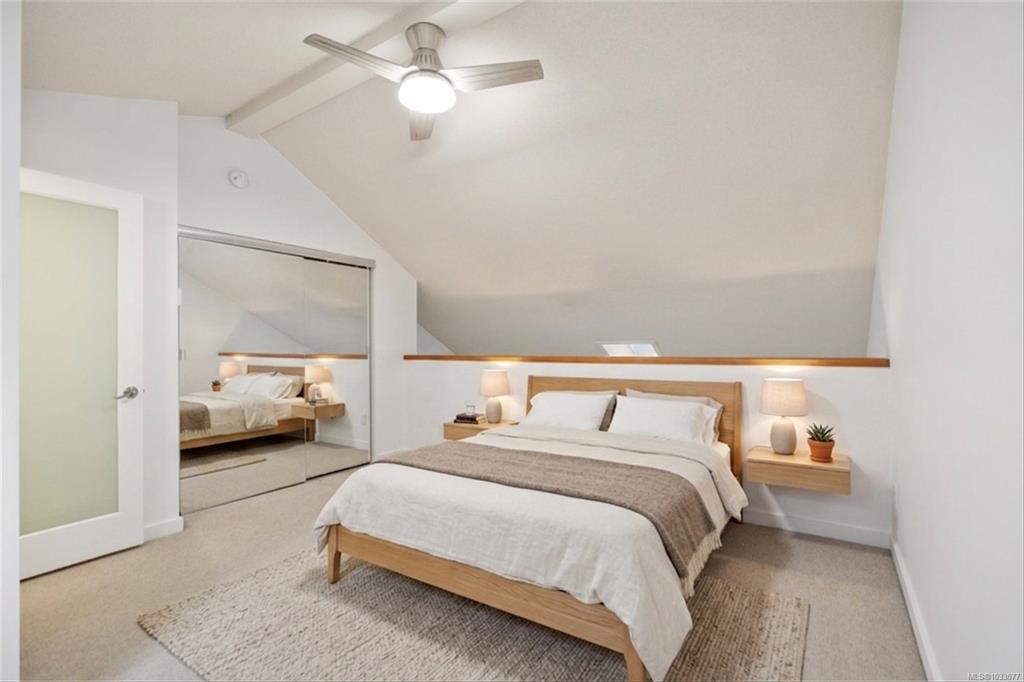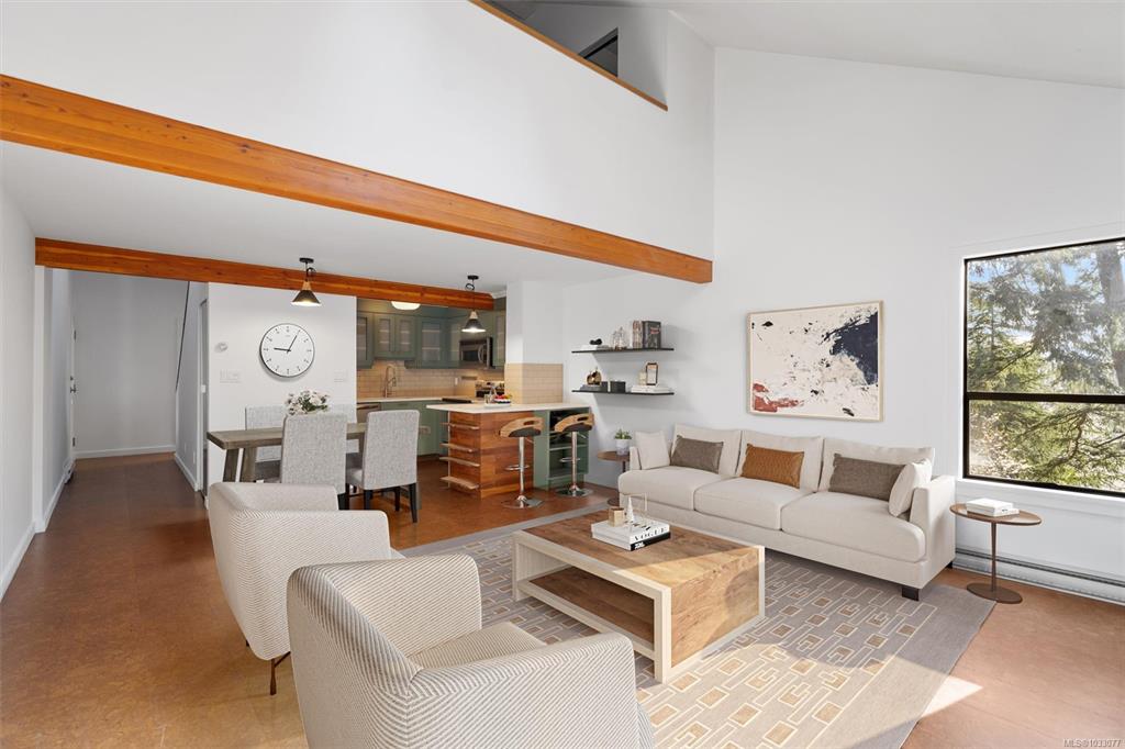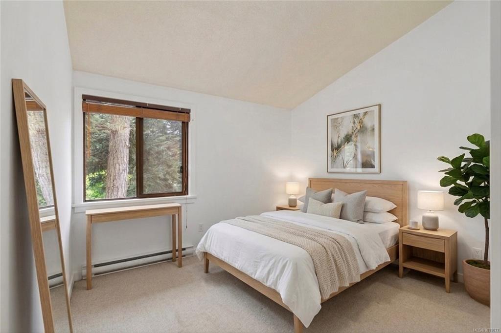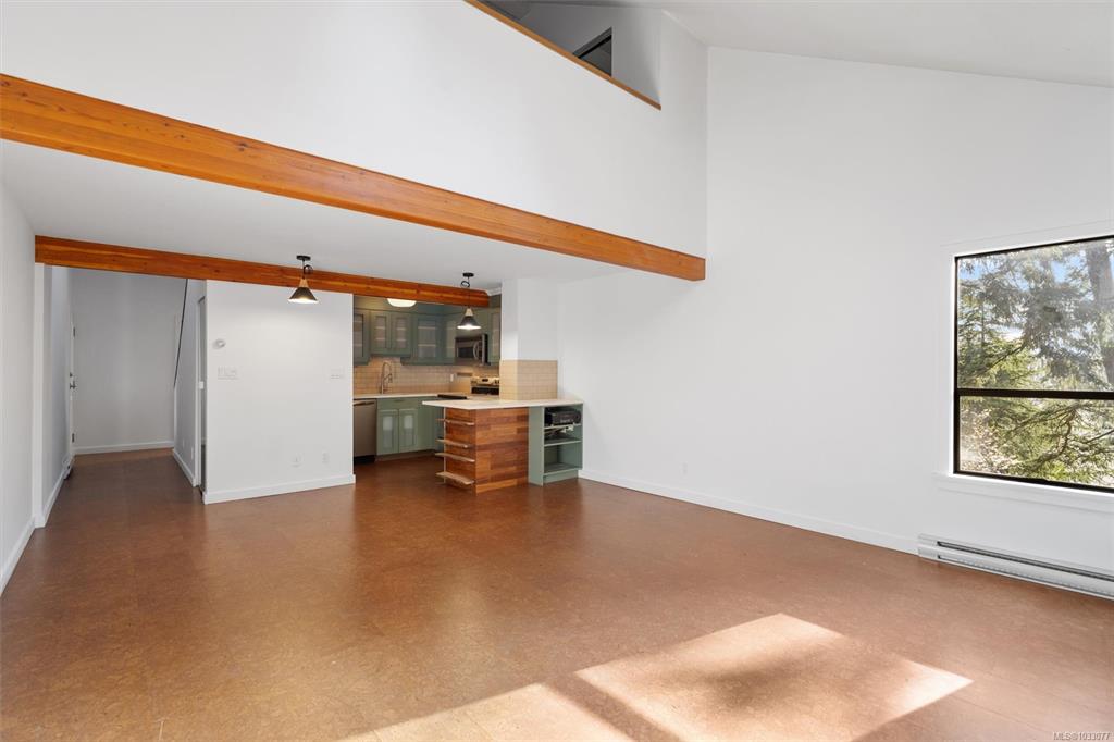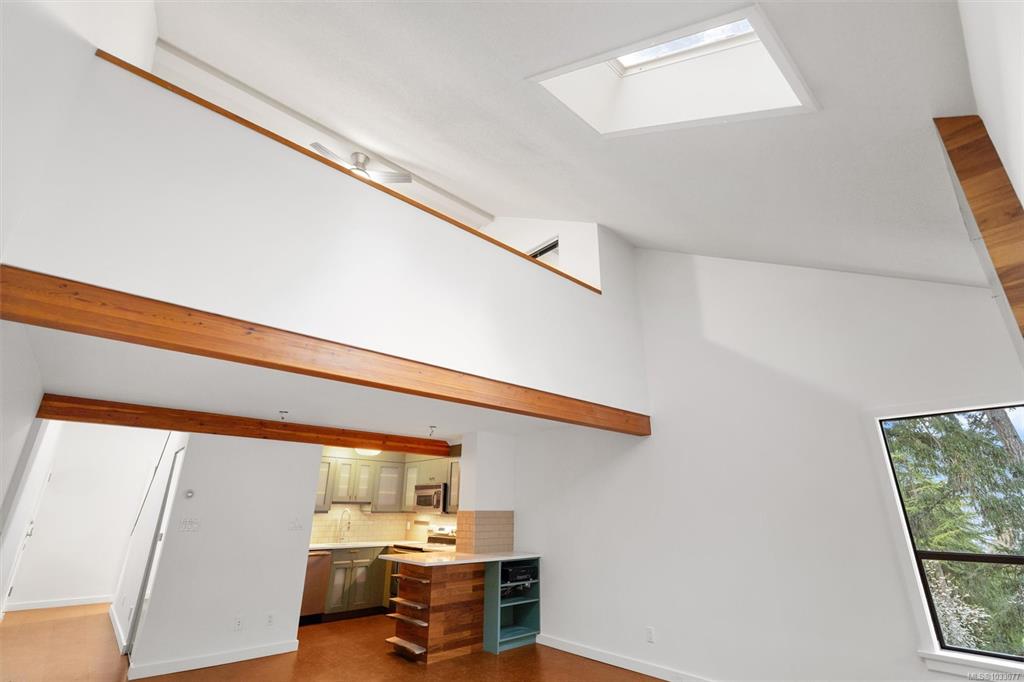 Tucked into a quiet, forested pocket of Sidney just steps from the marina on Harbour Road, this top floor 2 bed/2 bath townhome offers a rare mix of privacy and convenience. At 1,100 sq ft, the layout feels open and airy, with 14-foot ceilings, cork flooring, and an electric fireplace at the heart of the living and dining areas. The in-line kitchen features stainless steel appliances and quartz counters. The main level has a bedroom, 4-piece bath, and laundry. Upstairs is a loft-style primary bedroom with a...