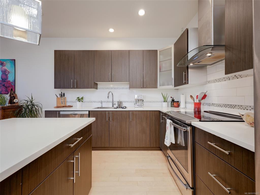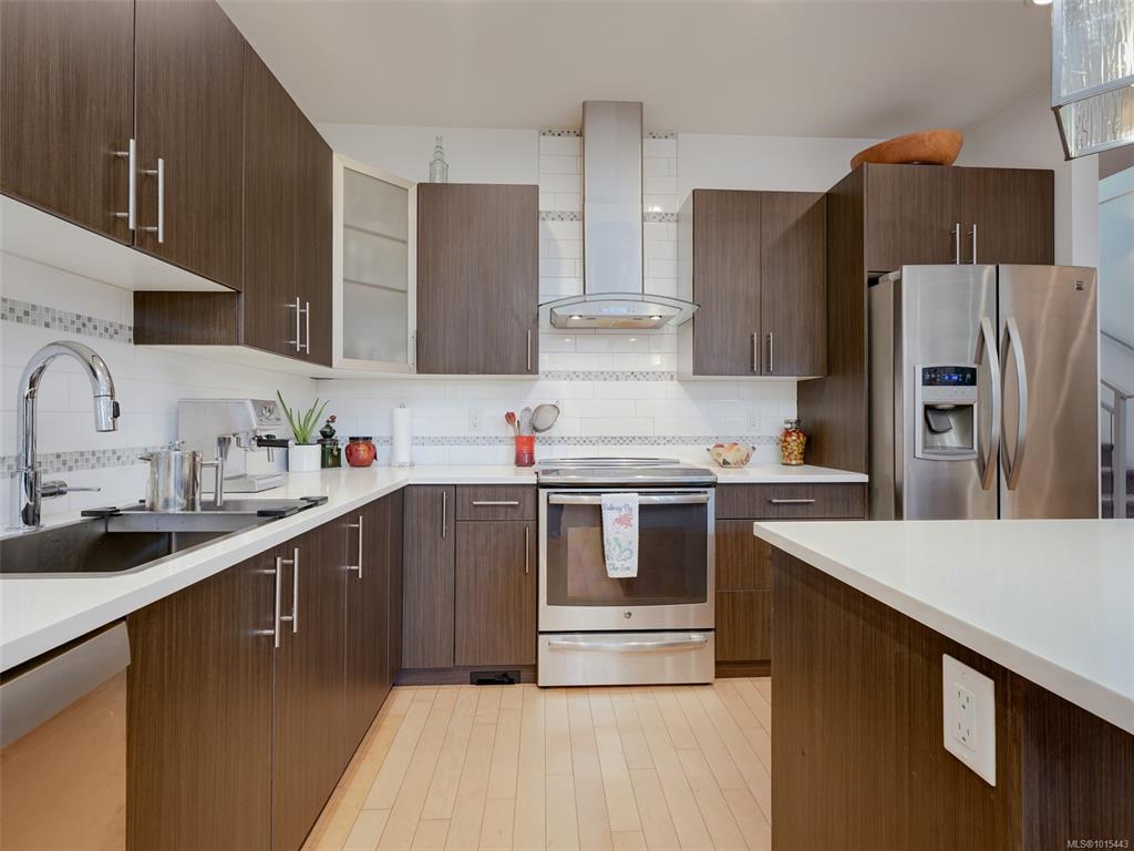 This Contemporary Private Townhome is in one of the most sought after boutique complexes in Sidney By the Sea. From the wood and stone exterior to the exceptional interior finishes, including oversize windows, maple floors and vaulted ceilings, this home makes for a very elegant lifestyle. The kitchen includes top end appliances with wood cabinets and quartz countertops flowing to an open concept living room and out to a very private garden patio. the Primary Suite features a soaker tub, walk in closet and ...