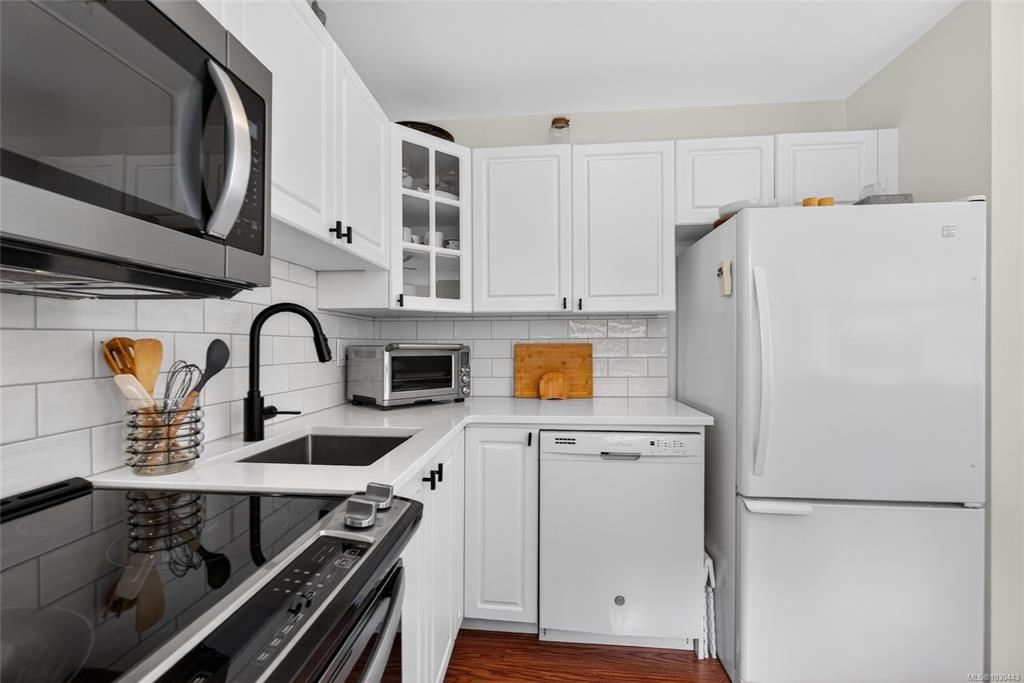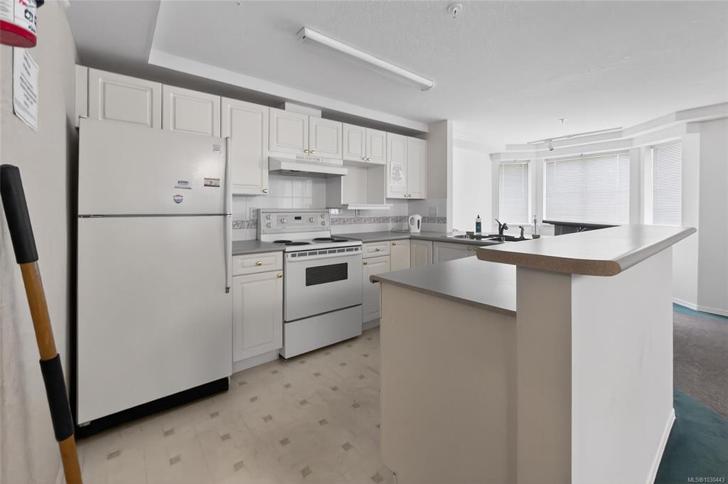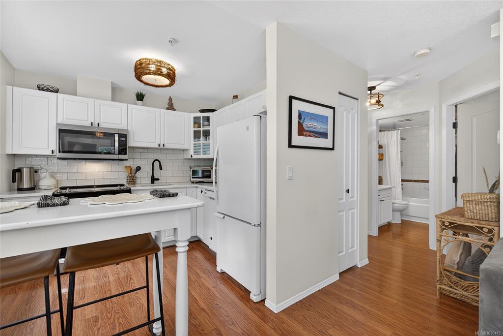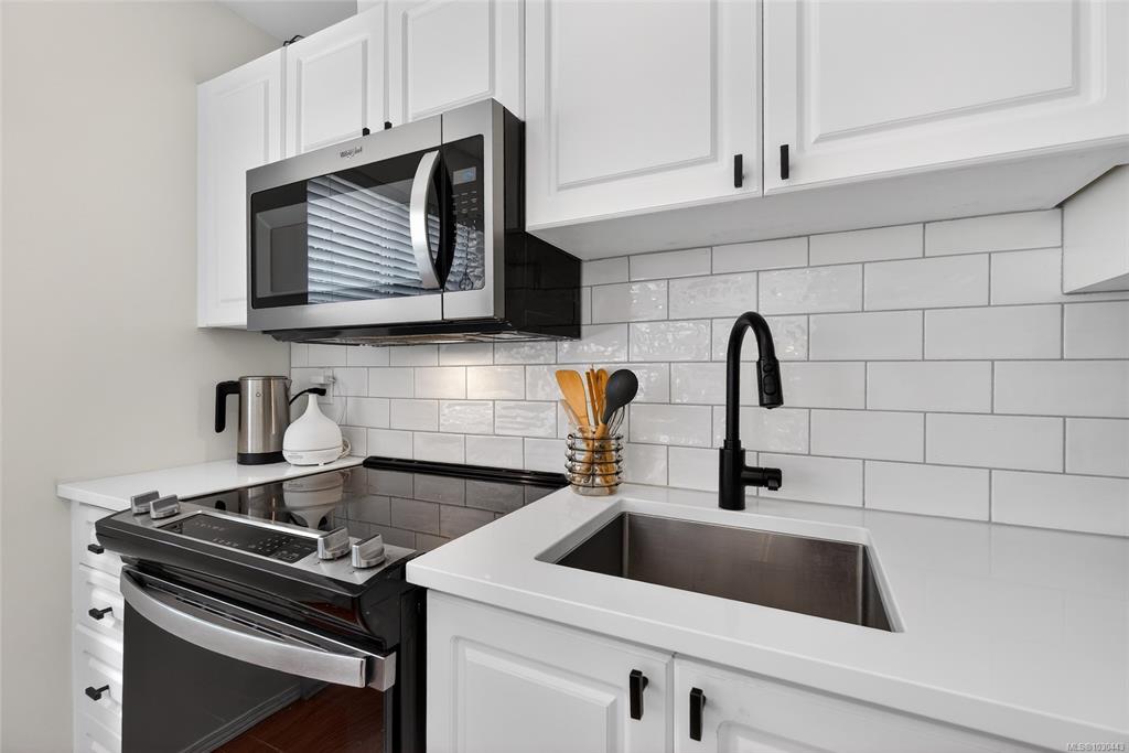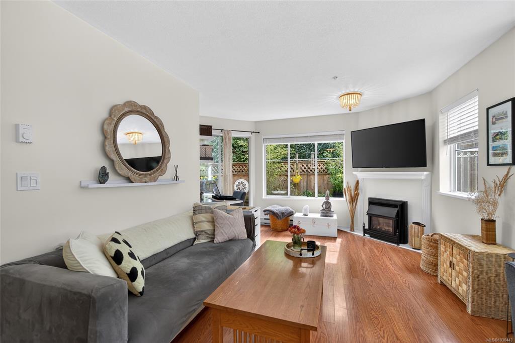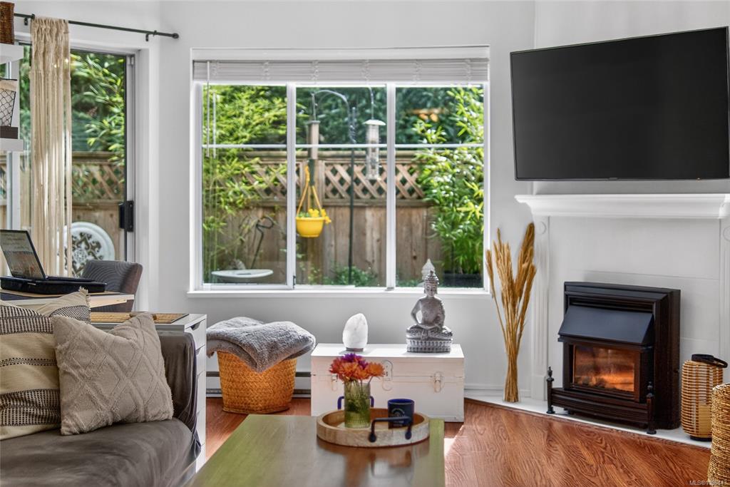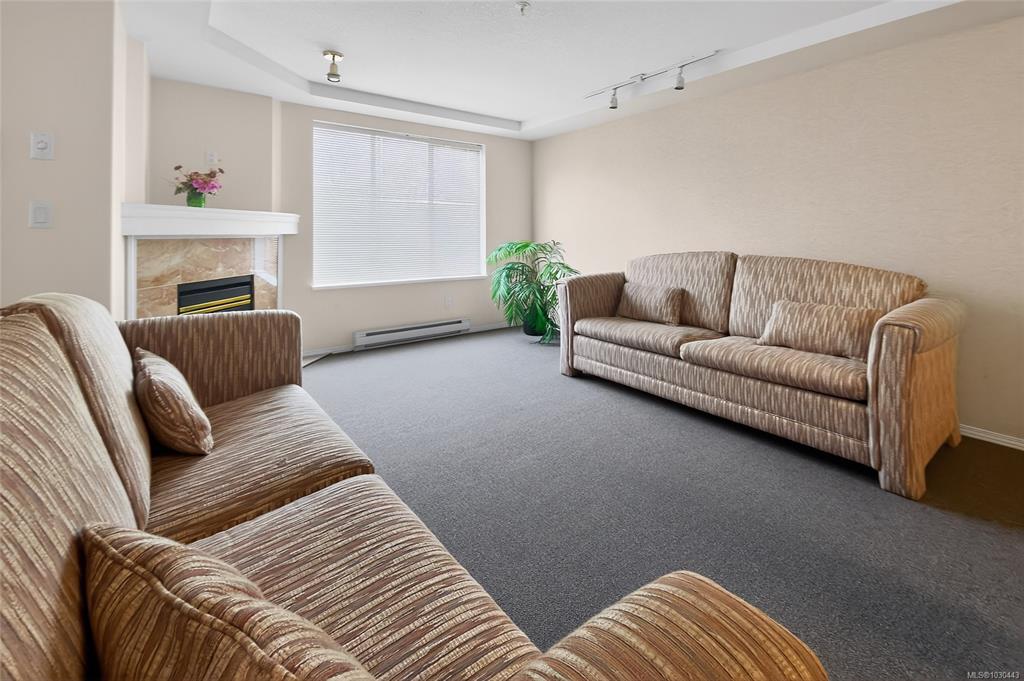 Fashion and function, this is a charmer! If you are looking to get into the market or ready to down size and appreciate style and comfort, this is the right one for you! This very efficient one bedroom condo with a huge and private patio features a cozy gas fireplace that heats the entire home and is included in your strata fee! There is an open concept kitchen, a good sized bedroom and bathroom and one parking and storage locker. In a healthy building that has a 6 year old roof and just finished re-done de...