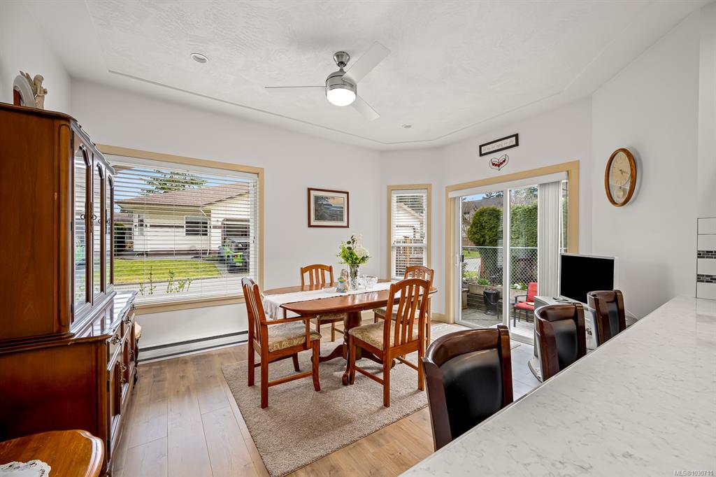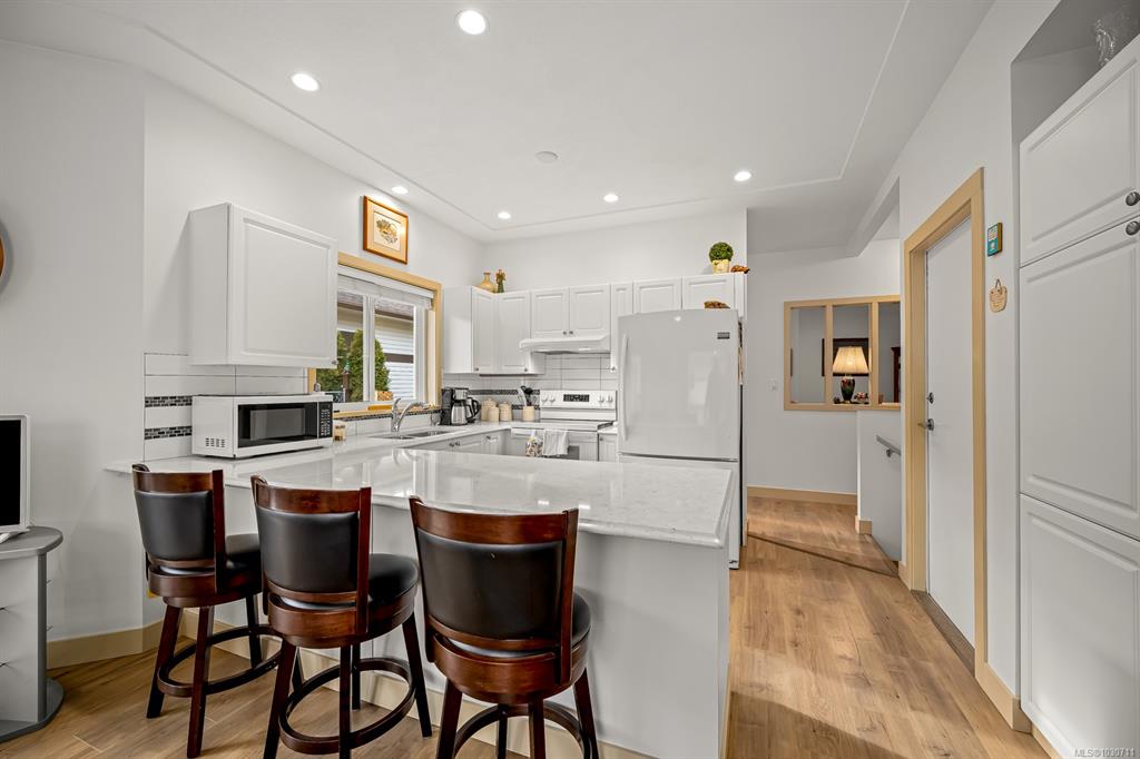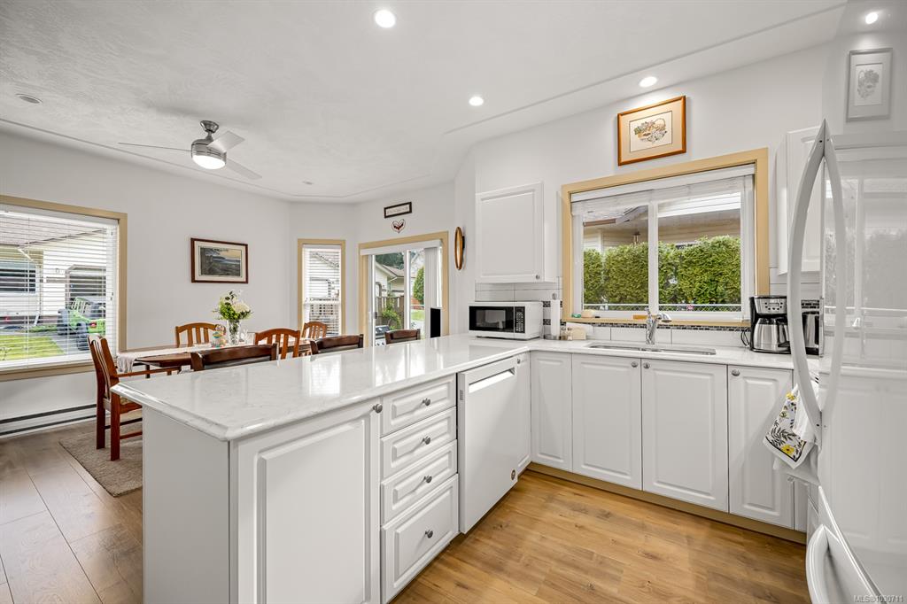 Tucked in a quiet complex, backing onto Ruth Master’s Greenway along the Puntledge River, this bright townhome offers sun soaked peaceful living. Over 2,300 sq ft, this 3 bed,3 bath townhome immediately feels like a place to call home. Sunlight pours through large windows, highlighting the airy 9’ ceilings & updated flooring. The cozy natural gas fireplace creates a warm, inviting living room. The kitchen, with quartz countertops & an eat-up breakfast bar offers great southeast exposure for morning sun. S...
