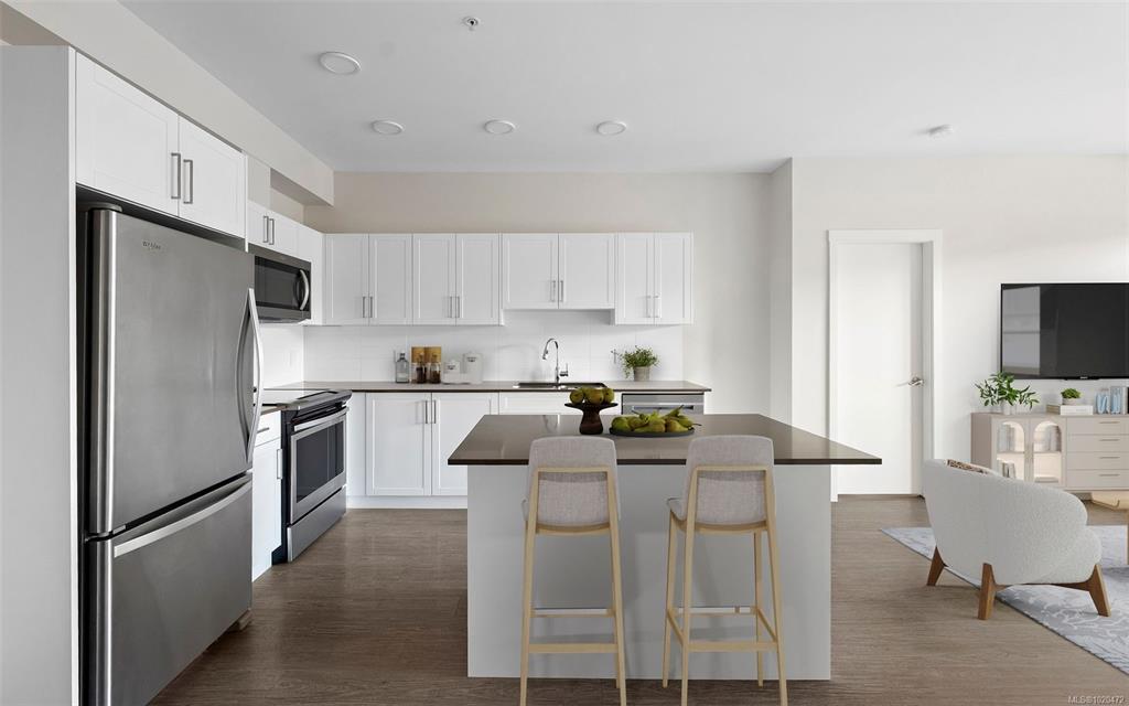Welcome to Unit 614 at Langford Tower! This is a 2020-built, top-floor unit offering west-facing views, modern design, and walkable convenience. This bright 2 bed, 2 bath layout features a spacious kitchen with abundant storage, a large island, and an open, bright living/dining area. Both bedrooms are generously sized and well separated for privacy. The primary suite includes a sizeable walkthrough closet leading to a 3-piece ensuite. Enjoy mountain views and sunsets from the 21 ft. balcony. This immaculate...