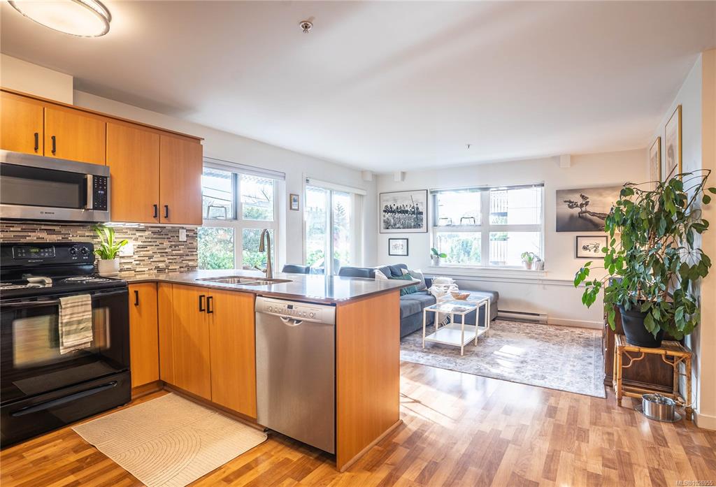 Beautifully maintained corner unit with 721 sq. ft. of bright, functional living in a well-managed 2007 building. This 2-bedroom home offers an open-concept layout with large windows filling the living and dining areas with natural light. The modern kitchen features quartz countertops, tile backsplash, stainless steel appliances, ample cabinetry, and a generous island perfect for entertaining. The living area opens to a private southeast-facing patio, ideal for morning coffee or relaxing outdoors. Laminate ...
