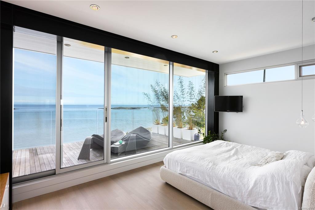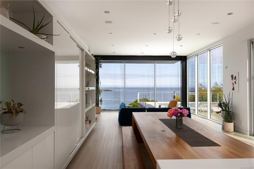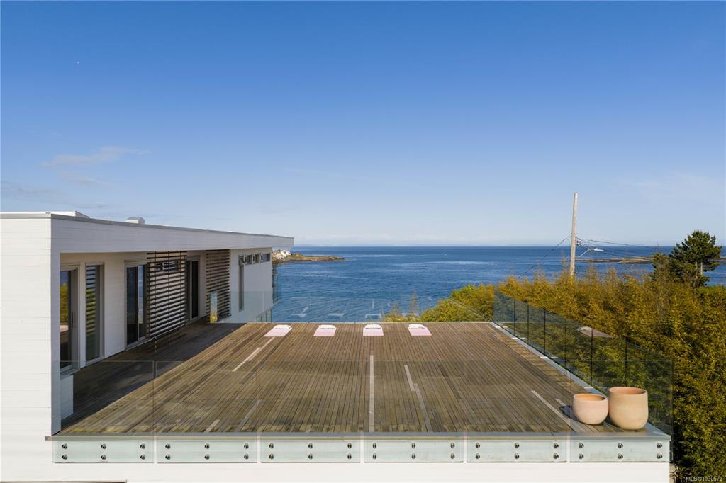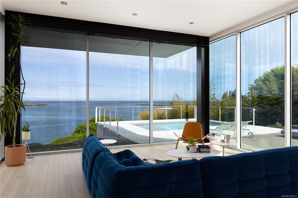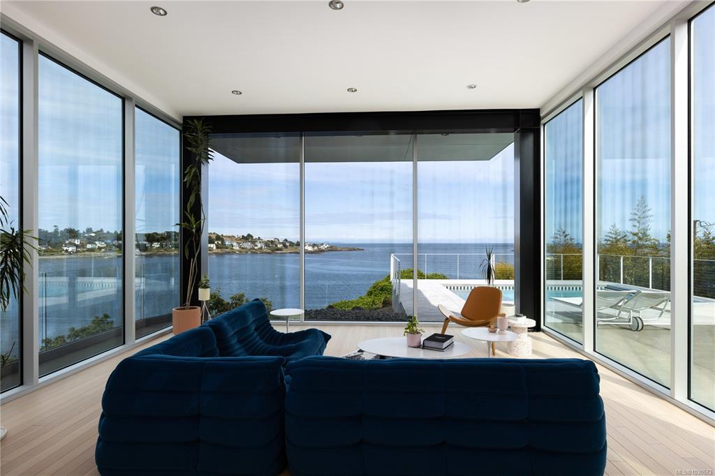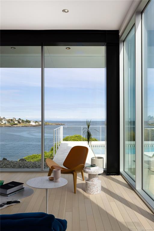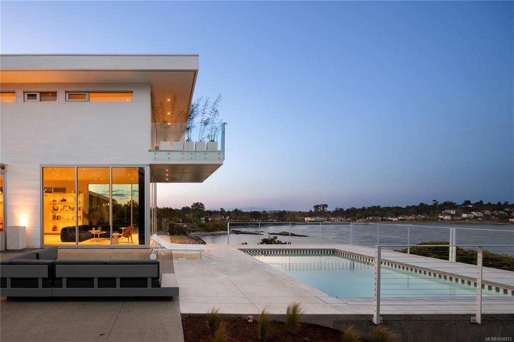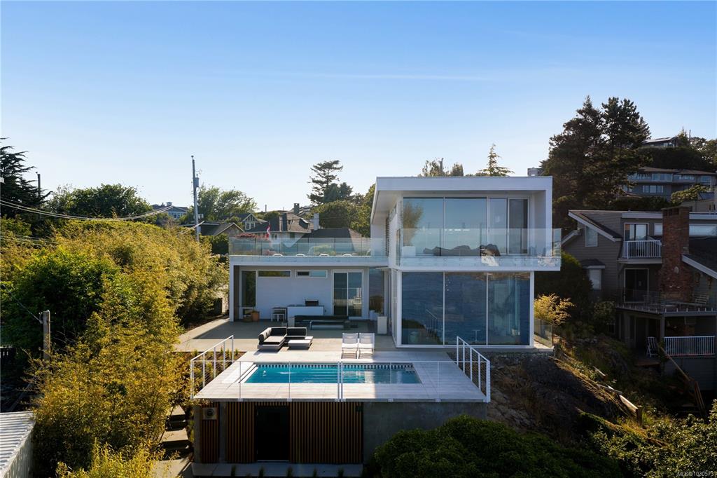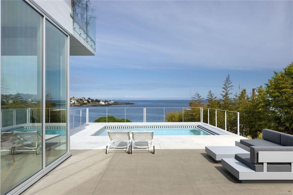 A striking example of modern minimalism perched on the southern edge of Oak Bay, this custom-built oceanfront residence offers panoramic views from nearly every room. Designed for seamless indoor-outdoor living, the main floor boasts 11’ ceilings and expansive glass walls that open onto multiple patios, a sleek swimming pool, and a dedicated gym/studio. The chef’s kitchen features integrated appliances and a massive island perfect for entertaining. Upstairs, the serene primary suite includes a walk-in close...