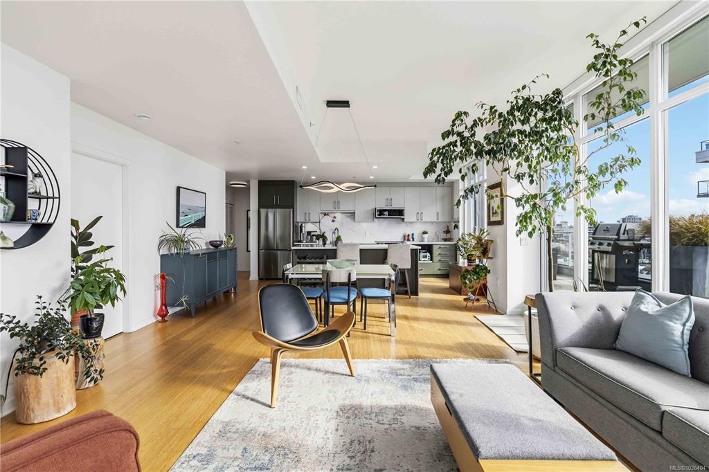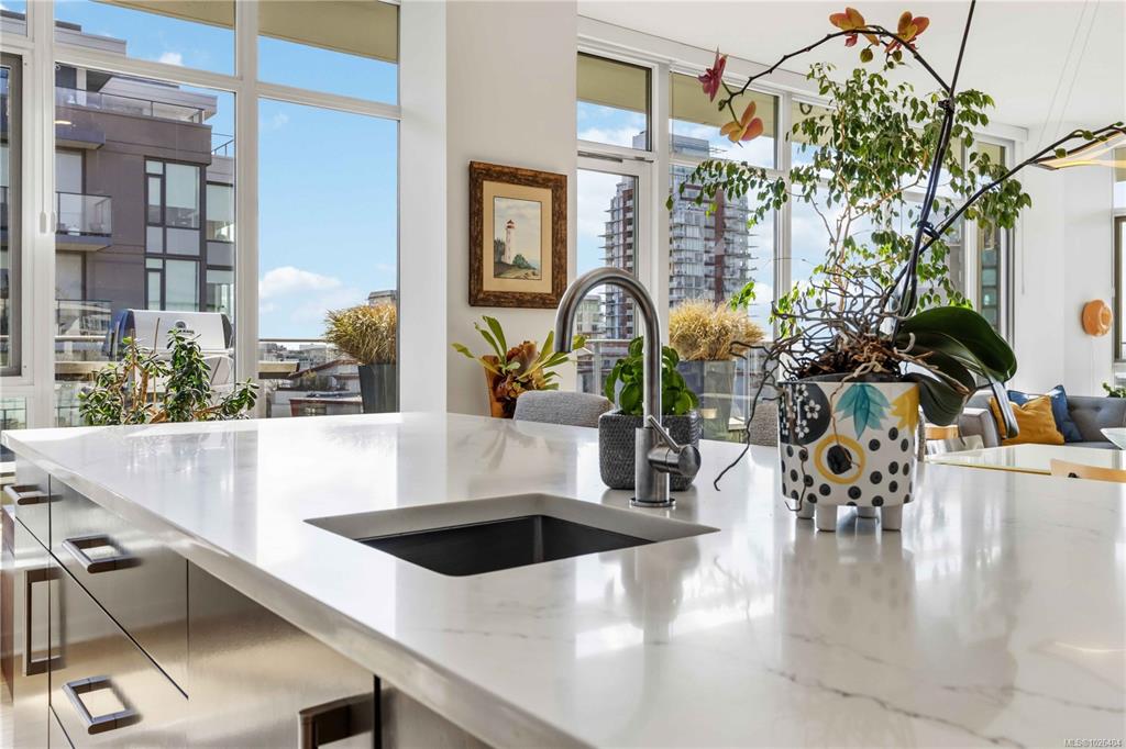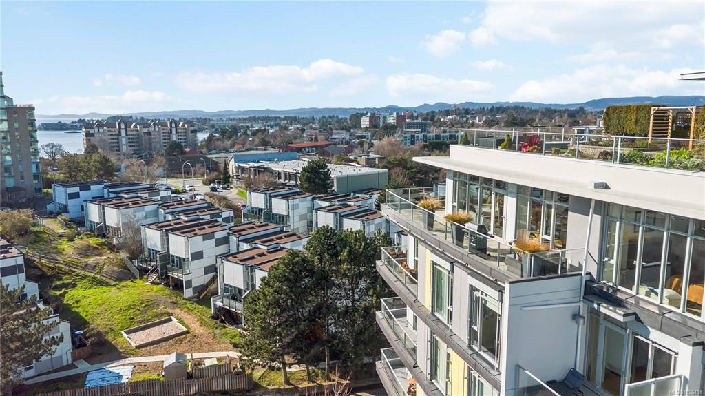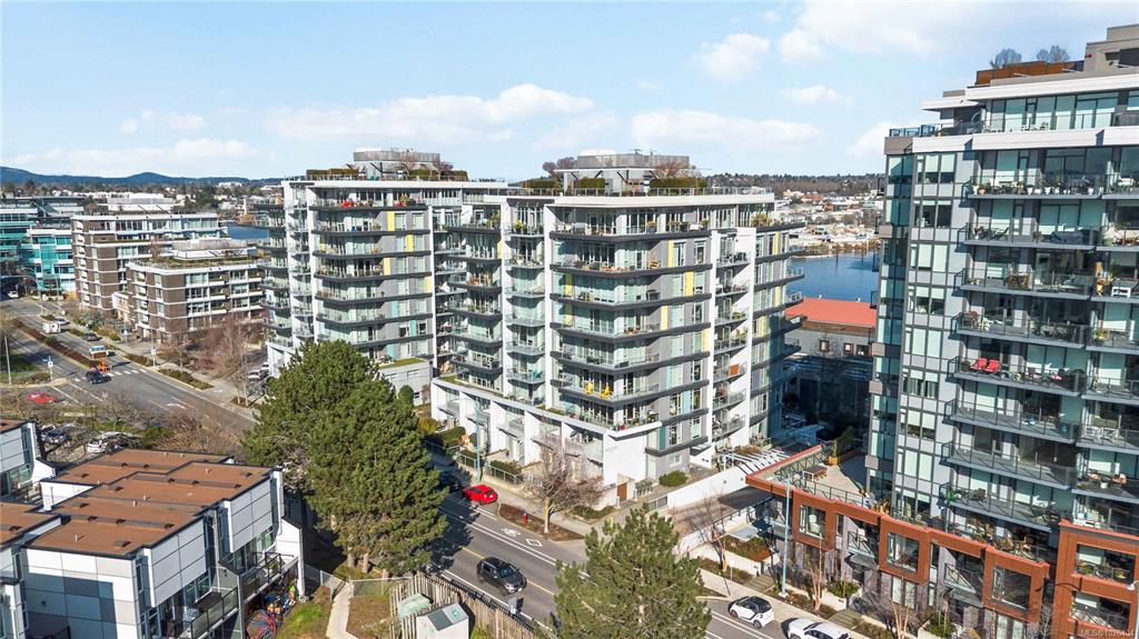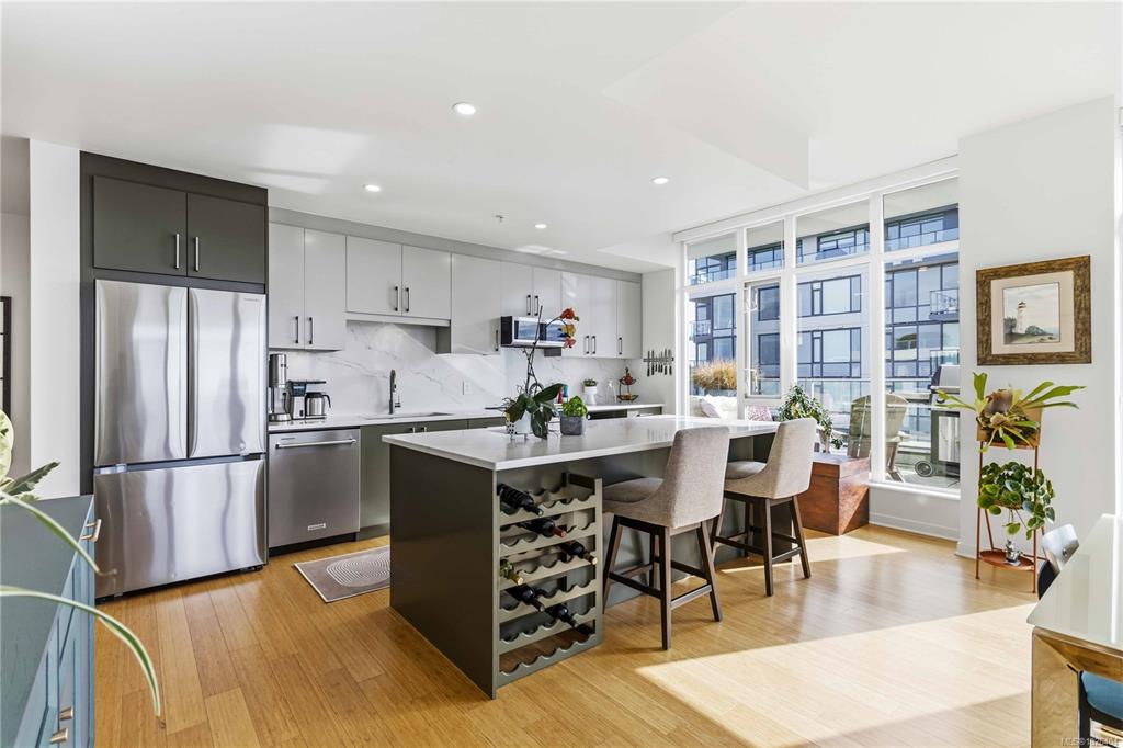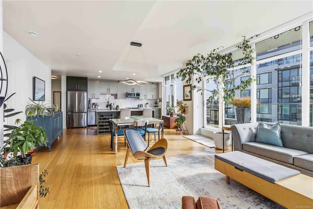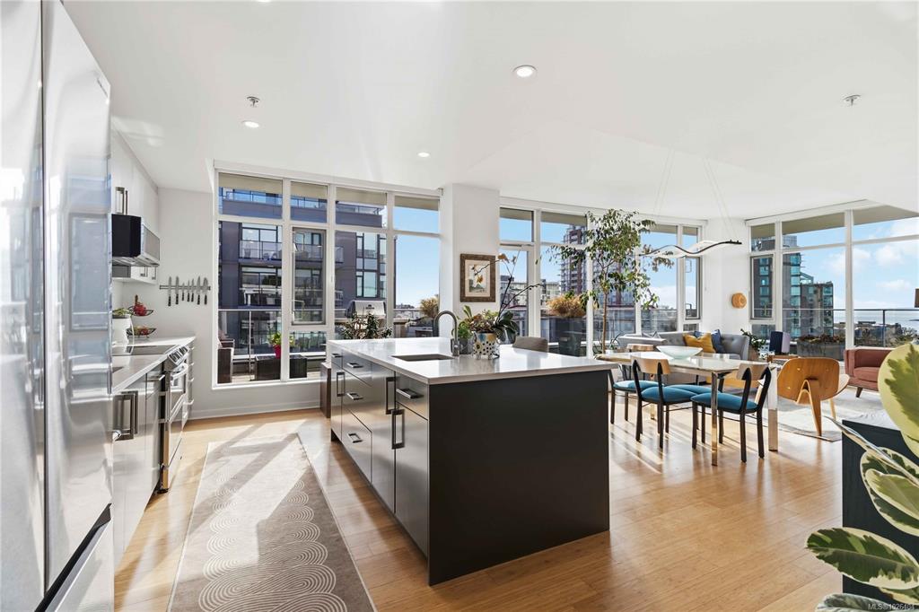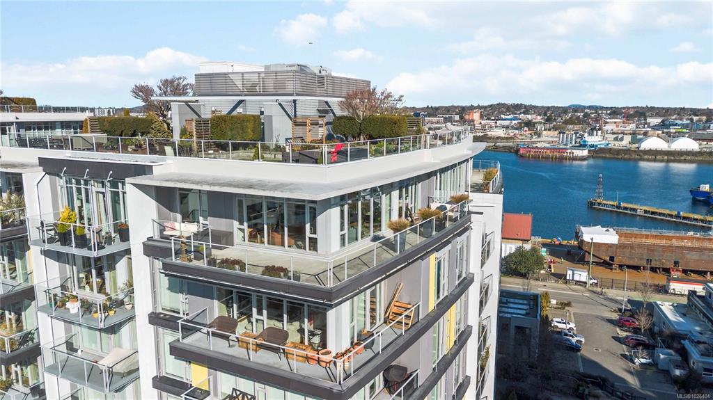 Dockside Green Penthouse — a rare opportunity to experience premier urban living. Enjoy panoramic views from this southwest corner suite in a sustainably built steel-and-concrete building. This sun-filled 1,253 sq. ft. condo offers exceptional outdoor living with a large wraparound deck and dedicated rooftop garden oasis. The stylish kitchen features solid-surface counters with matching backsplash, SS appliances, and a large island for entertaining. Floor-to-ceiling windows brighten the open living and dini...