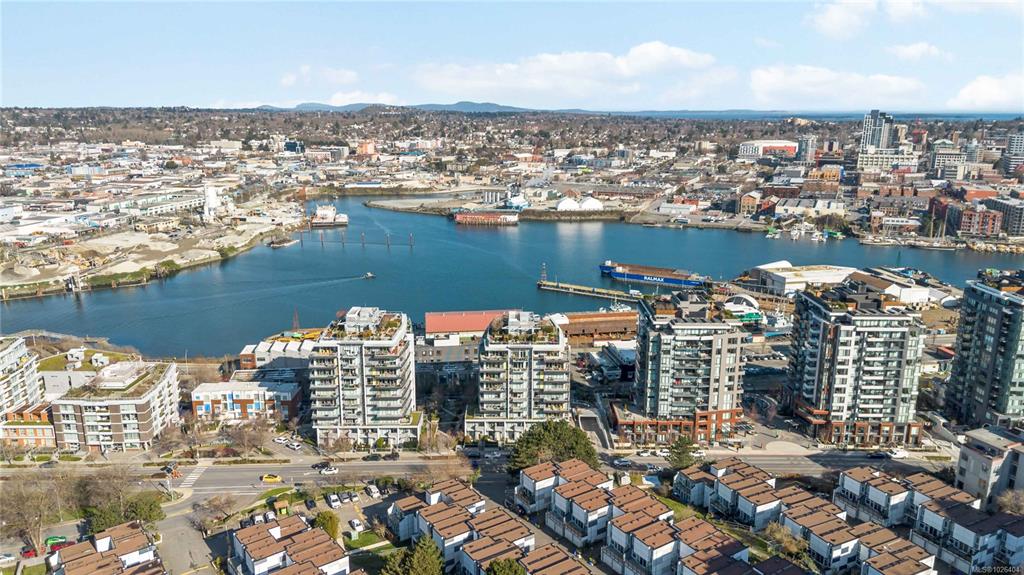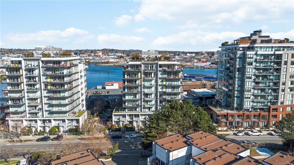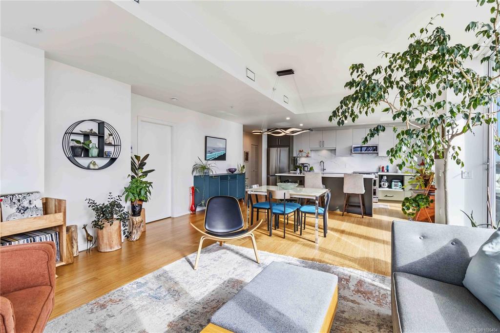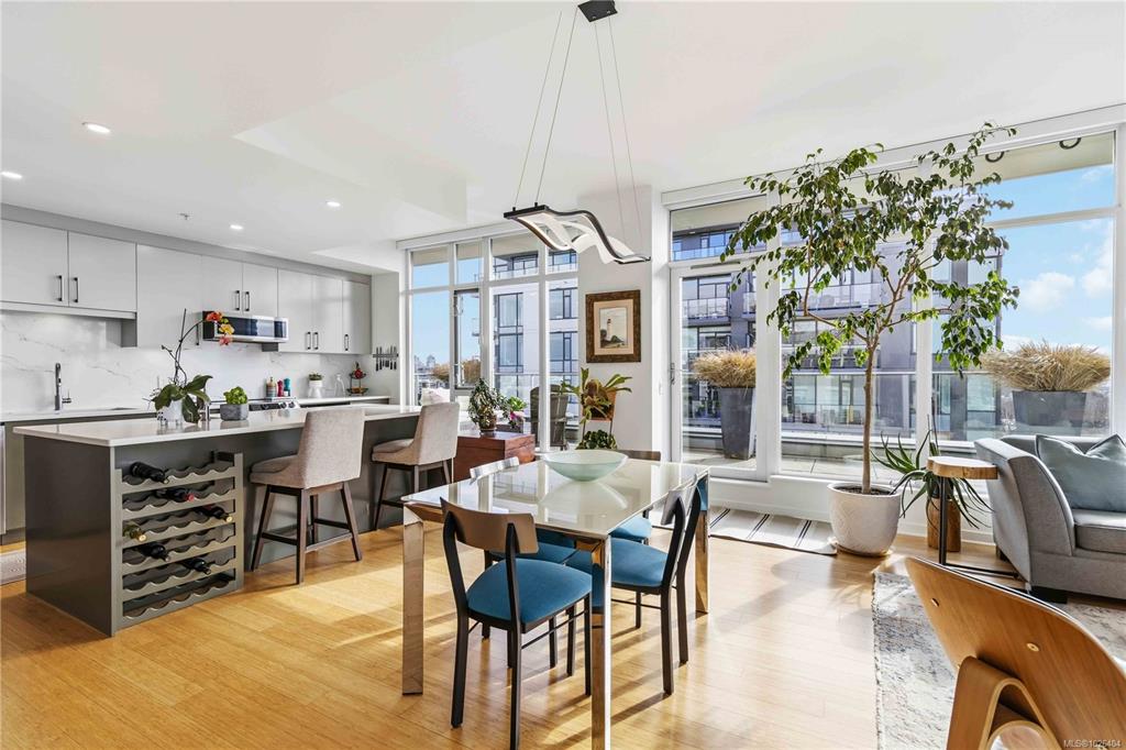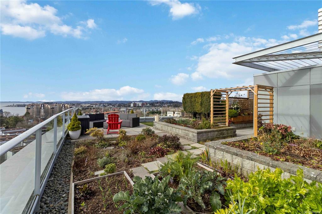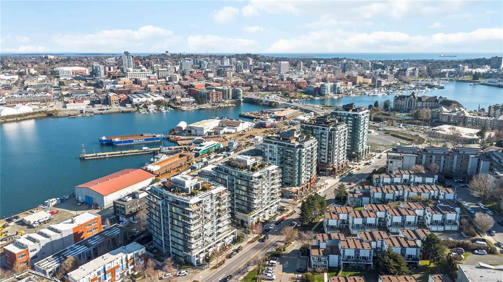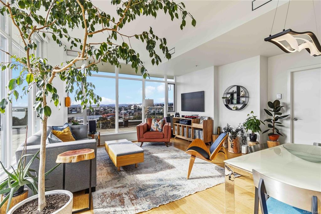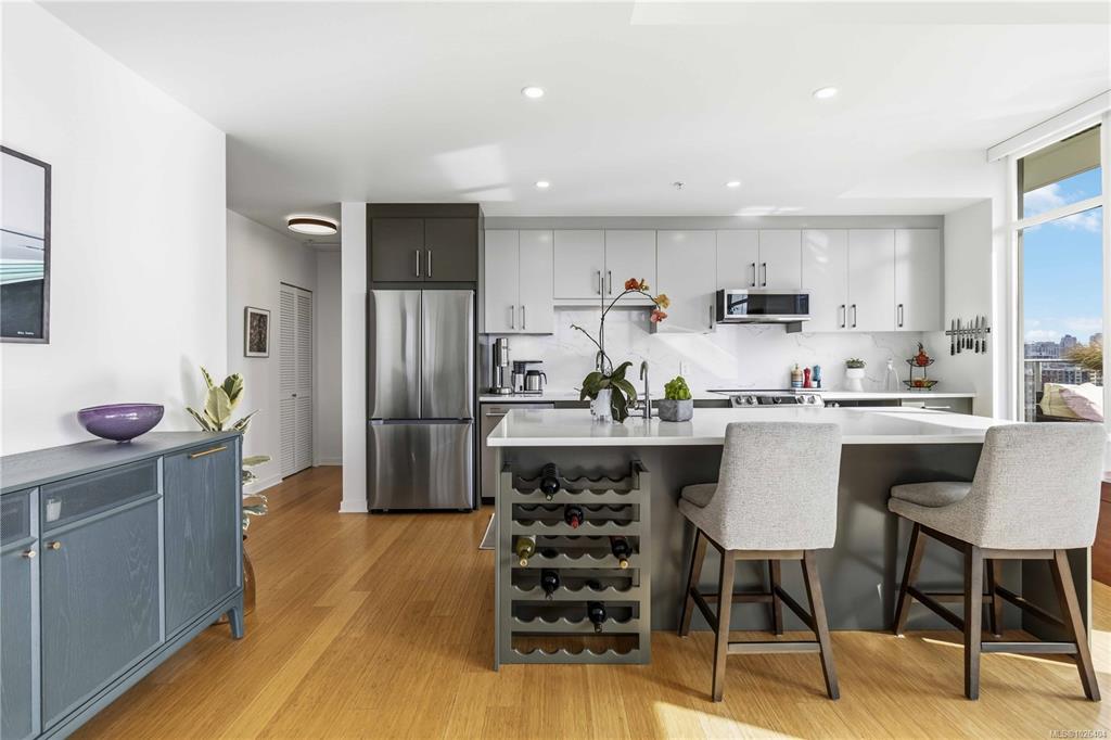 Dockside Green Penthouse — a rare opportunity to experience premier urban living. Enjoy panoramic views from this southwest corner suite in a sustainably built steel-and-concrete building. This sun-filled 1,253 sq. ft. condo offers exceptional outdoor living with a large wraparound deck and dedicated rooftop garden oasis. The stylish kitchen features solid-surface counters with matching backsplash, SS appliances, and a large island for entertaining. Floor-to-ceiling windows brighten the open living and dini...