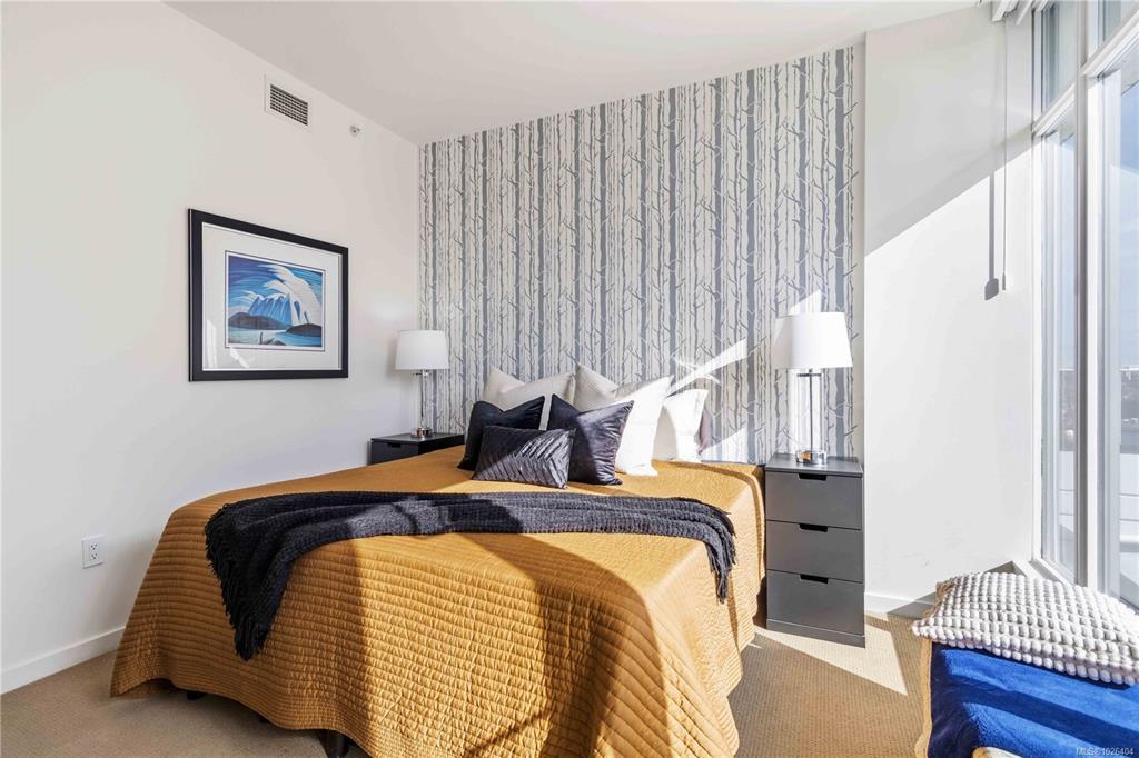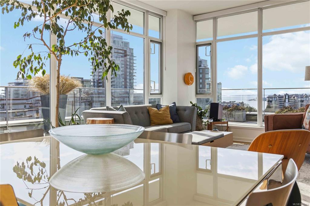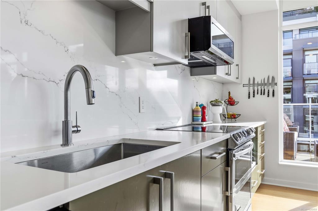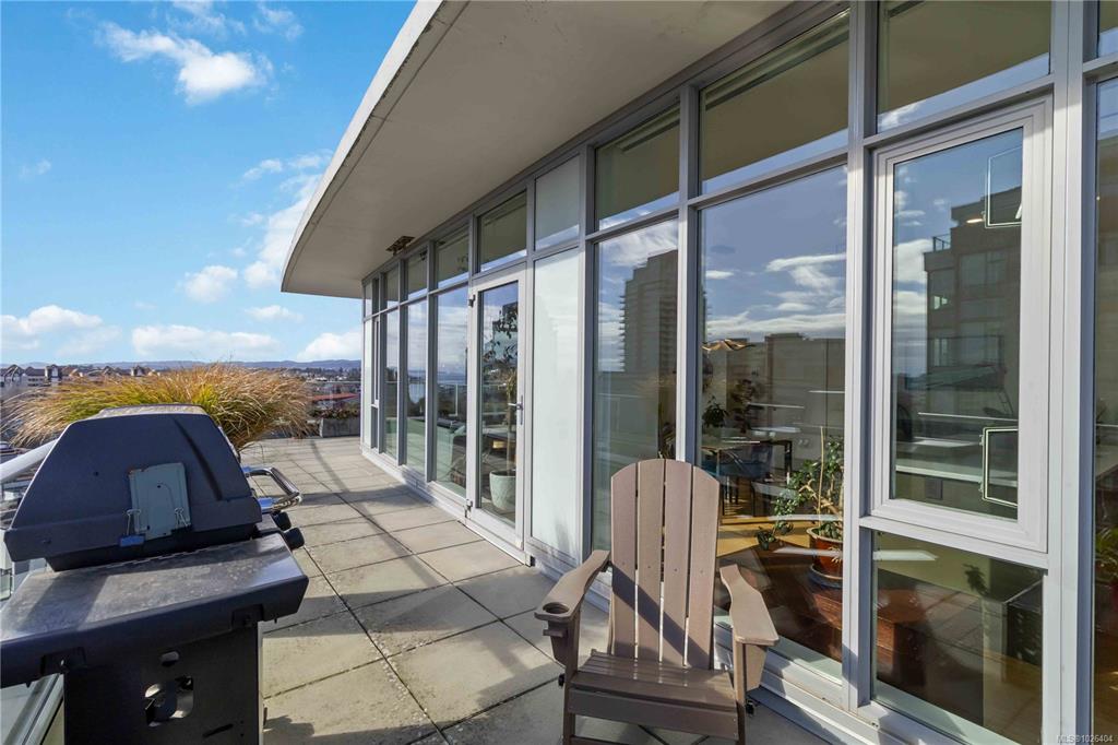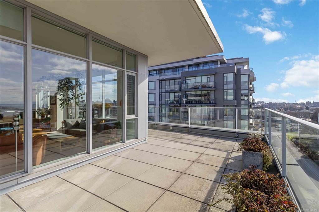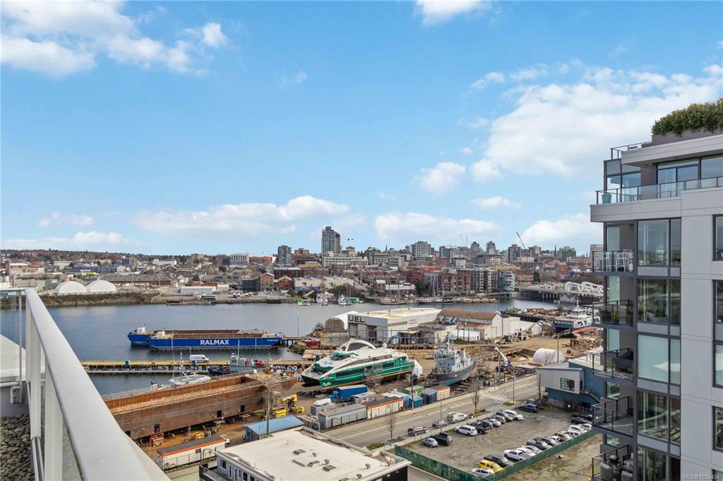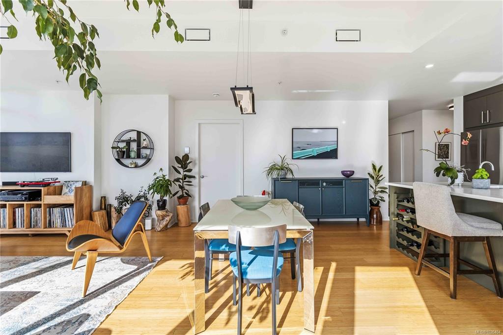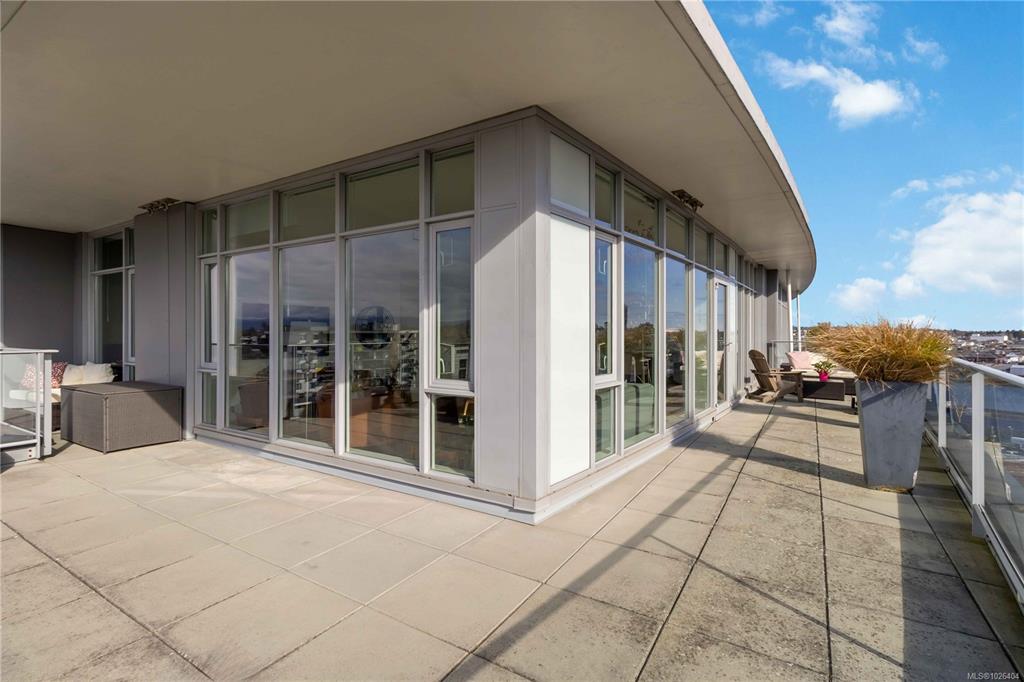 Dockside Green Penthouse — a rare opportunity to experience premier urban living. Enjoy panoramic views from this southwest corner suite in a sustainably built steel-and-concrete building. This sun-filled 1,253 sq. ft. condo offers exceptional outdoor living with a large wraparound deck and dedicated rooftop garden oasis. The stylish kitchen features solid-surface counters with matching backsplash, SS appliances, and a large island for entertaining. Floor-to-ceiling windows brighten the open living and dini...