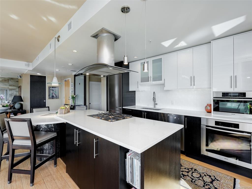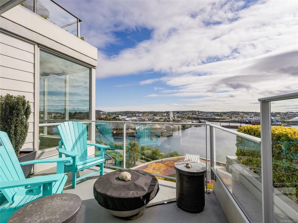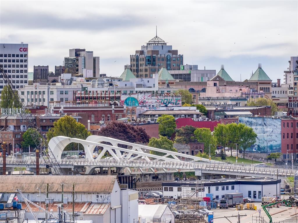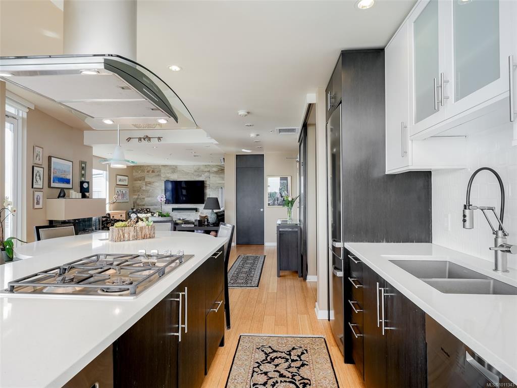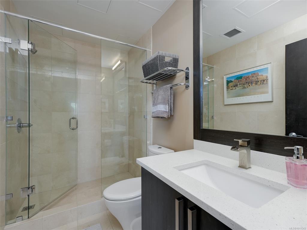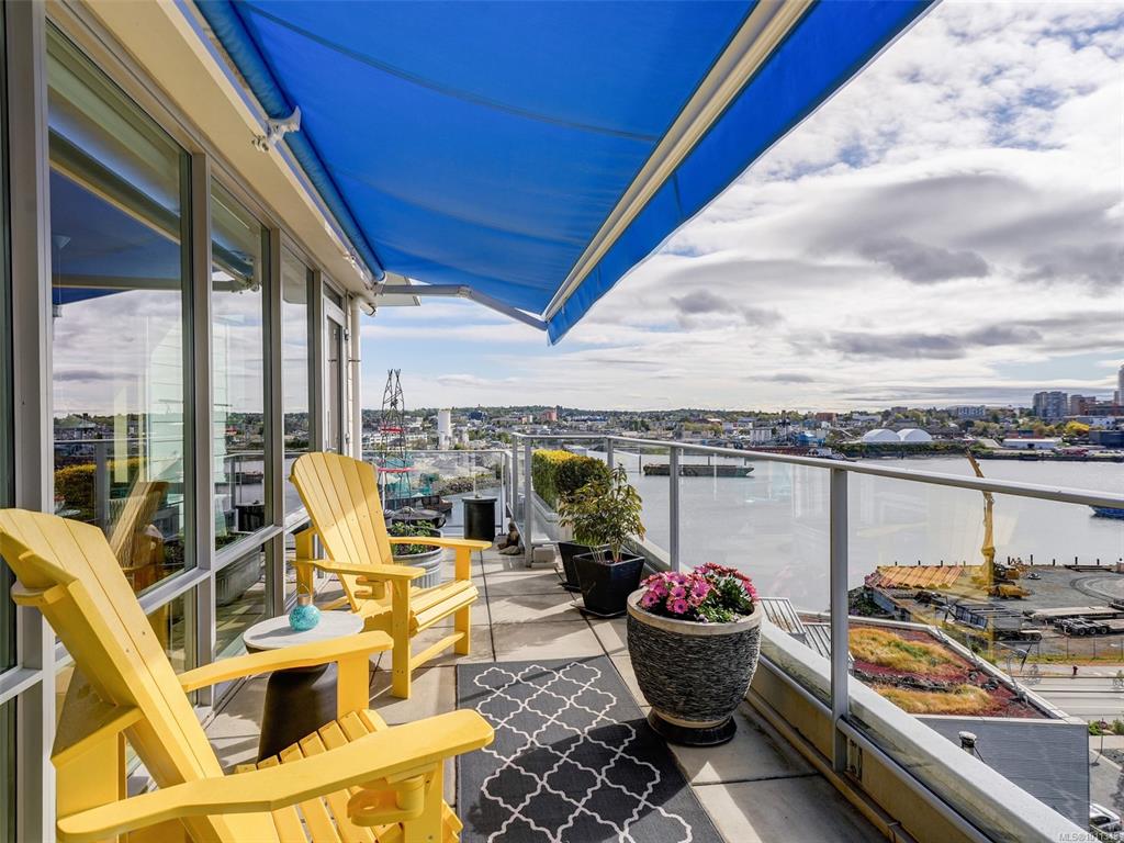 A rare offering in Dockside Green—this meticulously maintained sub-penthouse blends thoughtful updates w/ refined style. Built in 2008, this 1,181 sqft 2-bed + converted den condo offers a bright, open layout with high-end finishes. Enjoy heated bathrm floors, a steam shower, quartz counters, Miele appliances, custom Thomas & Birch cabinetry, a built-in Sonos sound system, Connect 4 automation, new electric blinds & awnings, and one of the few decks with a dedicated BBQ gas line. The large deck offers stunn...