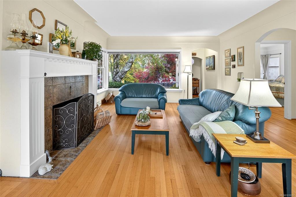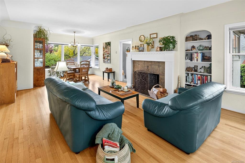 NEW LISTING! Updated Charm in one of Victoria's fav areas! Boasting a large, yet cosy living & dining area w large picture windows, arched doors, coved ceilings, wood mantel & built-ins. Updates: Kitchen 2011, Perimeter Drains 2011, Roof 2016, Hot water tank 2024, Gas to house, New paint in bath, New back deck & stairs, refinished Oak flrs. Chef kitchen w soft green marbled stone counter, light slate flr, wrap-around windows, pendant lights, custom wd cabinets w pantry & inserts. Lux Fisher Paykel appls: 5-...