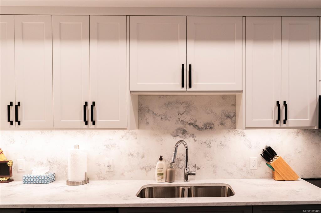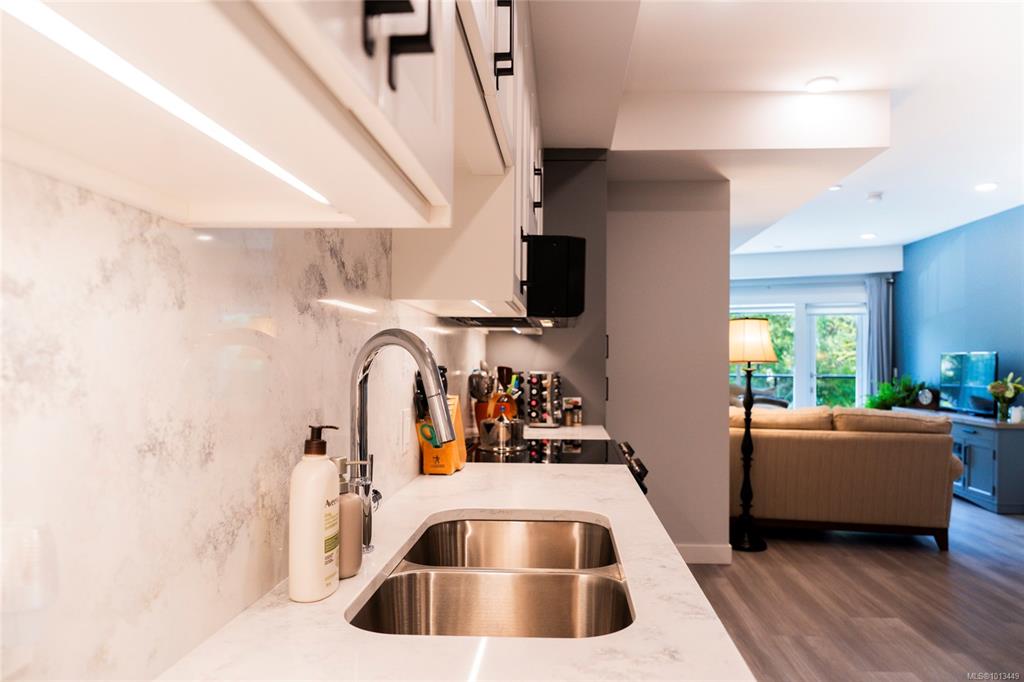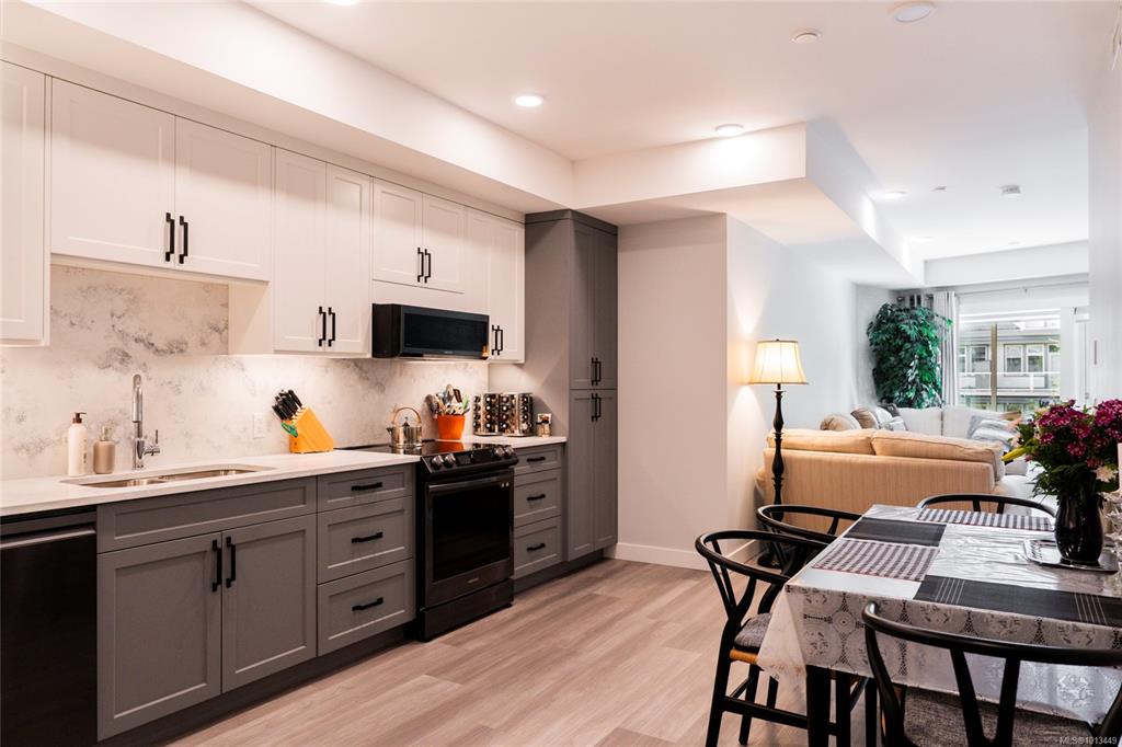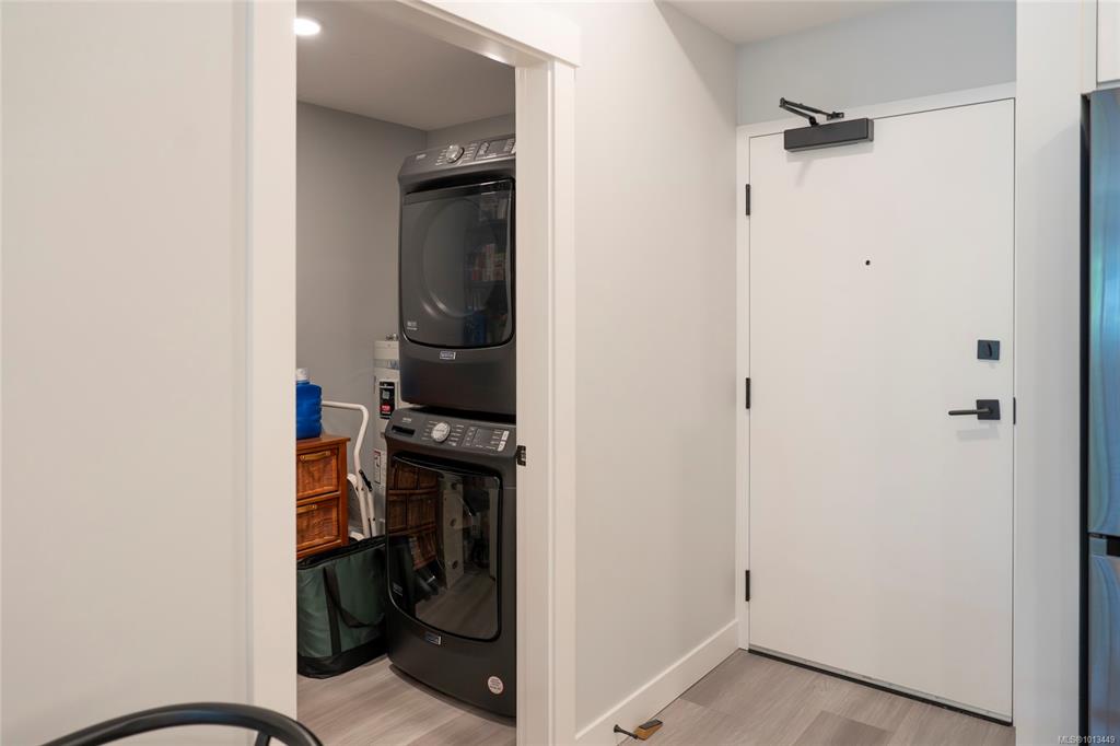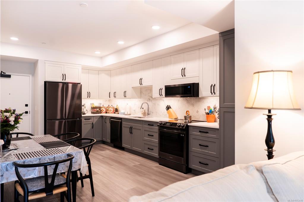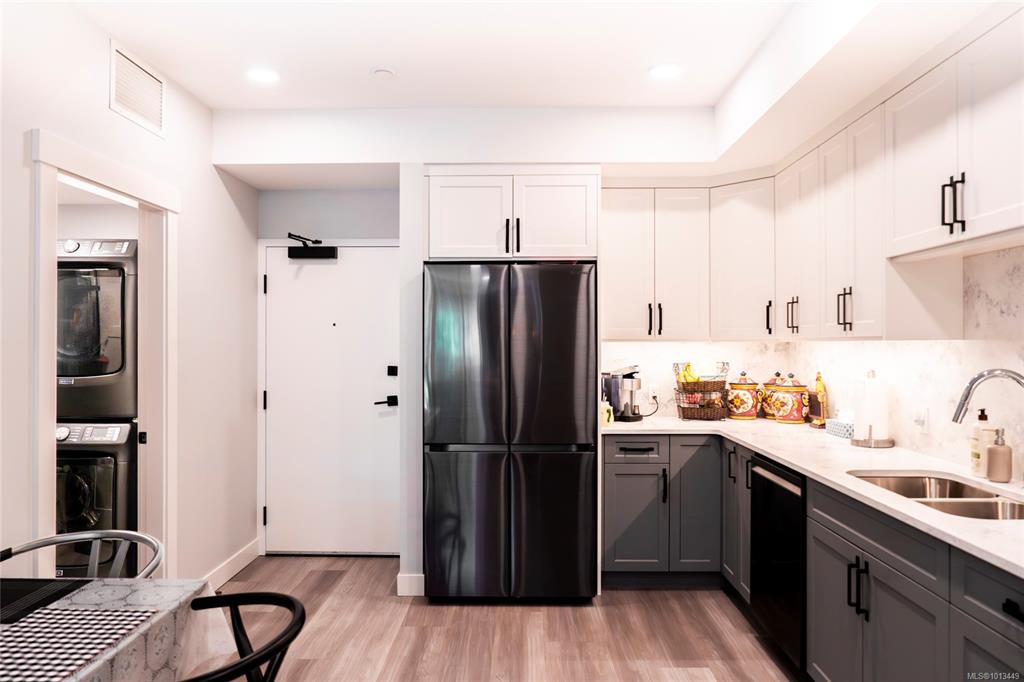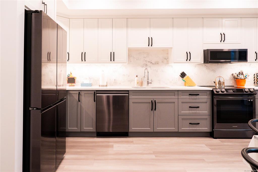Steps from Nanaimo's Long Lake and North End amenities, this condo pairs modern design with a great location. Expansive windows brighten the open layout, while the kitchen is equipped with top-of-the-line Samsung stainless steel appliances, elegant quartz countertops, and a matching quartz backsplash for a clean, contemporary look. The open living space extends onto the deck through European-style exterior glass doors, perfect for extending your living space outdoors. This condo also features a one-of-a-kin...