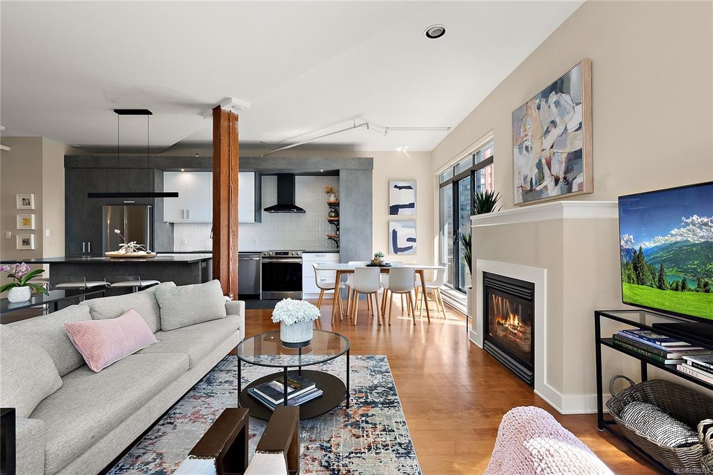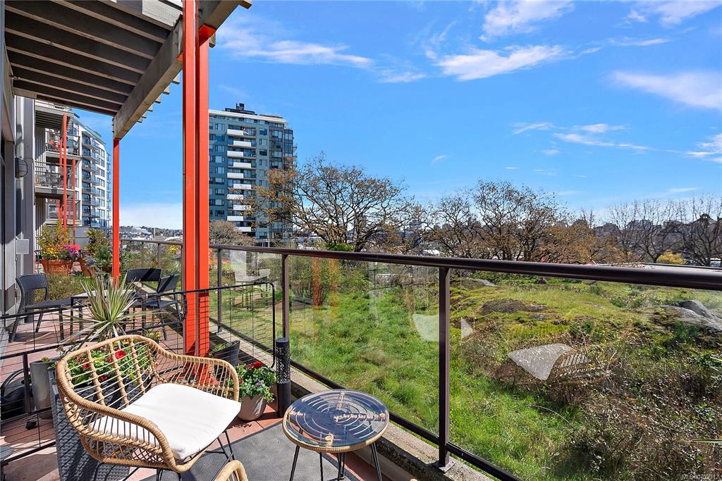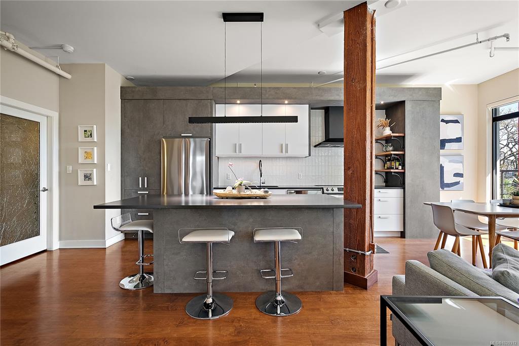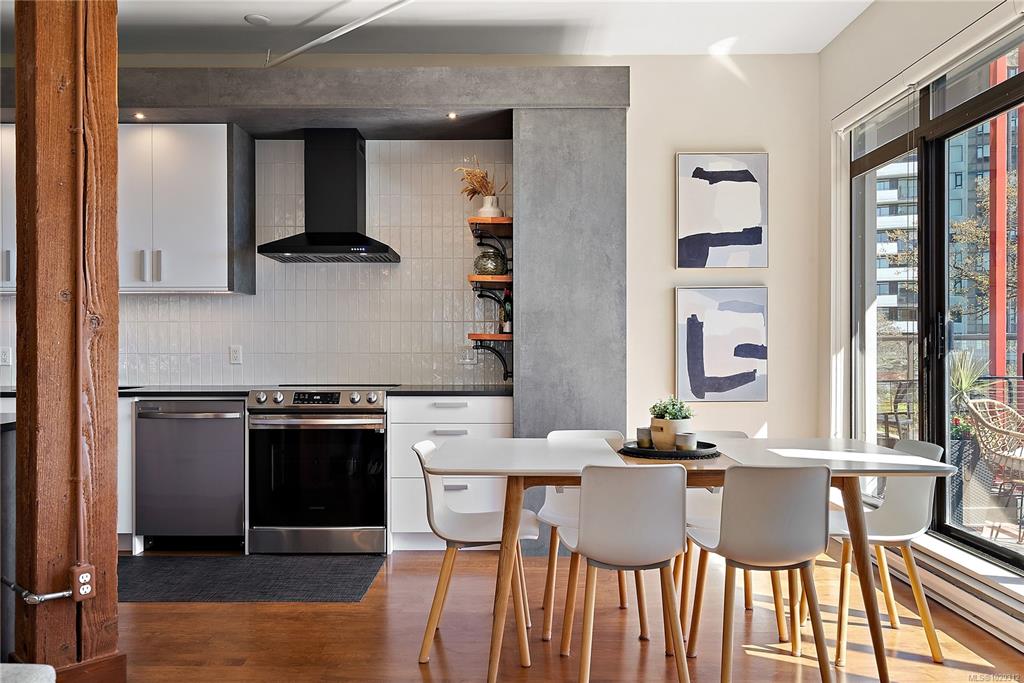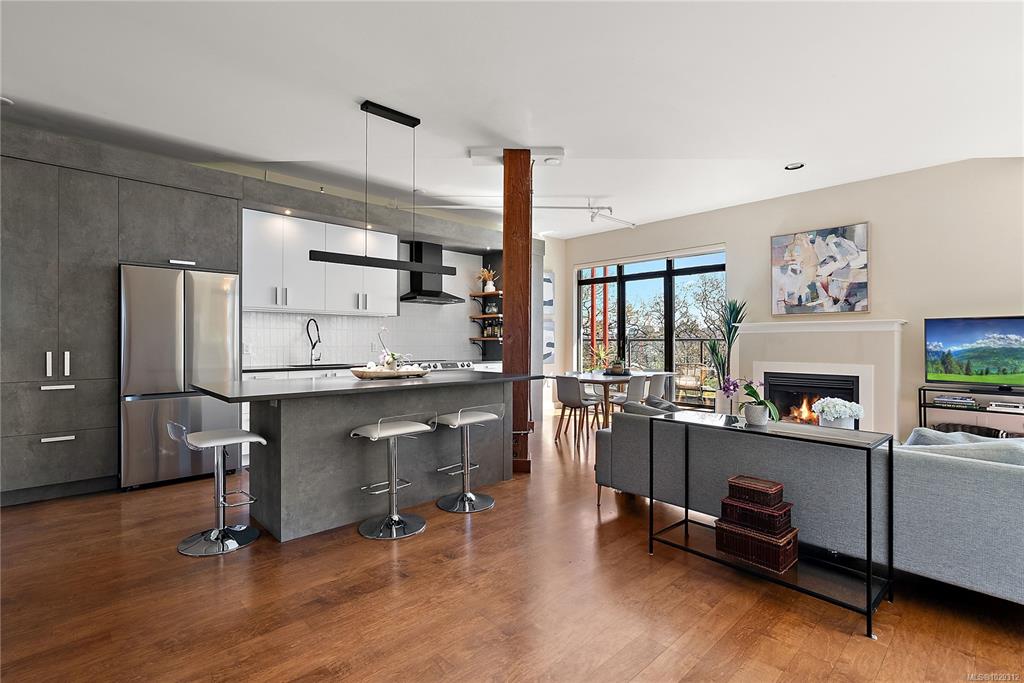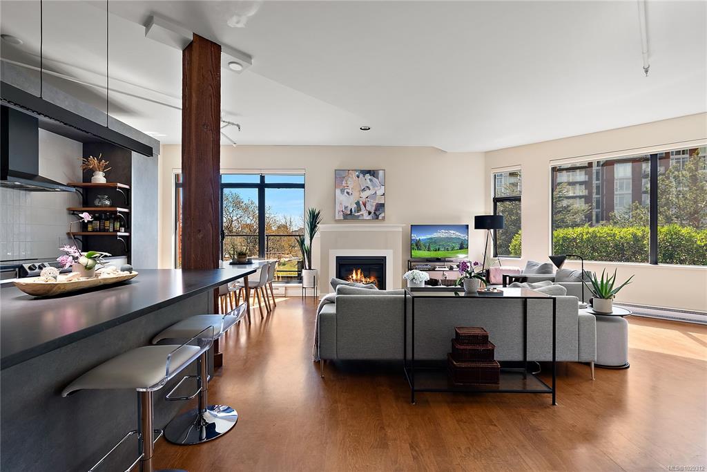 Welcome to The Edge - an exclusive boutique building in trendy Vic West. This fully renovated NY-style loft offers refined 1-level living w/ soaring 10' ceilings, exposed fir beams & expansive windows flooding the home w/ natural light. A designer kitchen anchors the open layout, featuring soapstone counters, island w/ bar seating, new premium SS appliances & extensive custom cabinetry. The living area has gas fireplace, maple hardwood & private patio w/ gas BBQ hookup & overlooking a protected Garry Oak pa...