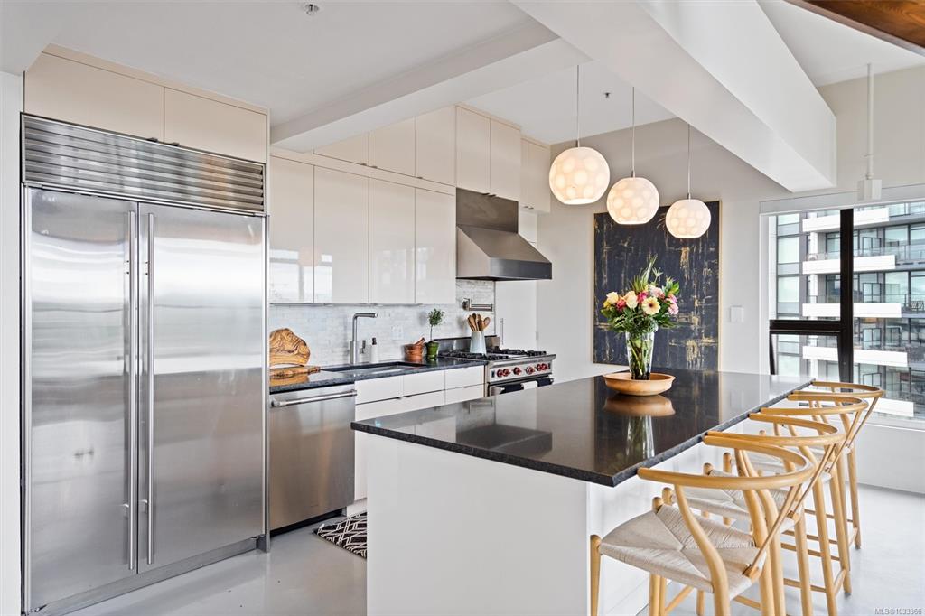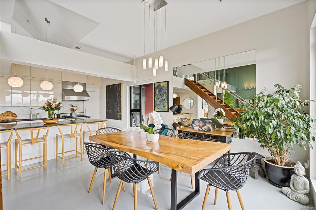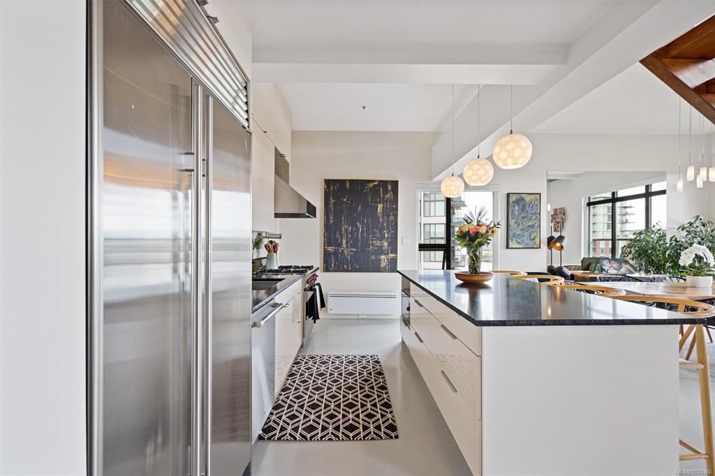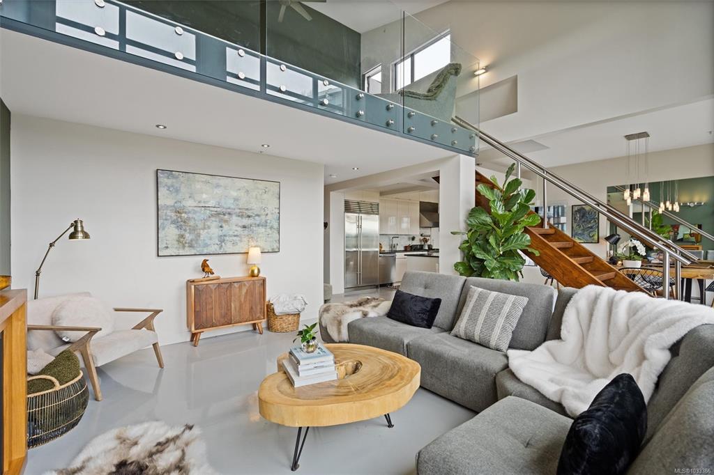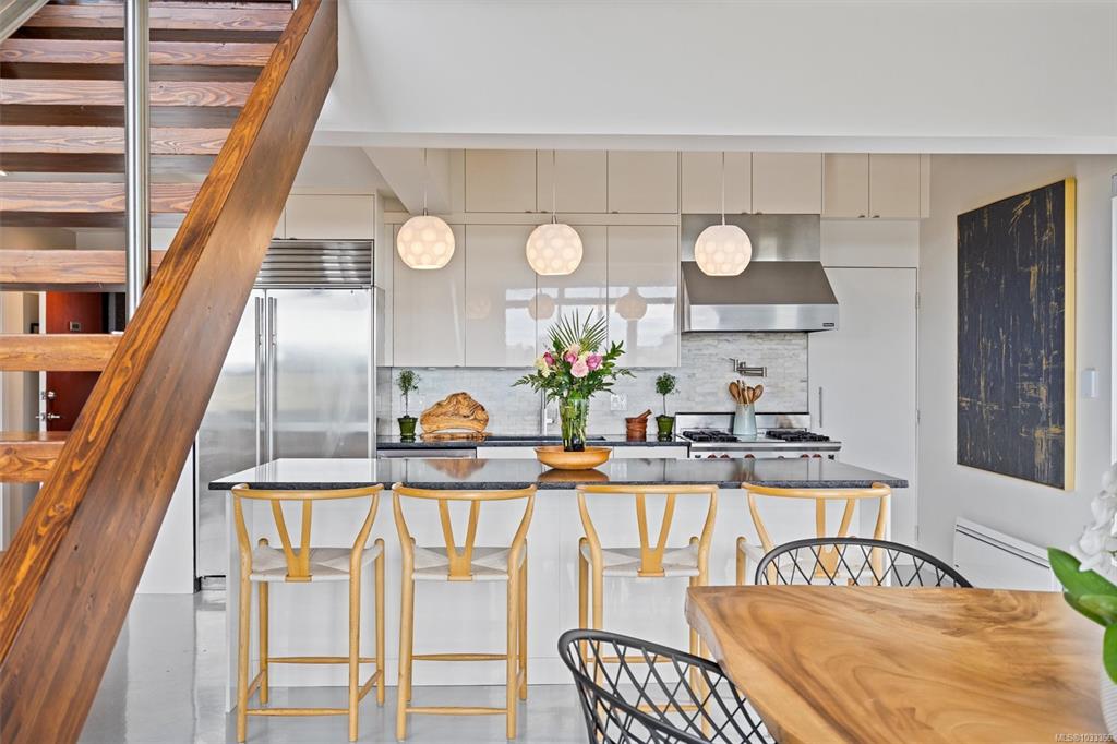 This is the kind of home that leaves a lasting impression, a stunning 2-bedroom, 2-bathroom penthouse loft located in one of Victoria's most sought-after buildings. Soaring ceilings and oversized windows fill the space with natural light, while offering spectacular views of the water, downtown skyline, and Mount Baker. The chef's kitchen is thoughtfully designed with premium finishes and appliances, perfect for quiet weeknight dinners or weekend entertaining. Upstairs, the primary suite is a genuine retreat...