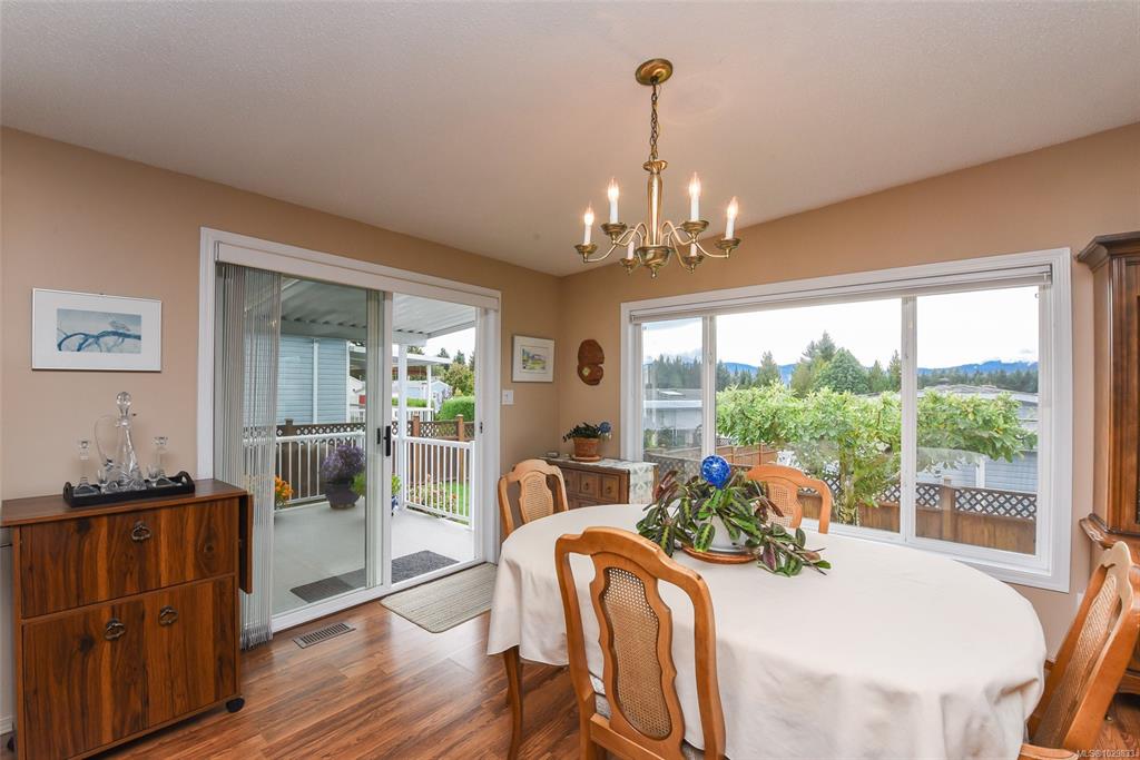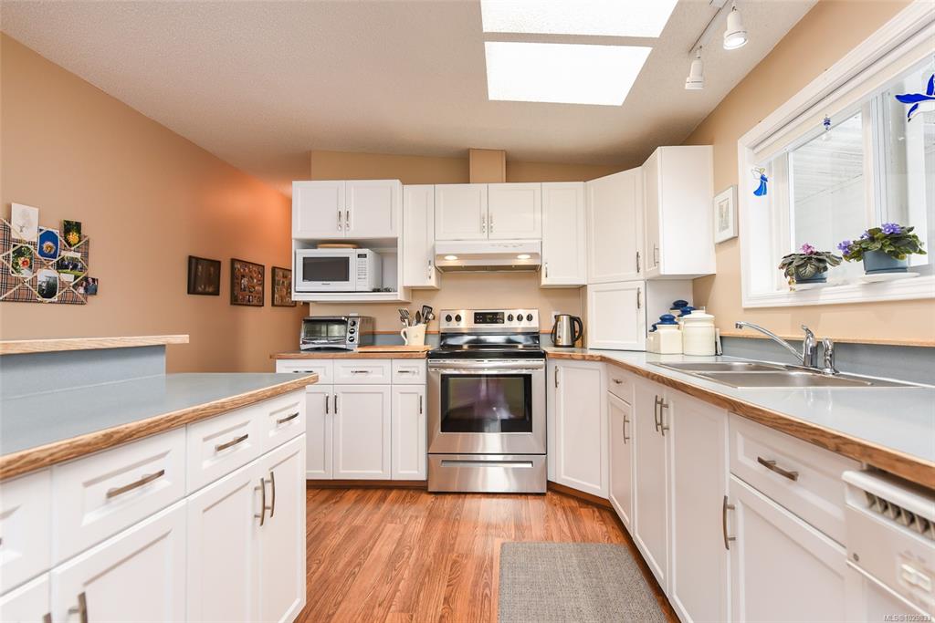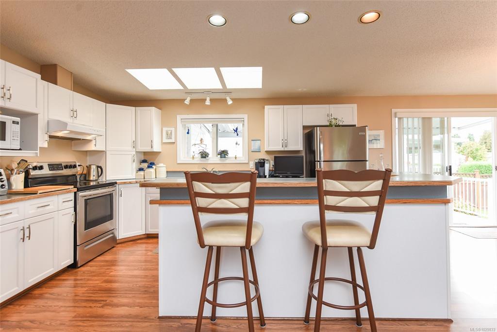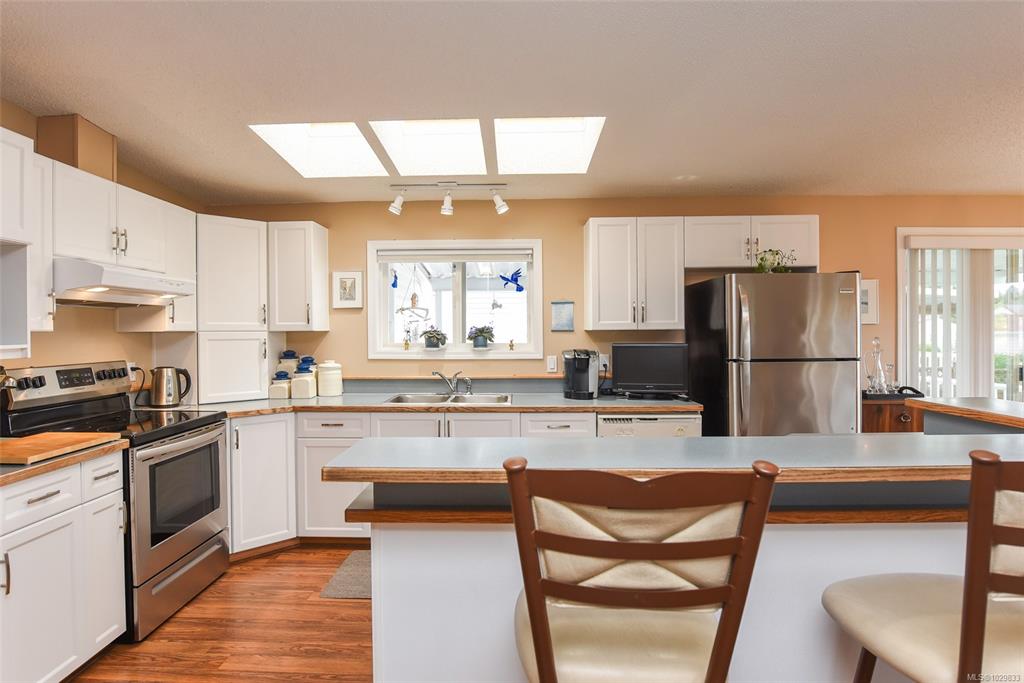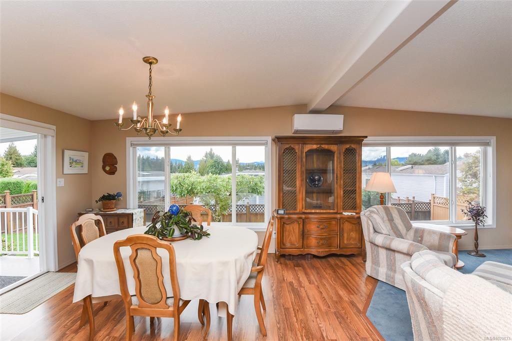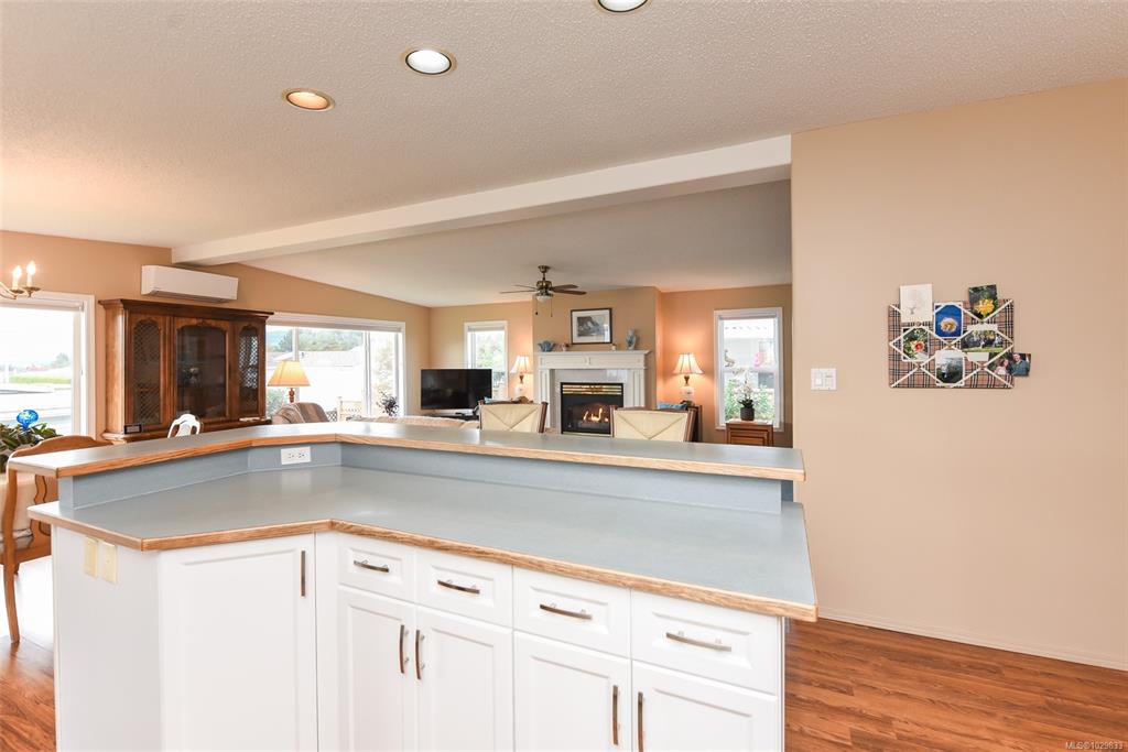 The only one with views of the Comox Glacier & Beaufort Range like this. A custom-upgraded home that is flooded with natural light from skylights and oversized windows, along with a gas fireplace, vaulted ceilings and ample counter space, this home feels spacious & inviting. Step out to a 300sqft covered deck and fully fenced yard with producing pear & apple trees. Upgrades and extras include Poly-B replaced, heat pump (grandfathered in under new bylaw), covered carport, workshop, concrete wrap-around walkw...