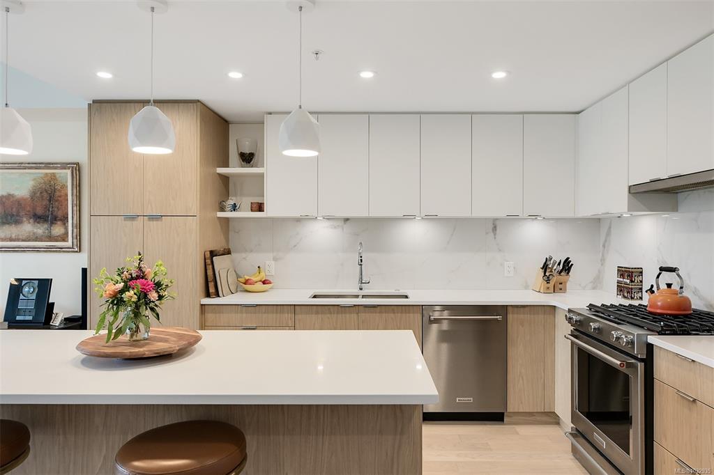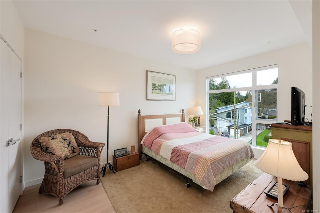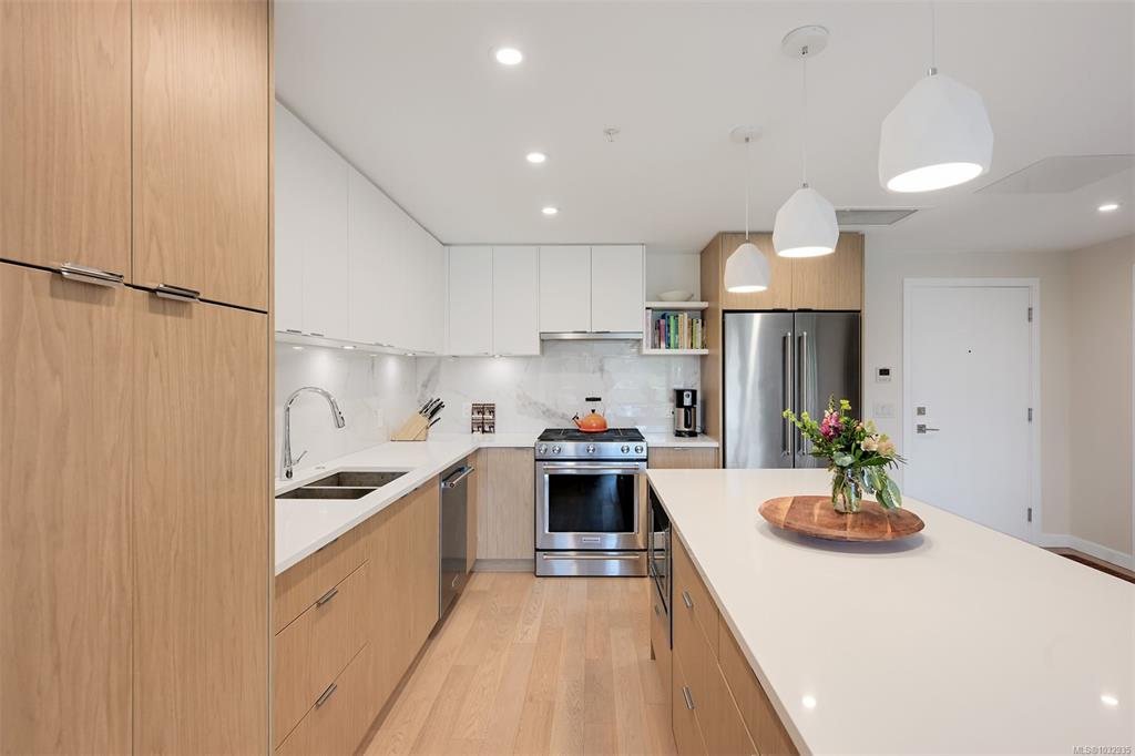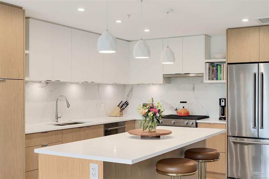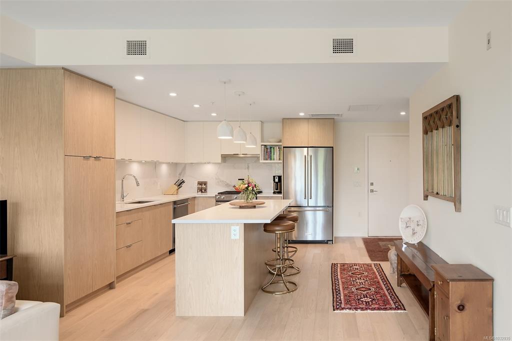 Enjoy seaside living at the Haro in sought after Cordova Bay! This beautiful bright modern 2 bedroom and 2 bathroom condo features high quality finishing throughout, including gorgeous hardwood flooring, an entertainment style kitchen with a large island, gas stove, quartz counters, stainless steel appliances, electric blinds, and heated tile flooring in the bathrooms. The spacious balcony off the living room offers lovely ocean views and room to relax or BBQ. There's secure underground parking with an EV c...