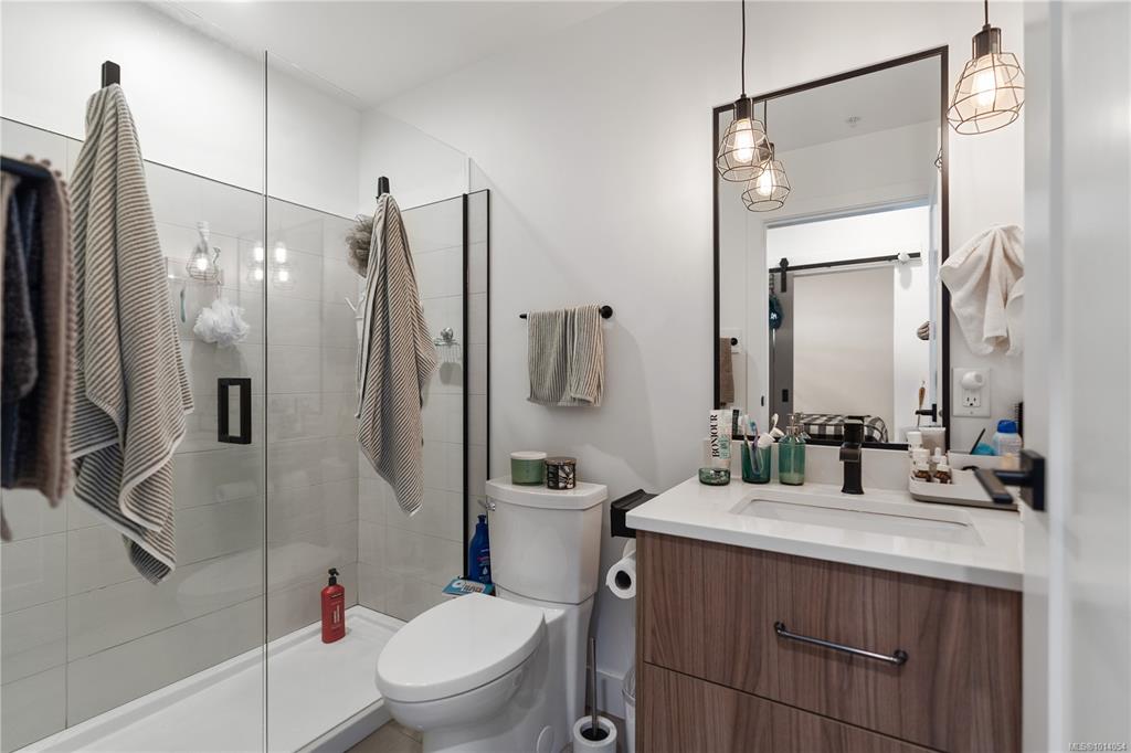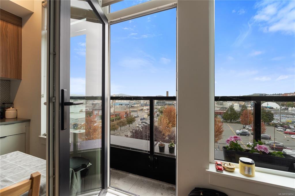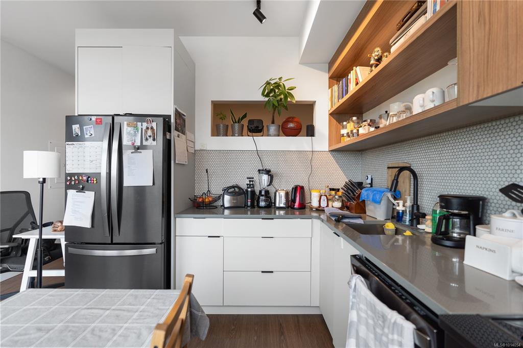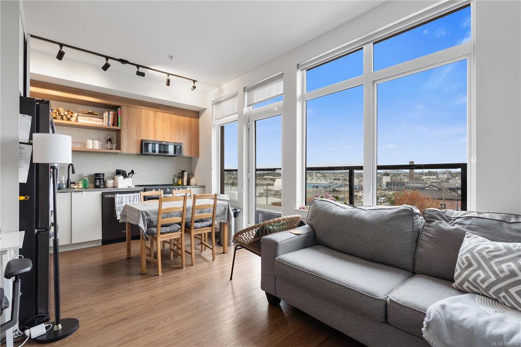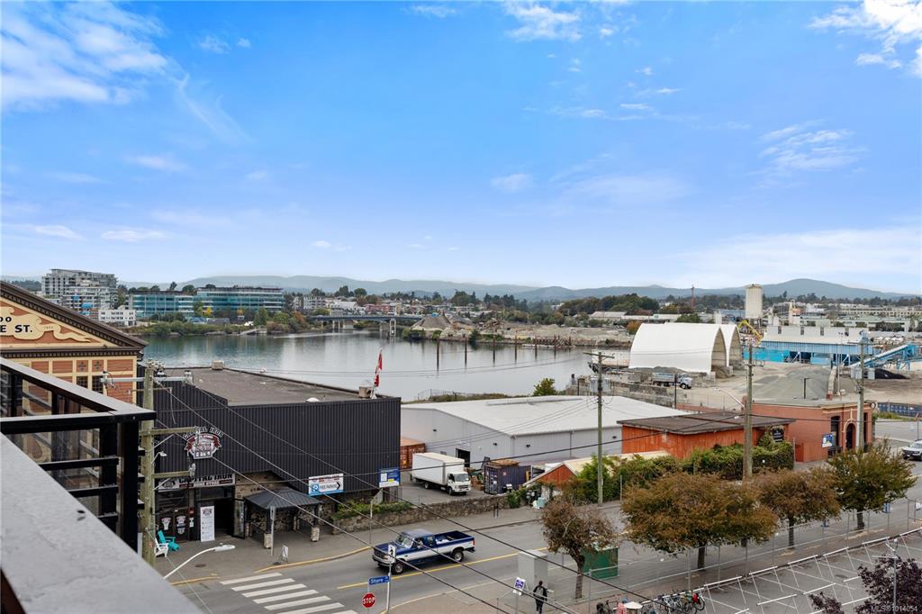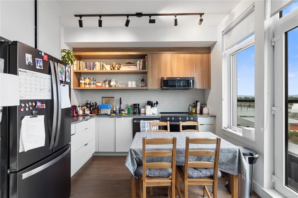 Welcome to Ironworks, a modern condo situated in the heart of Victoria's vibrant and colourful Old Town district. This top-floor suite offers stunning views of the Gorge waterway and features open-concept living and dining space that flows into a contemporary kitchen. The kitchen boasts premium appliances, quartz countertops, a unique backsplash, dual-tone cabinetry, and open shelving. Inside, you'll find convenient in-suite laundry and a beautiful 3-piece bathroom with sleek, matte black fixtures and a rai...