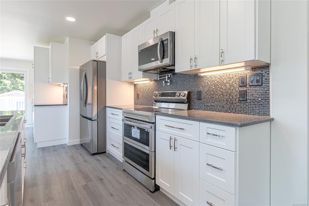 Discover this fully renovated 5-bedroom, 3-bathroom home located at 5350 Metral Drive in Nanaimo. The main residence offers 3 bedrooms, including a primary bedroom with ensuite, access to the sundeck and a kitchen featuring a prep area with an extra sink. An electric fireplace adds charm to the living area, while a spacious sundeck expands your entertaining space. The lower-level suite includes 2 bedrooms, 1 bathroom, and a separate garage space, ideal for extended families or rental income. Recent upgrades...