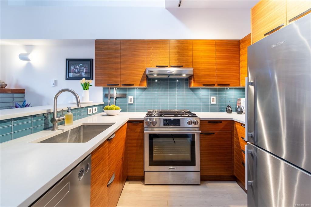 COOLEST LOFT IN YYJ! Experience urban living at The Vogue, a premier steel & concrete heritage conversion in Old Town Victoria. Luxury Heritage Loft featuring 21' ceilings, exposed old-growth beams, brick feature wall & floor-to-ceiling windows w Hunter Douglas remote sheers & blackouts ($7,500 value). Gourmet kitchen w custom cabinetry, stone counter, glass subway tile backsplash & high-end Euro appliances—Bosch D/W ($2,500), Blomberg gas stove ($4,000), Blomberg fridge ($3,000), premium sink & fixtures ($...