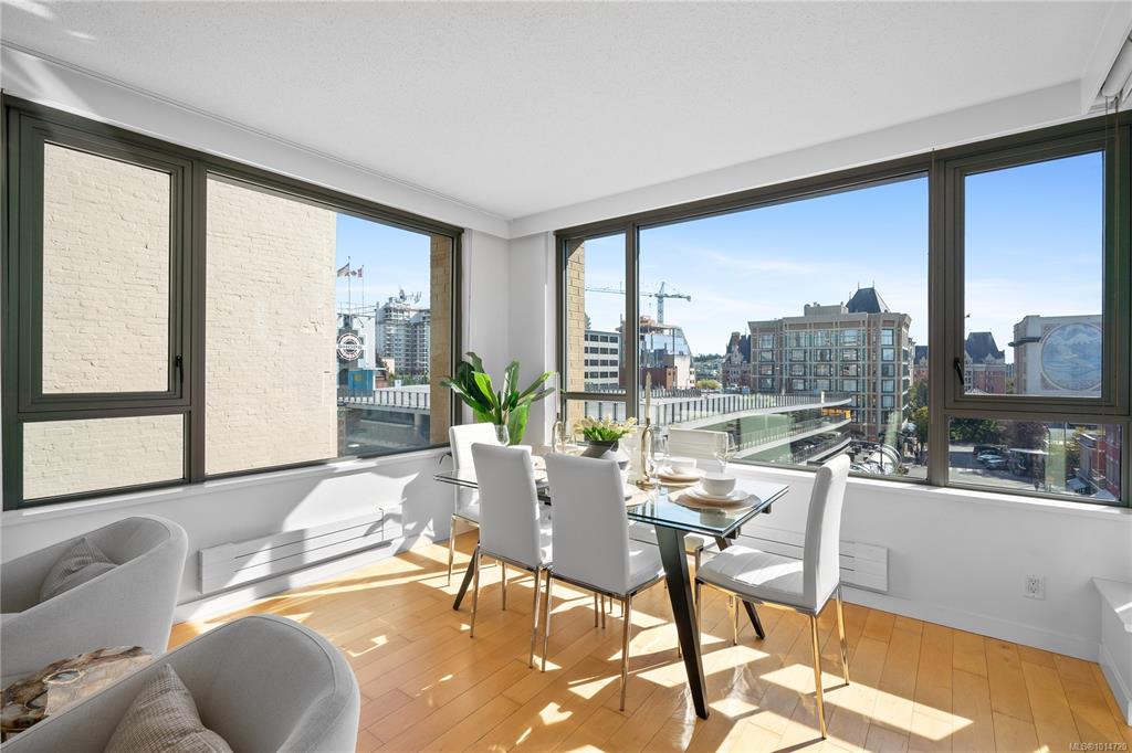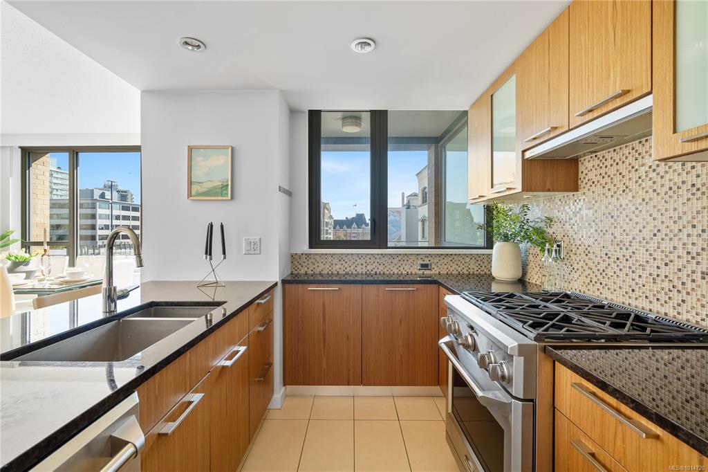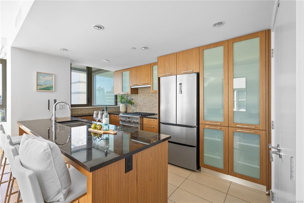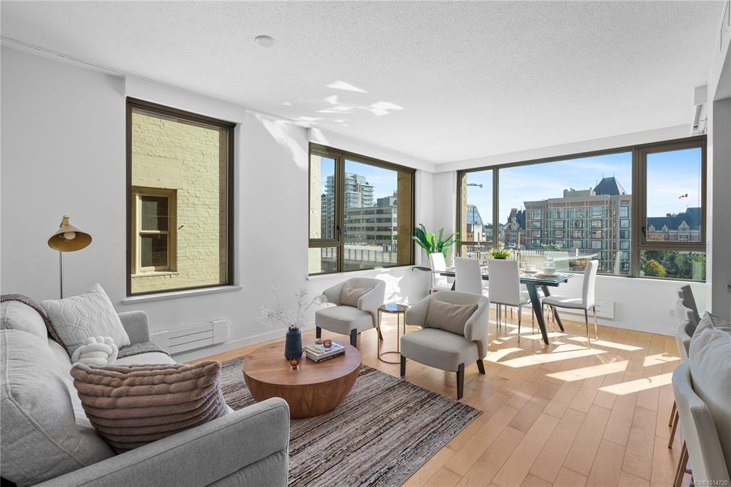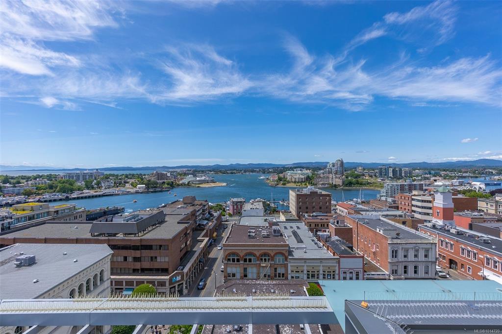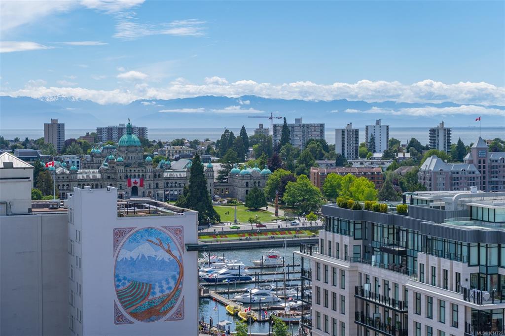 City, mountain, and harbour views await from this stunning 2-bed, 2-bath condo at The Sovereign in the heart of downtown Victoria. With nearly 1,000 sq ft, this home offers luxury, functionality and an unbeatable location, just steps from the Inner Harbour, shops, restaurants, and cultural landmarks. The bright, open layout features a balcony, office nook, and a gourmet kitchen with stainless steel appliances, gas range, stone counters, and a peninsula for four. The primary suite has a walk-in closet and a ...