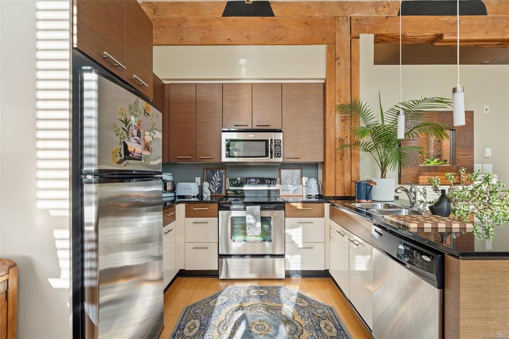Experience the best of Downtown Victoria living. Set in a boutique building, The Monaco, this chic & sophisticated 1-bed, 1-bath condo offers modern conveniences & effortless charm. High ceilings & oversized windows frame the unit, flooding the space with natural light. The open-concept living space is anchored by rich natural brick & the warmth of wood floors. The gas fireplace creates an inviting ambiance—a true slice of peace in the city's core.The well-appointed kitchen includes stainless steel applianc...