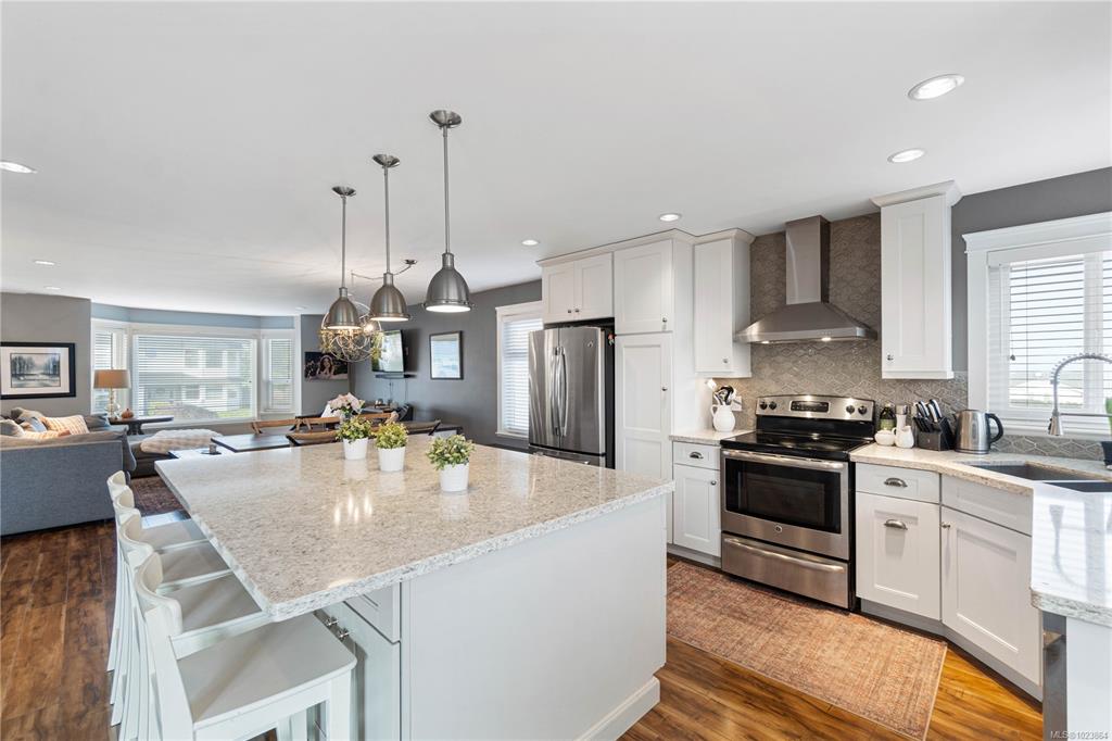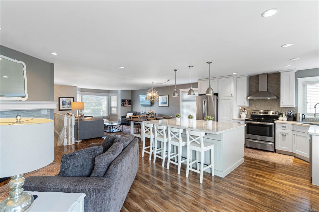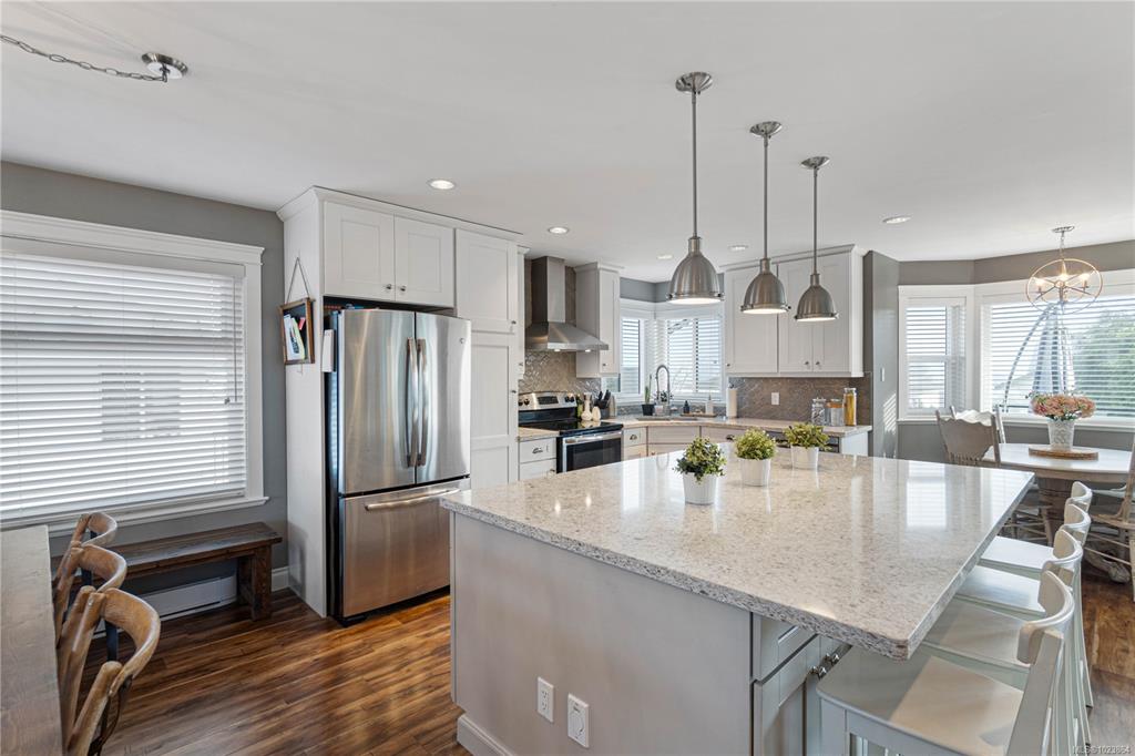 Bright and well-maintained 5-bedroom, 3-bathroom home offering 2,566 sq ft of functional living space on a 7,030 sq ft lot in a desirable North Nanaimo neighbourhood. Ground-level entry with main living up provides an excellent family-friendly layout and strong natural light throughout. The kitchen is well designed for everyday use and hosting, featuring an extra-large island, bar seating and an eating nook flooded with natural light. Two gas fireplaces deliver efficient heating and added comfort on both le...