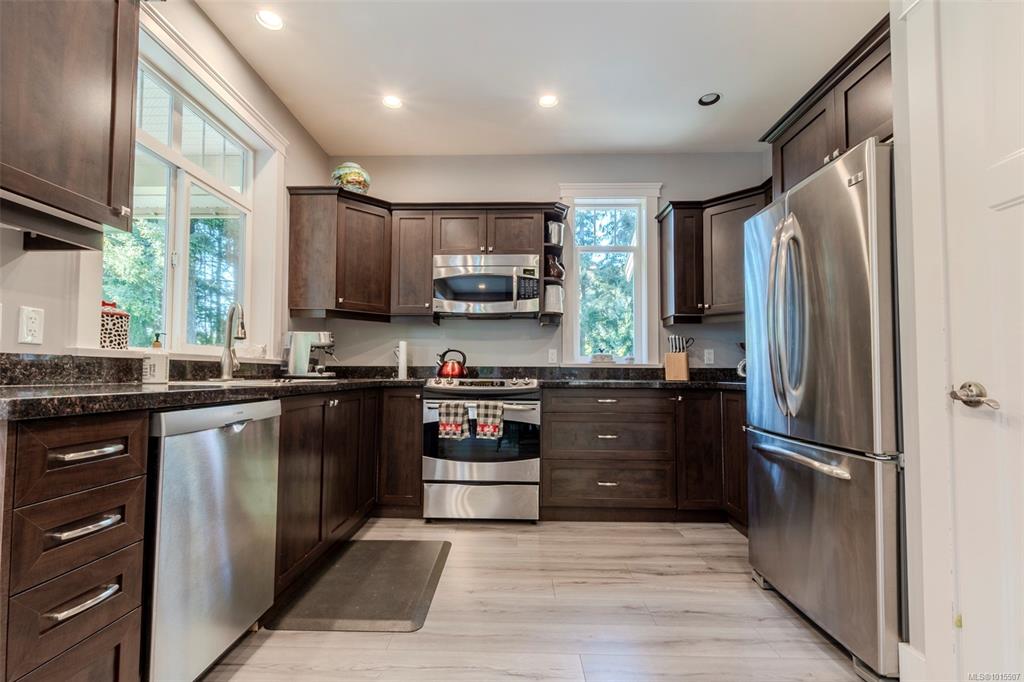 Tucked away on a private 3-acre lot in beautiful Maple Bay, this 3-bedroom, 3-bathroom home plus a 1-bedroom suite offers comfort, flexibility, and outdoor lifestyle. The main level features a bright, open-concept layout where the kitchen, dining, and living areas flow together seamlessly. The living room is warm and welcoming with built-in shelving and a cozy woodstove set in a striking stone surround. The spacious primary bedroom is located on the main floor and includes a full ensuite with a soaker tub a...