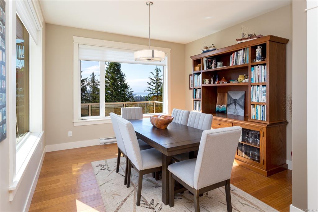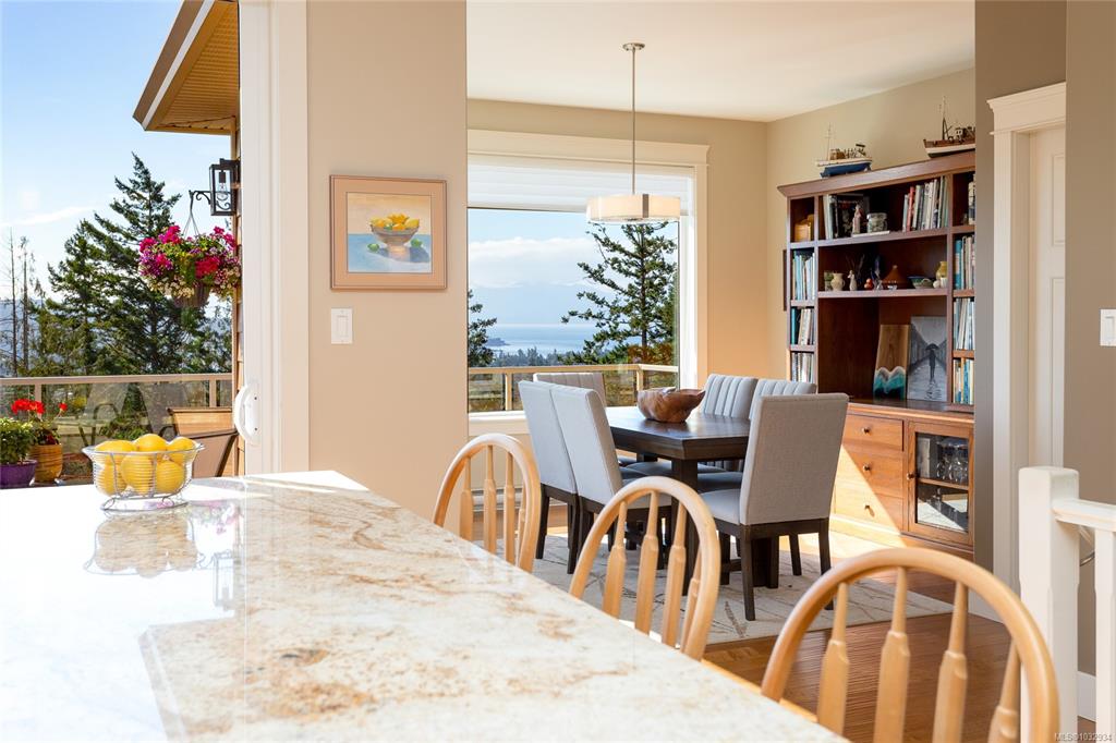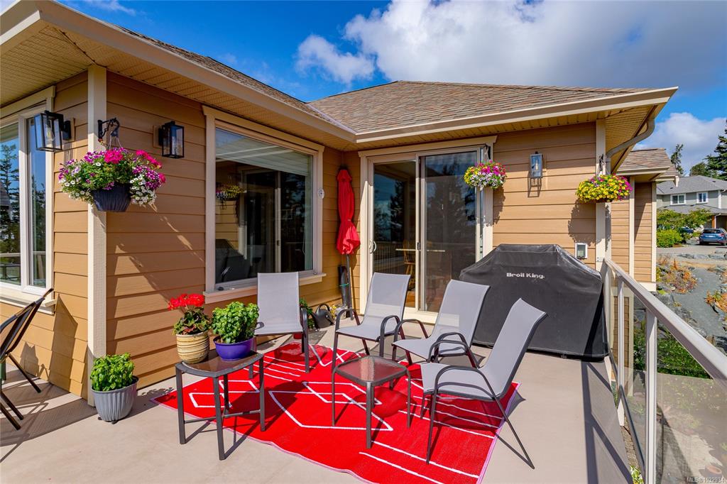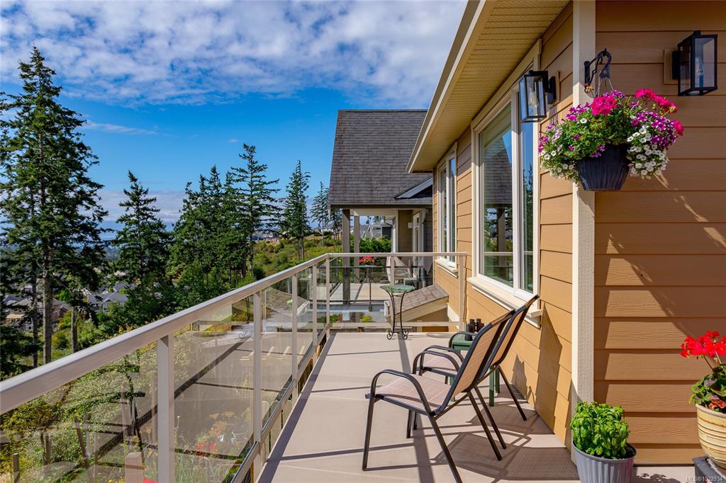 Welcome to this beautifully crafted 3-bed, 3-bath custom home located at the end of a quiet cul-de-sac in Stone Ridge Estates. Surrounded by lush forests, green belt & parkland, enjoy stunning views of the Juan de Fuca Strait, Sooke Basin & Sooke Hills from nearly 2,400 sq ft of thoughtfully designed living space. The main level features true one-level living with a spacious kitchen, dining, living & primary suite, all with engineered hardwood & custom window coverings. The open kitchen offers granite count...
