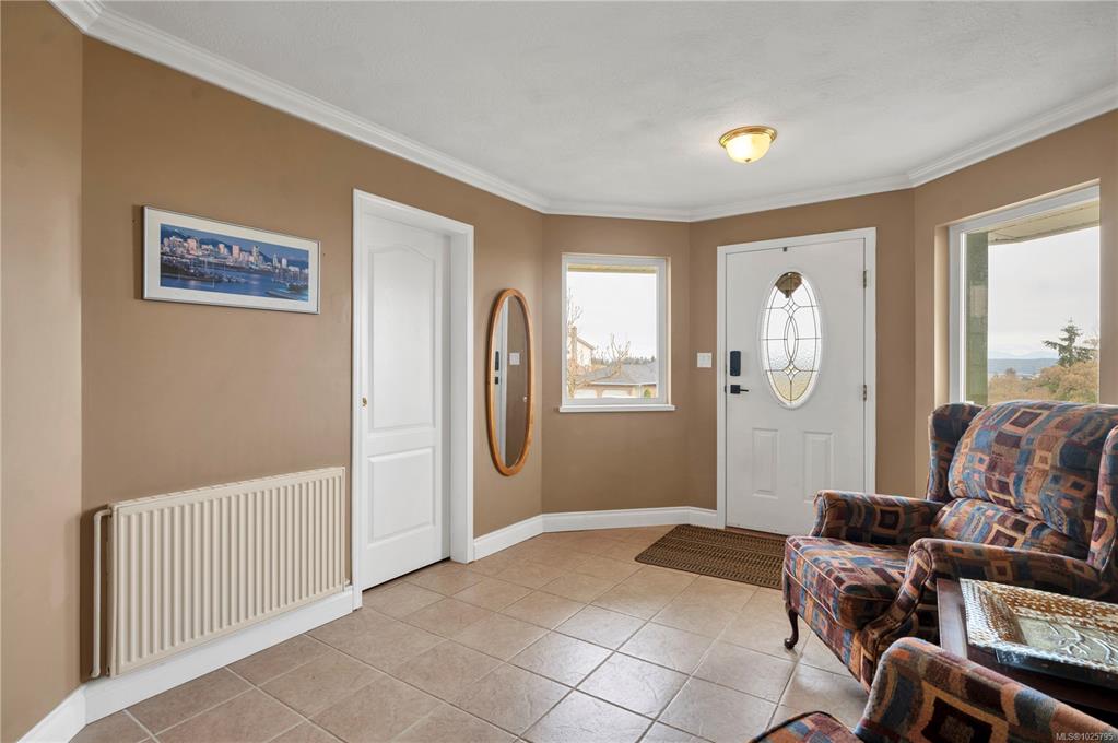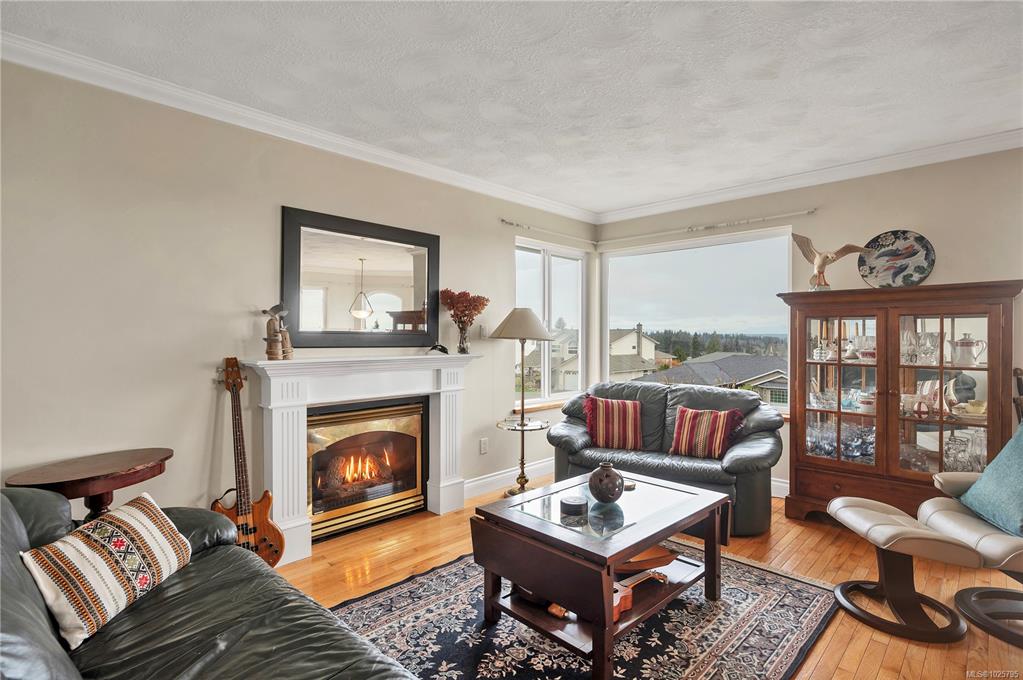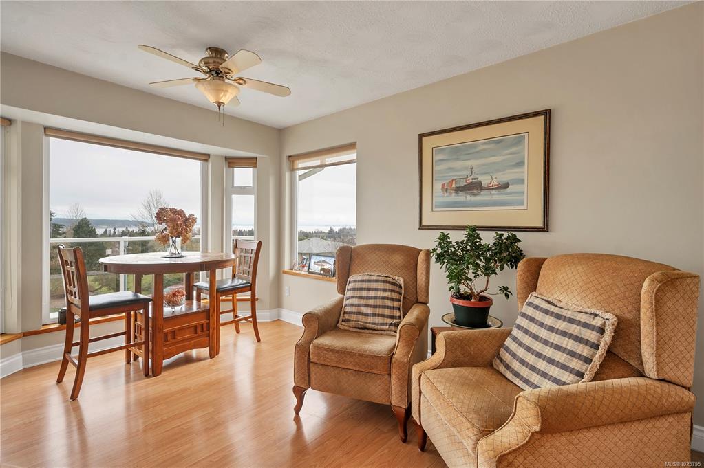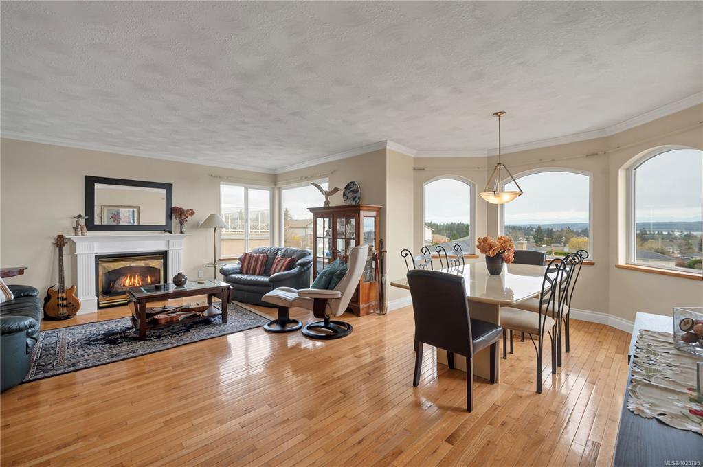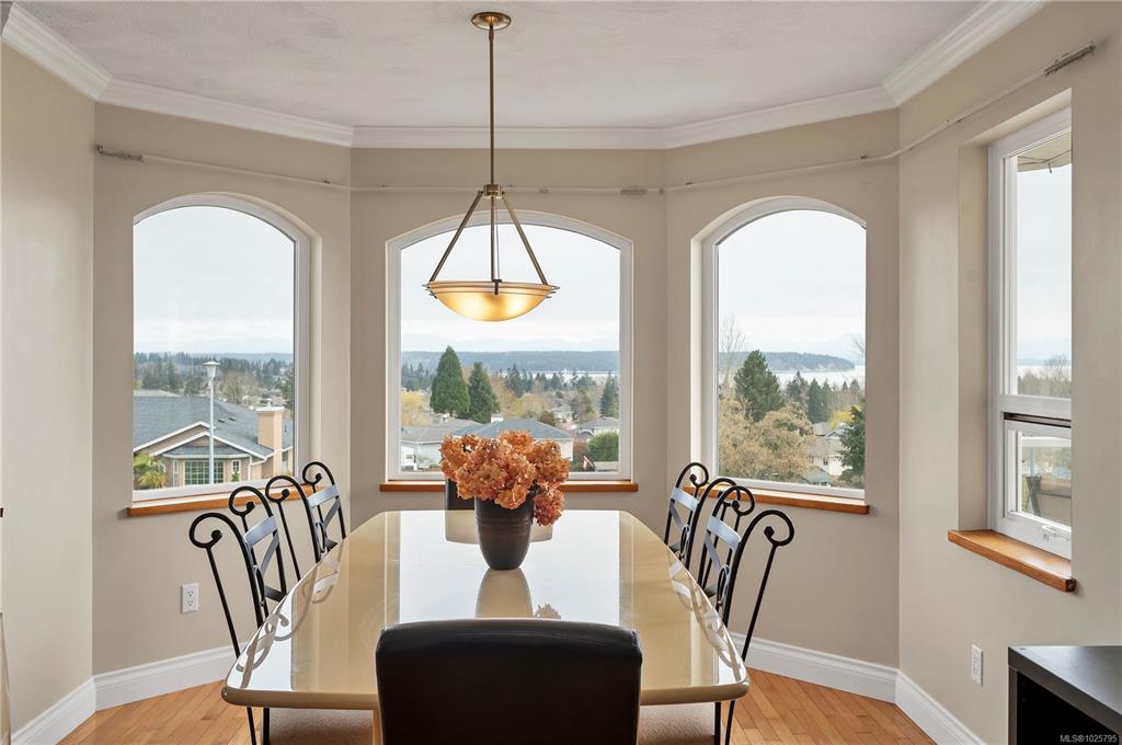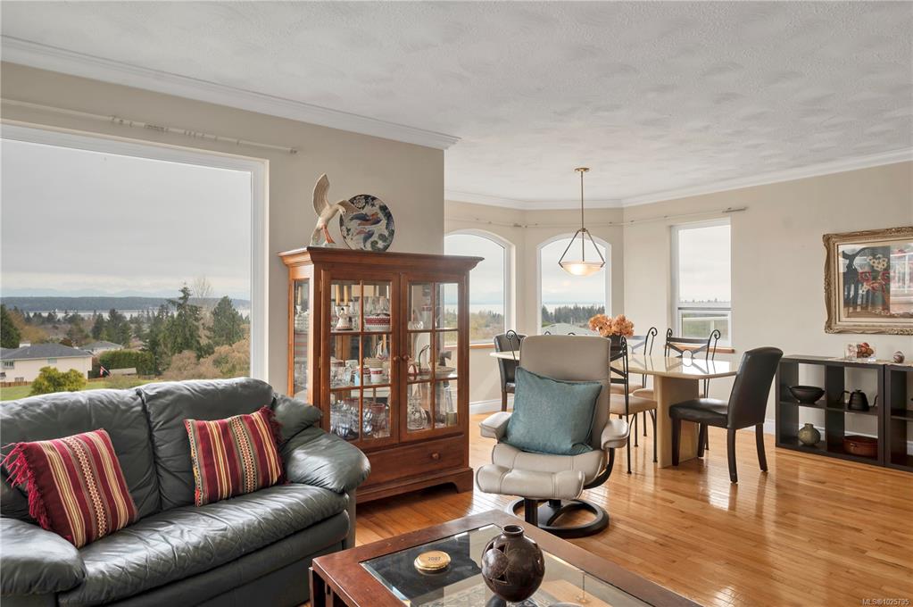 Beautifully maintained ocean view family home in a very desirable Willow Point neighbourhood. Elegant hardwood floors and cozy gas fireplace accent the formal living room and adjoining dining room, with wall to wall windows offering plenty of daylight and glorious views of the coastal mountains and Discovery Passage. The spacious kitchen has lots of cupboard space, large center island and opens to the family room with sliding door to the front deck,. Three bedrooms up including the primary bedroom with a fu...