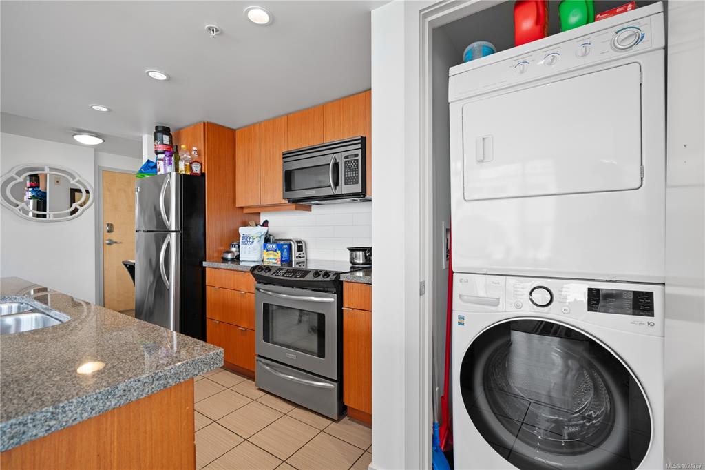 Welcome to a bright 2-bed, 1-bath condo in The Juliet, a sought-after steel and concrete building in the heart of Victoria. The floor-to-ceiling windows offer sweeping views of the city, which fill the space with natural light. The modern kitchen features ss appliances, quartz counters, a bi-level island with breakfast bar, and sleek bamboo flooring throughout. The primary bedroom includes its own access to the 4-piece bathroom. Step out onto your covered balcony, perfect for enjoying your morning coffee. T...