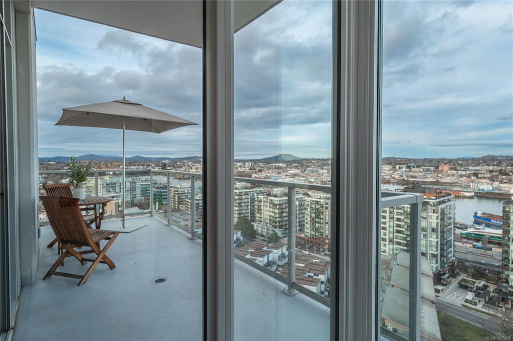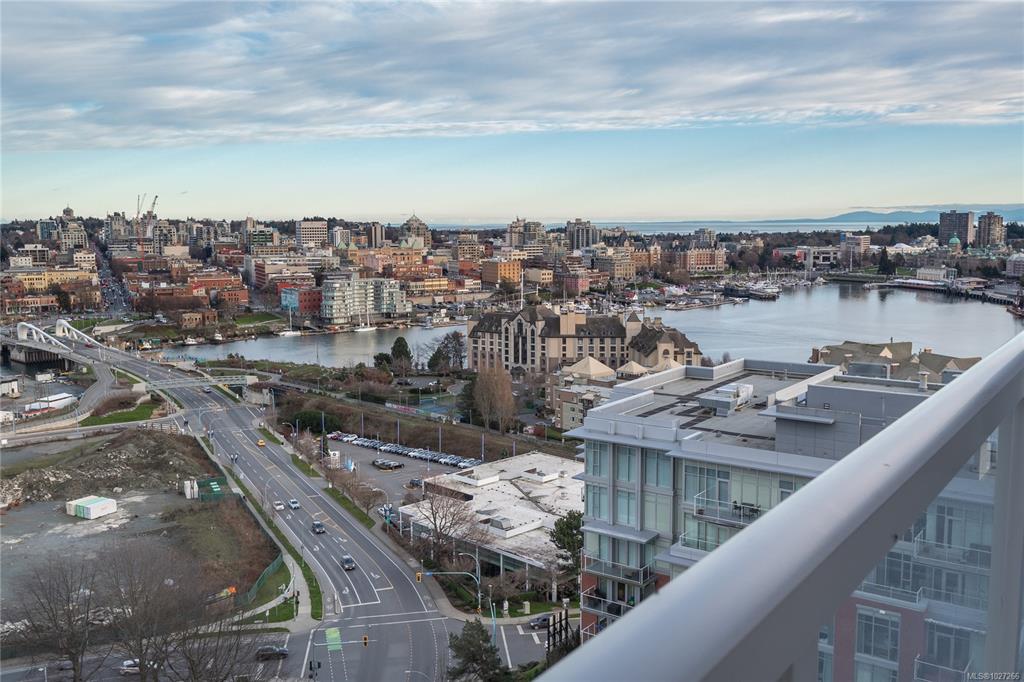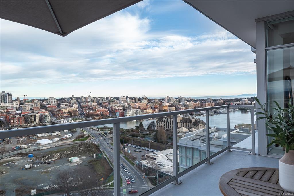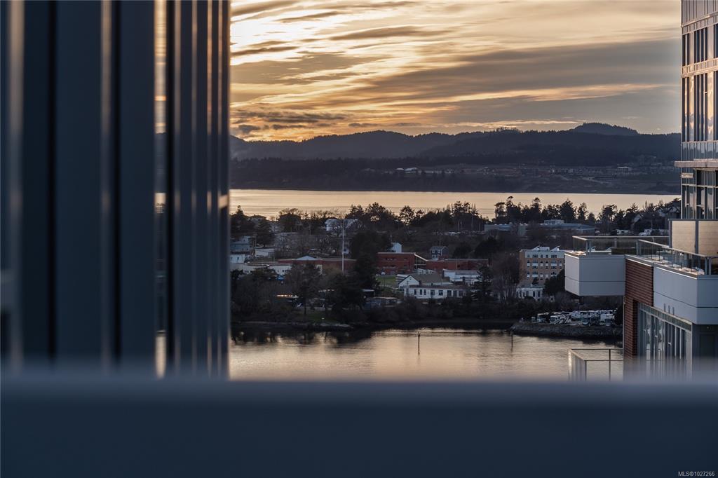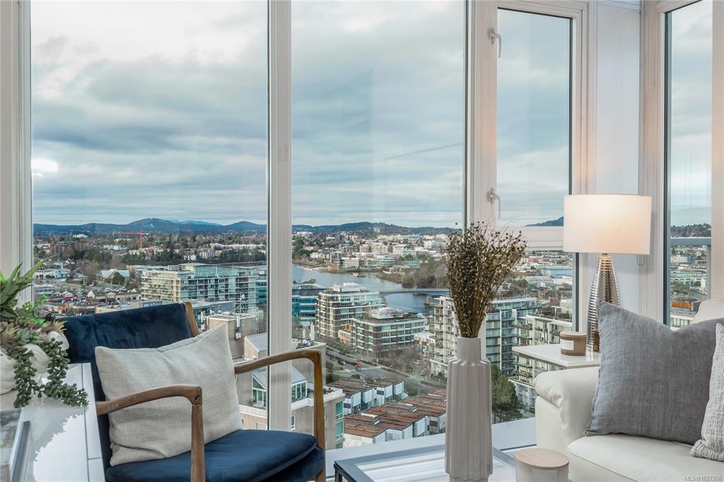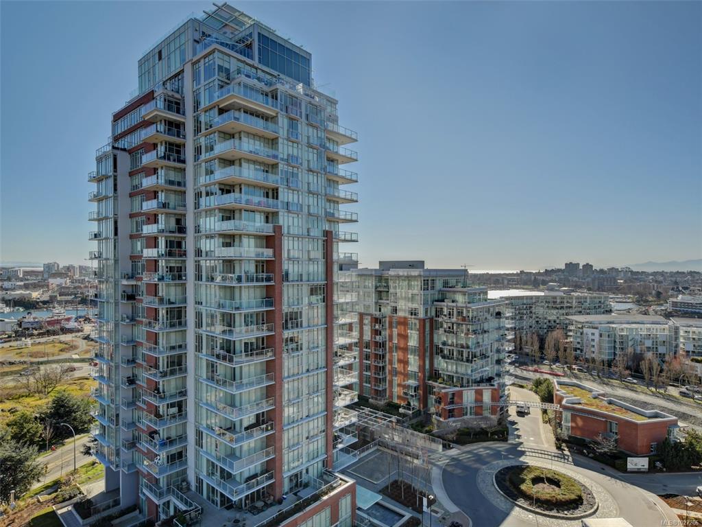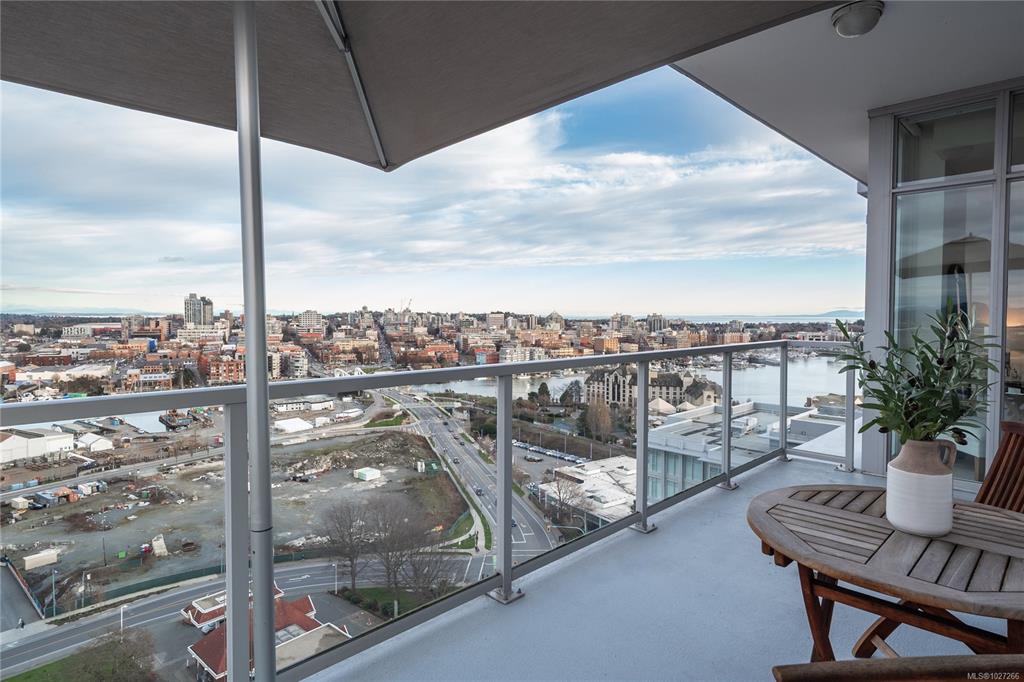 Promontory, by Bosa Properties. SUPERB VIEWS of the Sooke Hills, Upper Harbour, Inner Harbour, Ocean & Olympic Mntns from this 17th floor corner plan, offering amazing light & large balcony. EAST-NORTH-WEST exposure with floor to ceiling windows to enjoy terrific sunshine & views. Terrific sunsets! High end finishes, quality fixtures, Miele & Electrolux gas cooktop, & A/C. Enjoy seeing Mt. Baker from your primary bedroom, with over height windows. This is a steel & concrete building. Secure underground park...