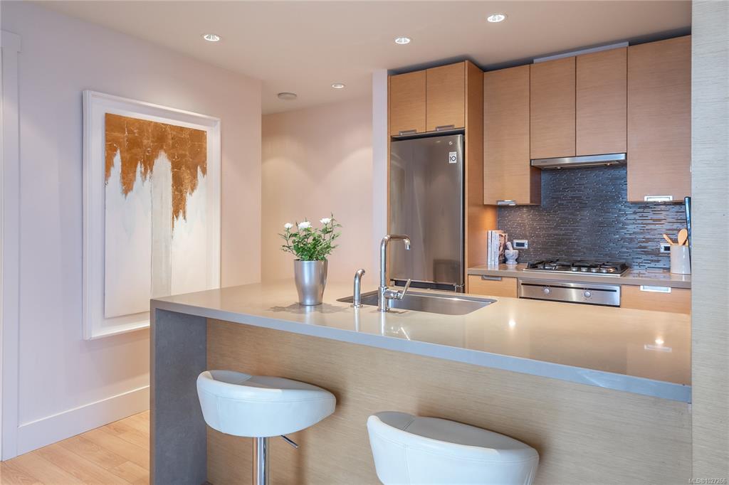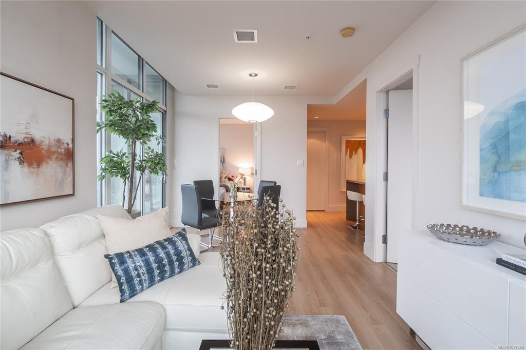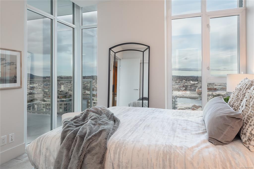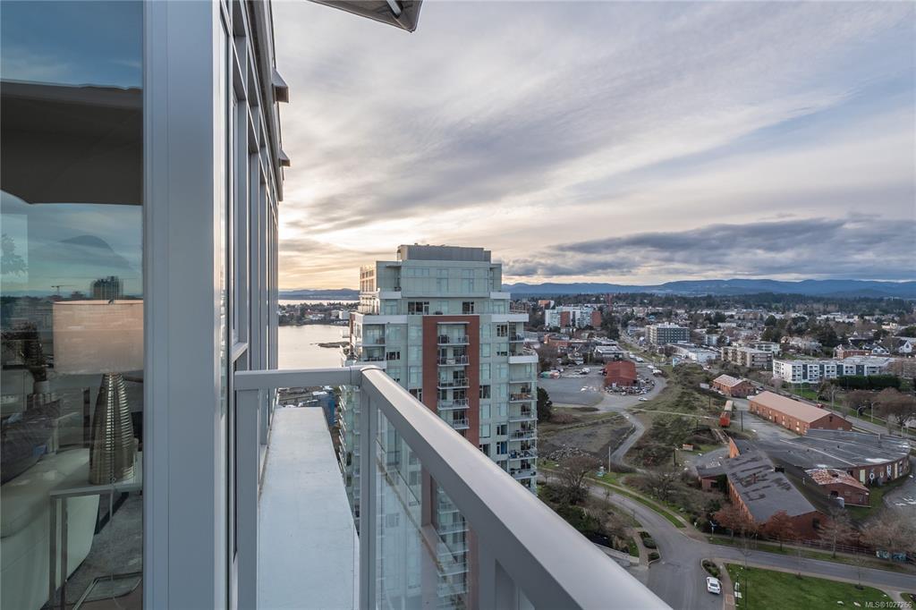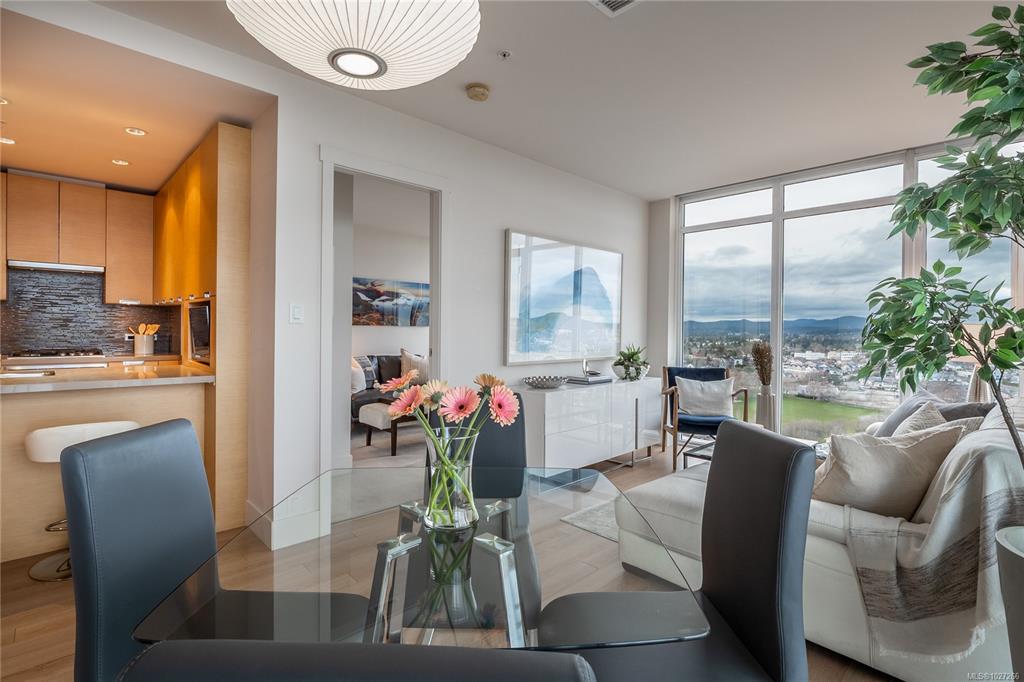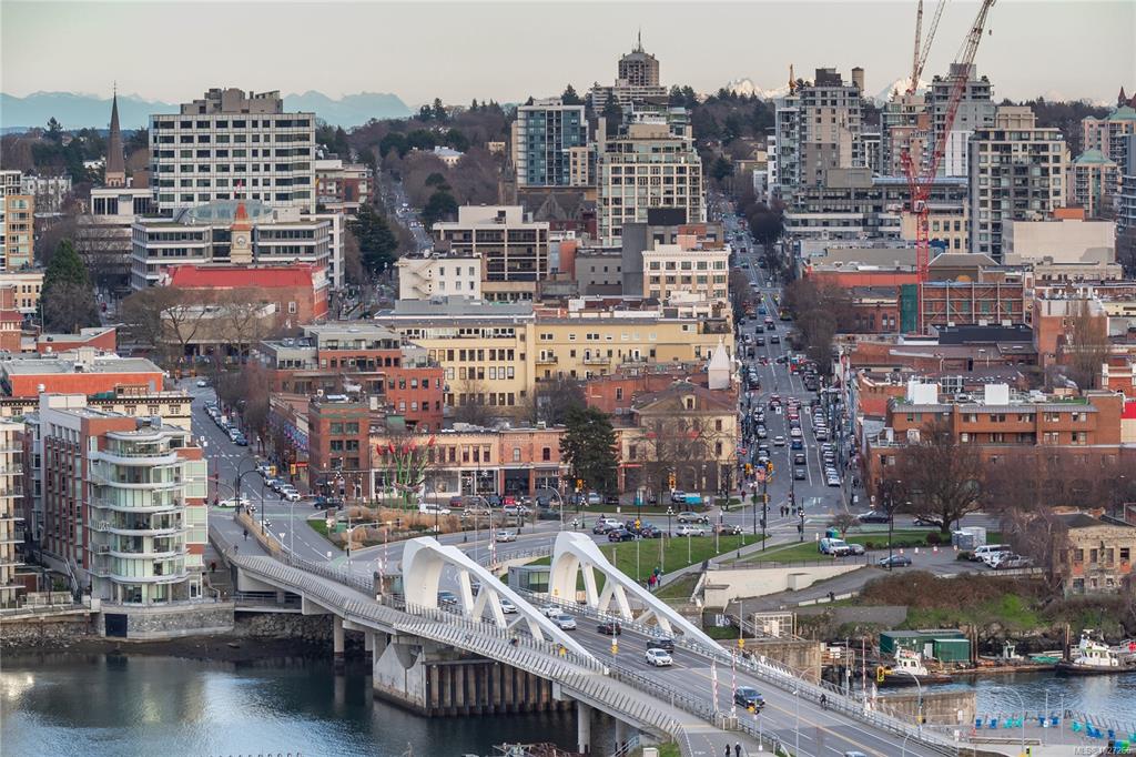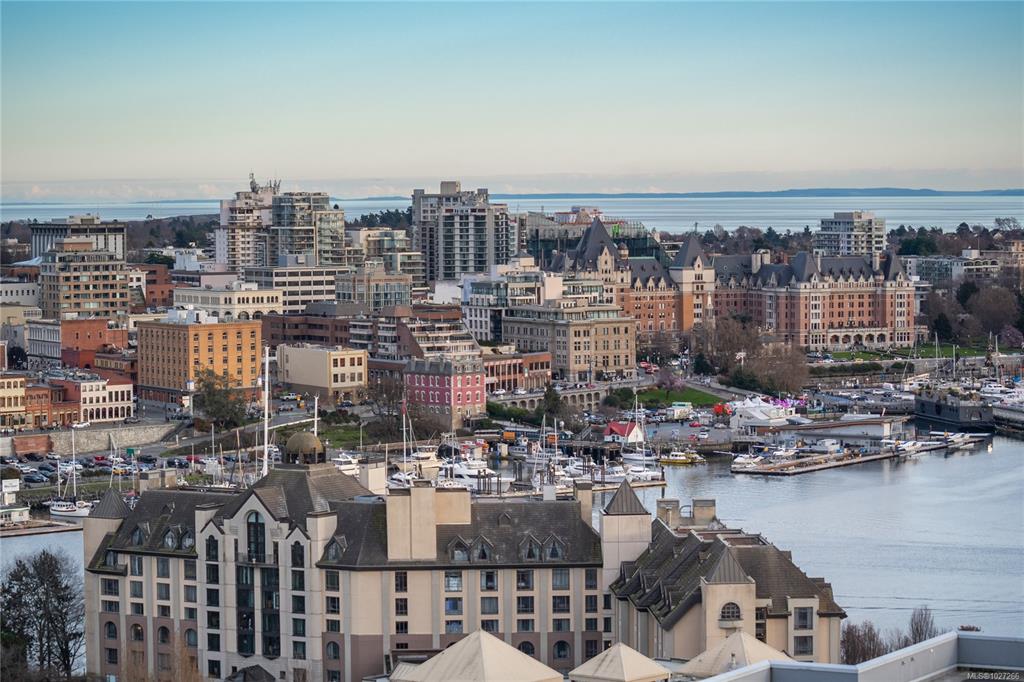 Promontory, by Bosa Properties. SUPERB VIEWS of the Sooke Hills, Upper Harbour, Inner Harbour, Ocean & Olympic Mntns from this 17th floor corner plan, offering amazing light & large balcony. EAST-NORTH-WEST exposure with floor to ceiling windows to enjoy terrific sunshine & views. Terrific sunsets! High end finishes, quality fixtures, Miele & Electrolux gas cooktop, & A/C. Enjoy seeing Mt. Baker from your primary bedroom, with over height windows. This is a steel & concrete building. Secure underground park...