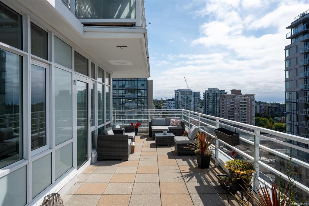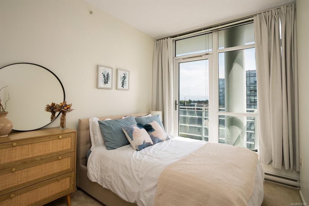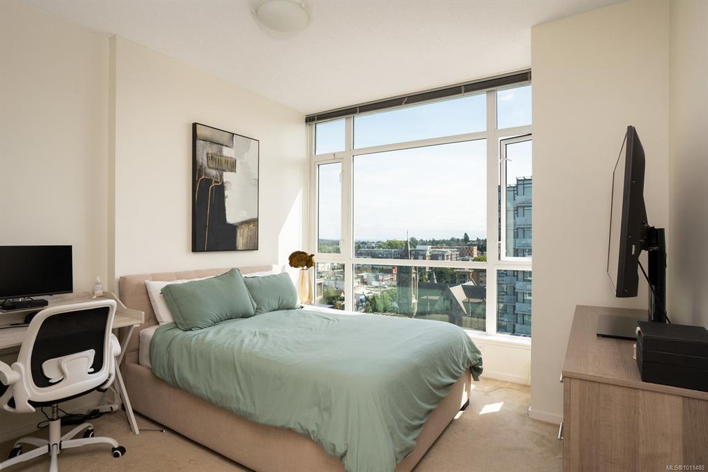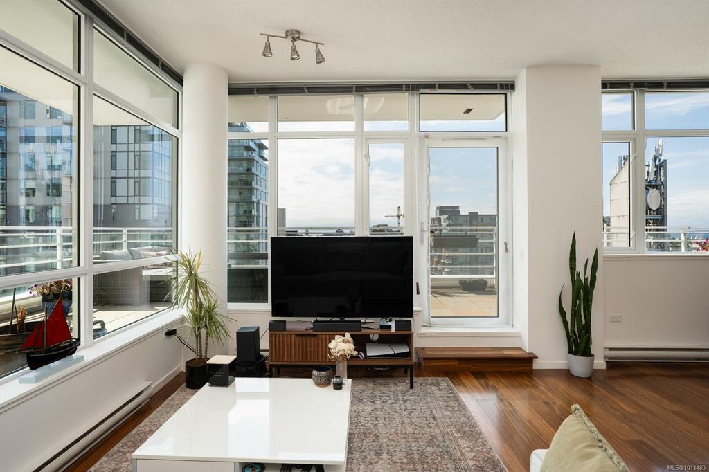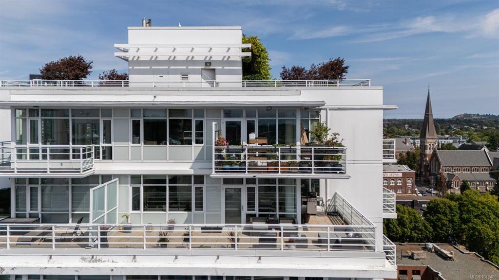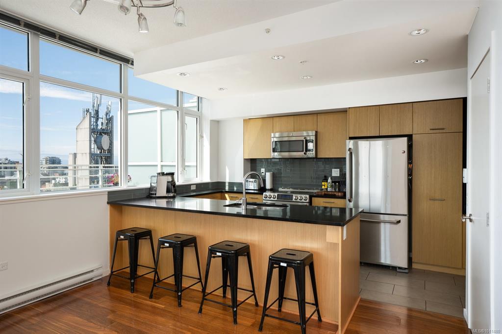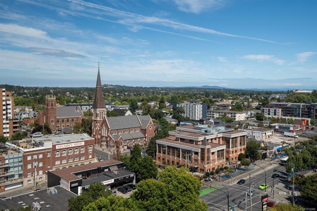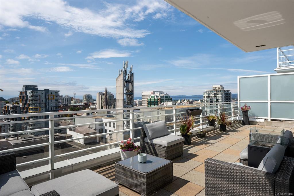 Experience elevated living in this stunning corner-unit sub penthouse in a quality steel-and-concrete building in downtown Victoria. This 14th-floor, 2-bedroom, 2-bath home offers 9-ft ceilings, floor-to-ceiling windows & sweeping views of downtown, the Strait of Juan de Fuca & the Olympic Peninsula. The chef’s kitchen features quartz countertops, stainless steel appliances, a glass tile backsplash, a generous pantry & built-in desk/drink station. The primary suite is a spa-like retreat with a walk-in show...